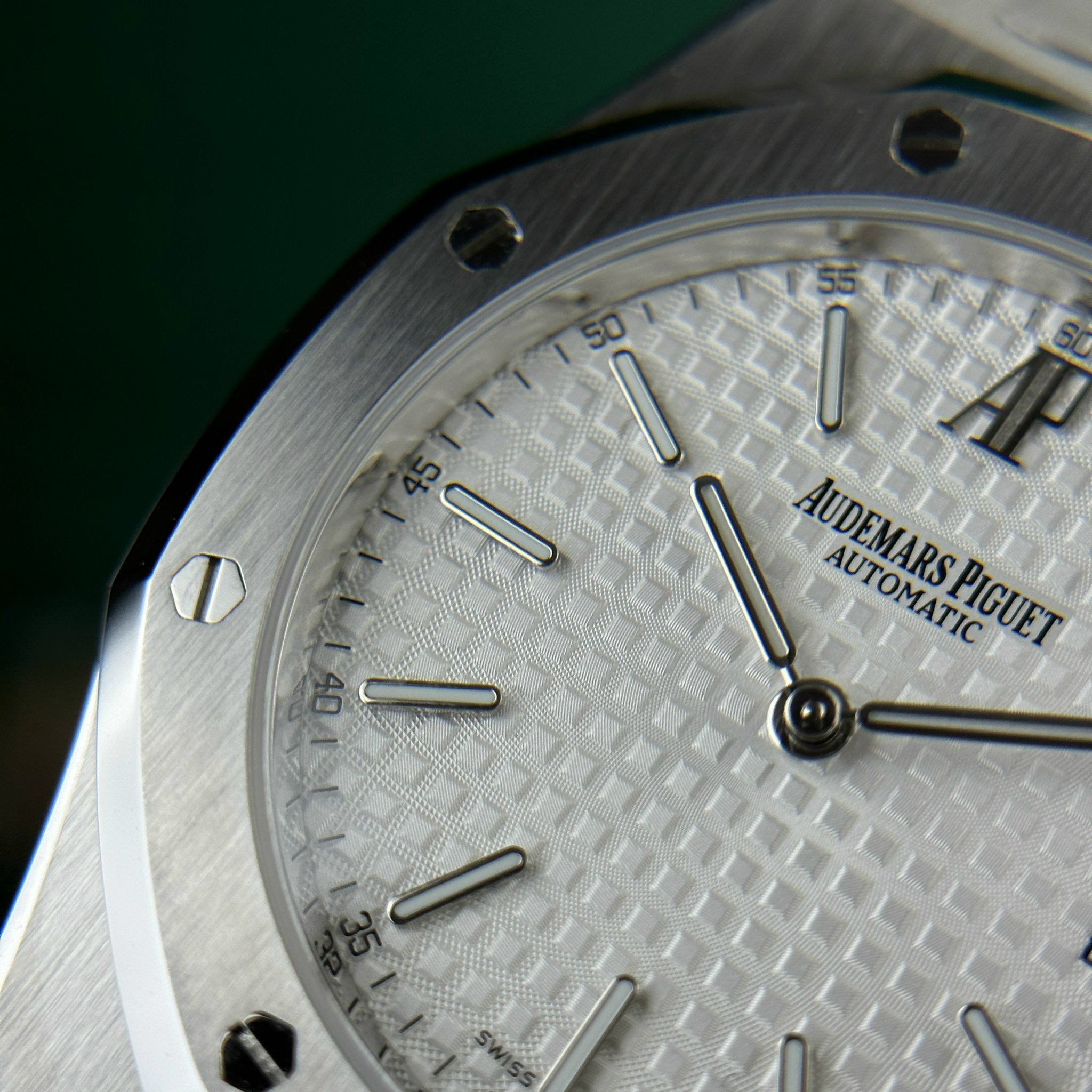 Traditionally, the case surface is finished using a brushing technique, combined with polished chamfered edges, creating a unique contrast and the distinctive beauty of the Royal Oak line. The bezel retains its iconic octagonal design, featuring hexagonal screws.