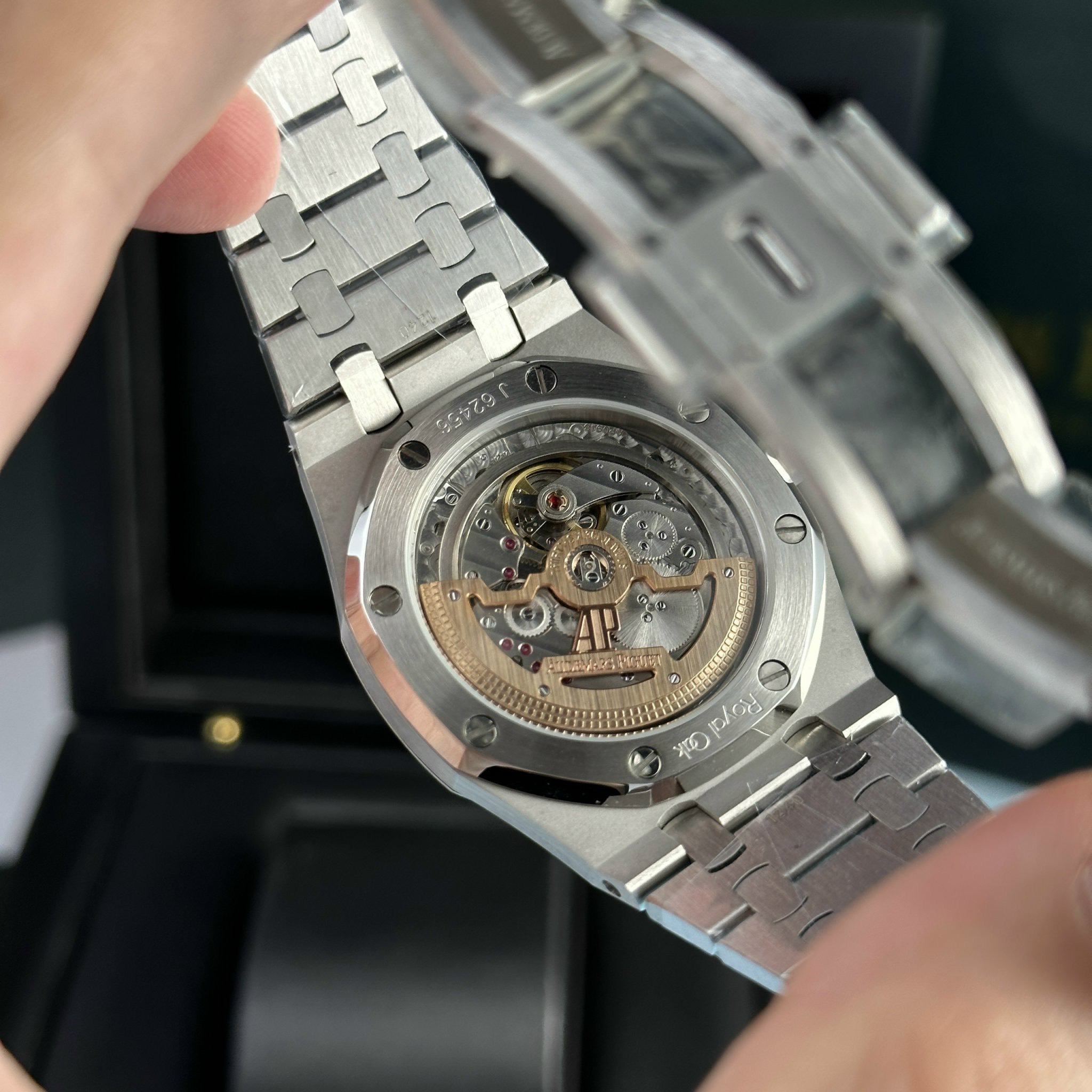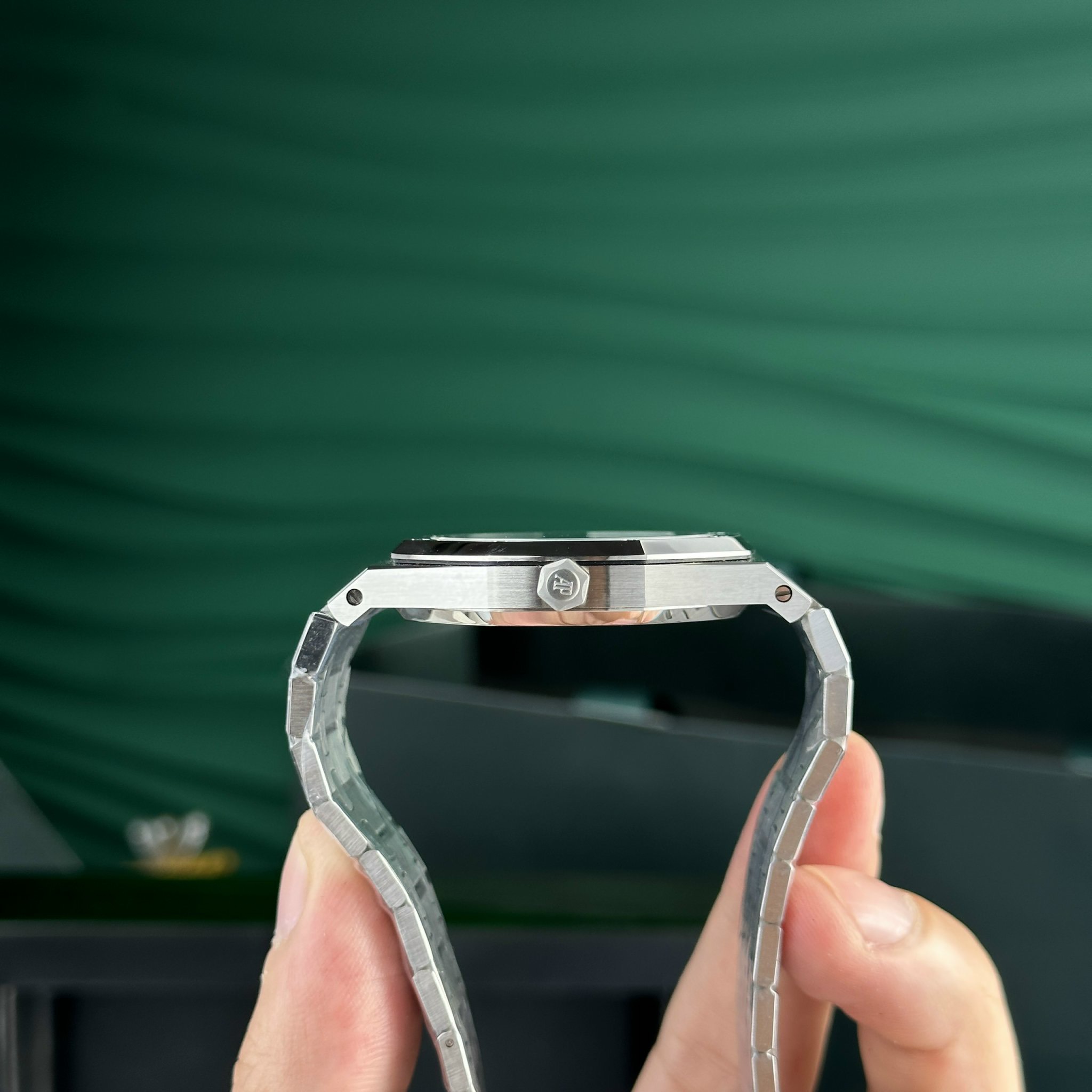 The Royal Oak’s metal bracelet is completed to the finest detail. Each link is meticulously crafted, including edges not visible from the outside. The bracelet tapers from the lugs to the clasp, showcasing the design finesse by the genius Gerald Genta.
