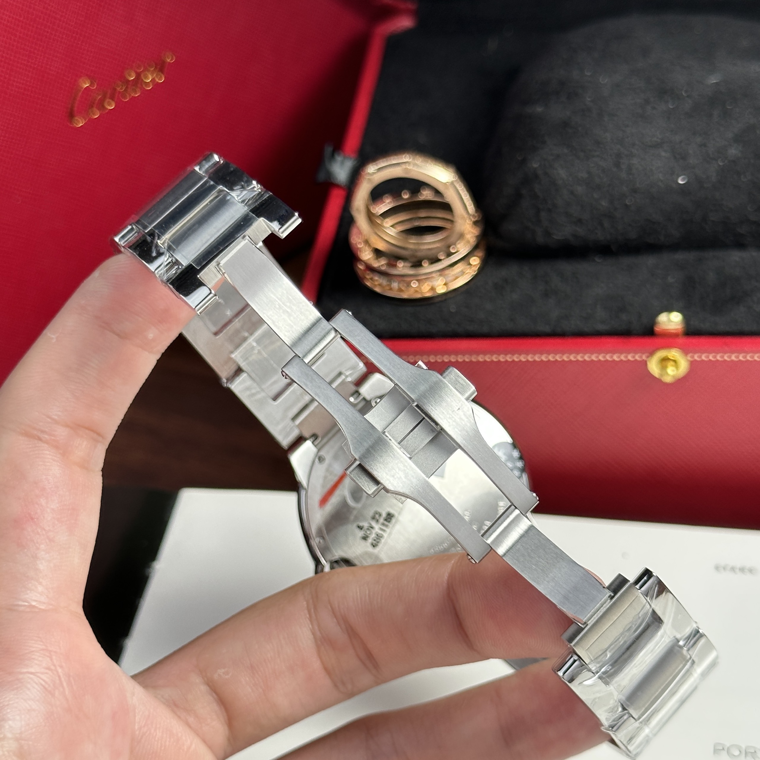 Like a ball entirely made of steel, the Cartier W69012Z4 stands out with its bright silver hue on the wrist, embodying a timeless classic beauty. This Replica watch features a blue stone-set crown, encased in a thin steel layer, showcasing the brand’s masterful gem-setting skills. Unlike many other versions with an externally mounted crown, the manufacturer has encased this component in an outer steel ring, creating a unique convex curve.