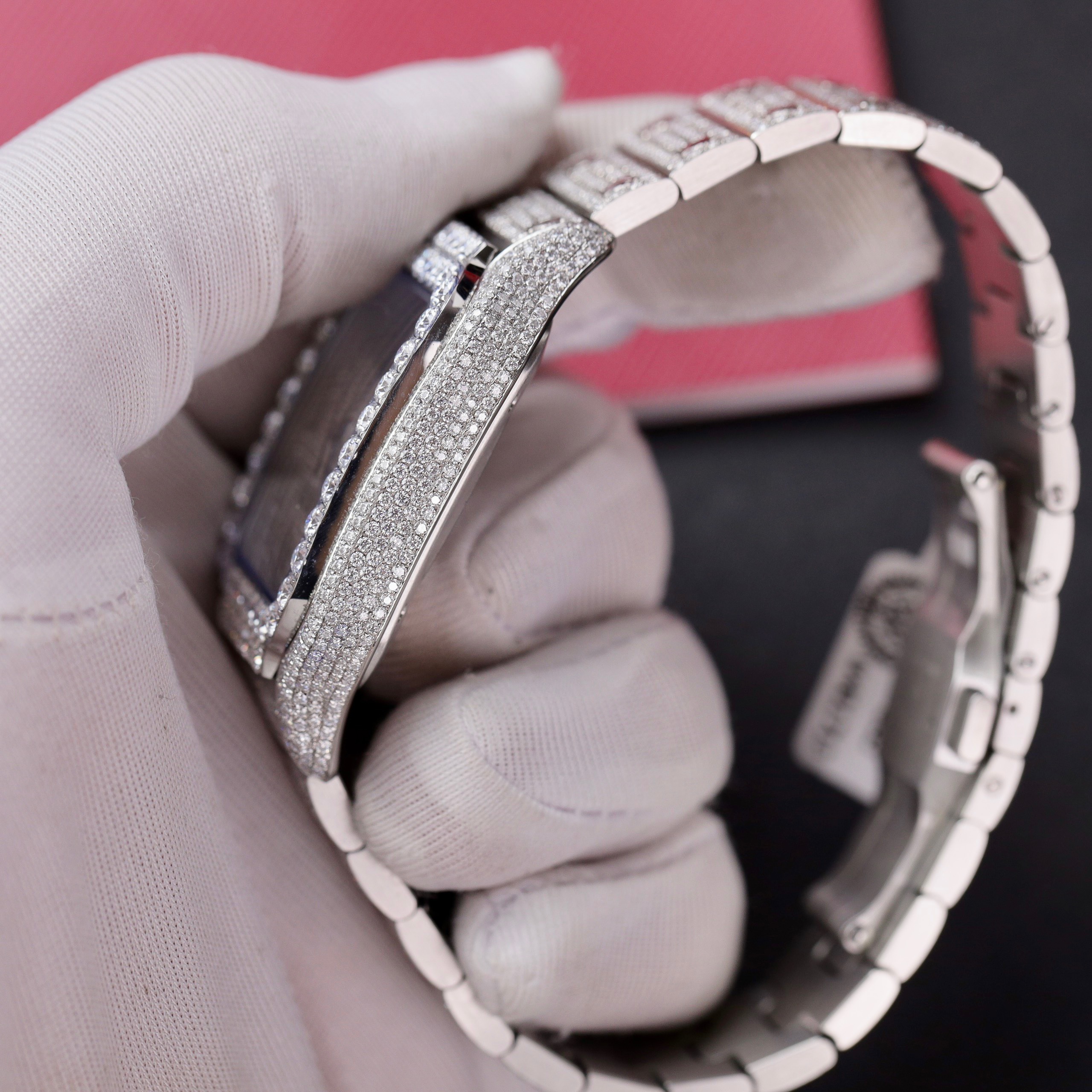 Cartier Iced Out Santos Customs Full Moissanite Diamonds Best Replica is available at DWatch Global.
