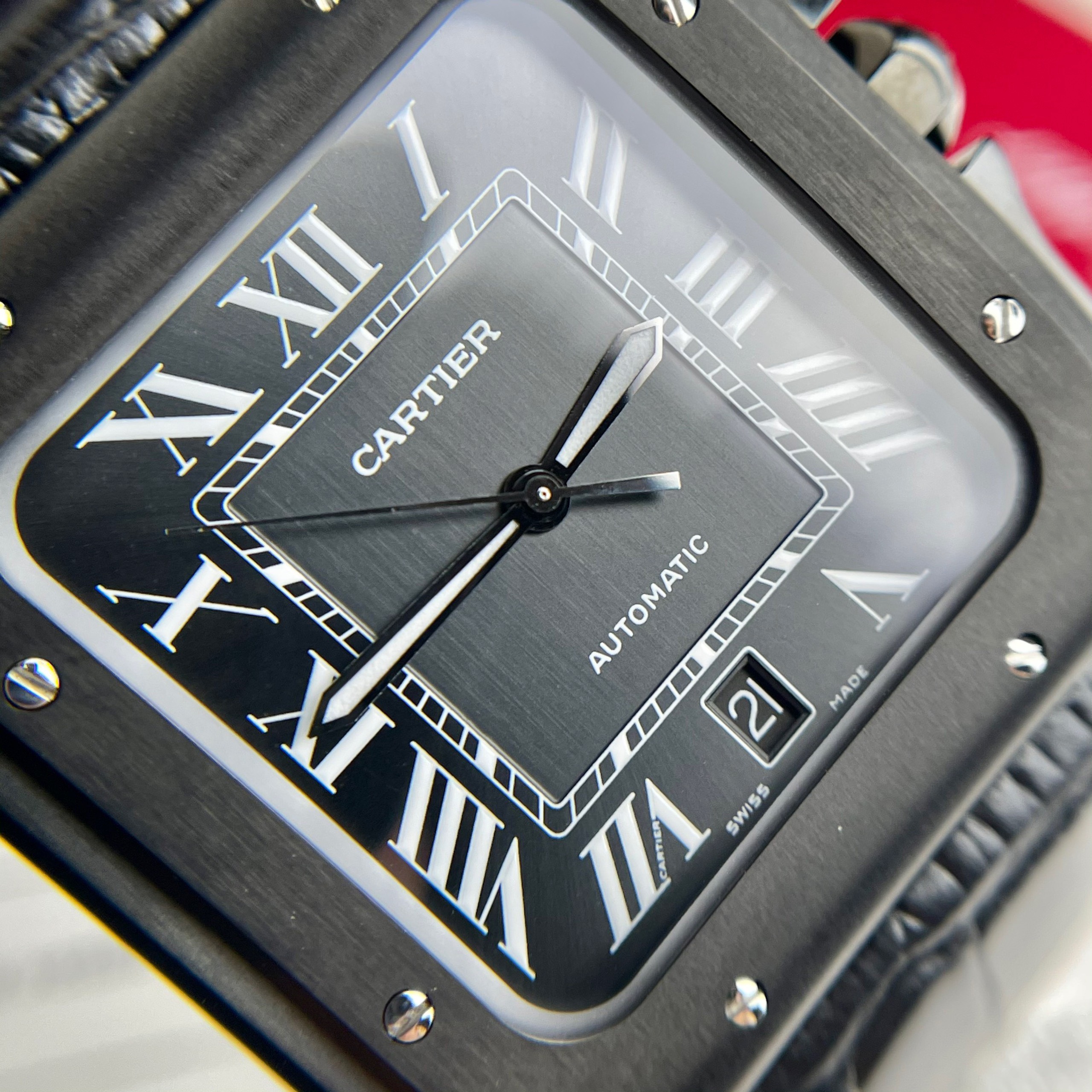 The case of the Cartier Santos de Cartier WSSA0039 Rep 1:1 measures 39.8mm x 39.8mm, crafted from stainless steel and brushed for a polished finish. Remarkably, the case is coated with a layer of black ADLC – an advanced and specialized material.