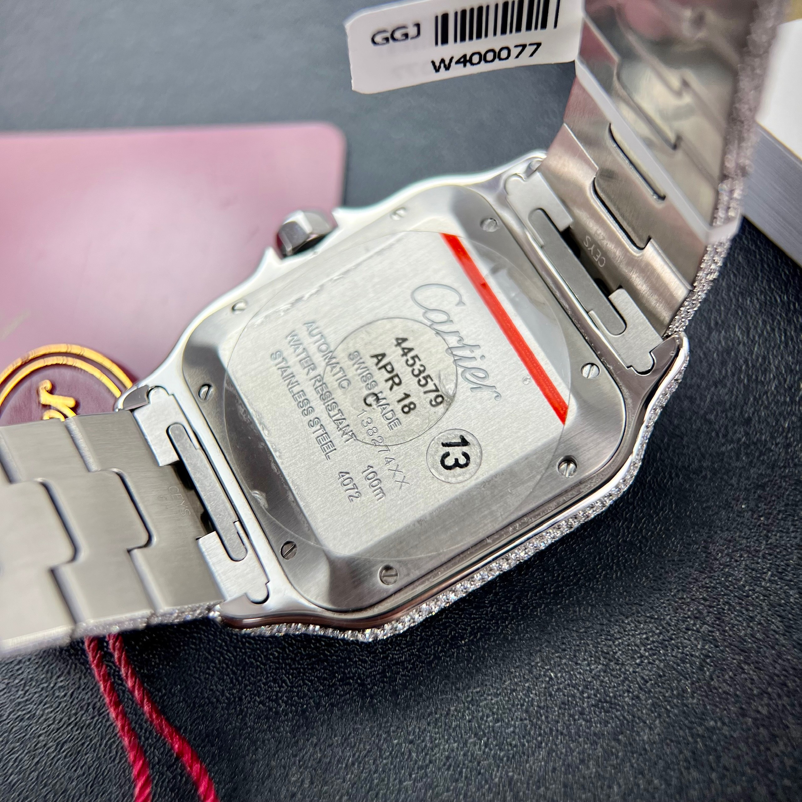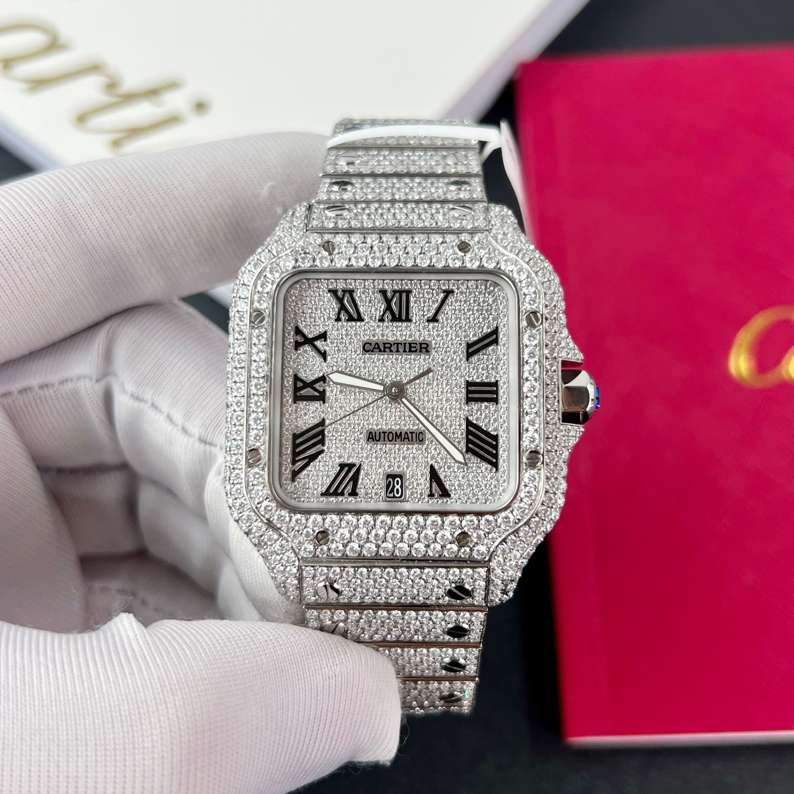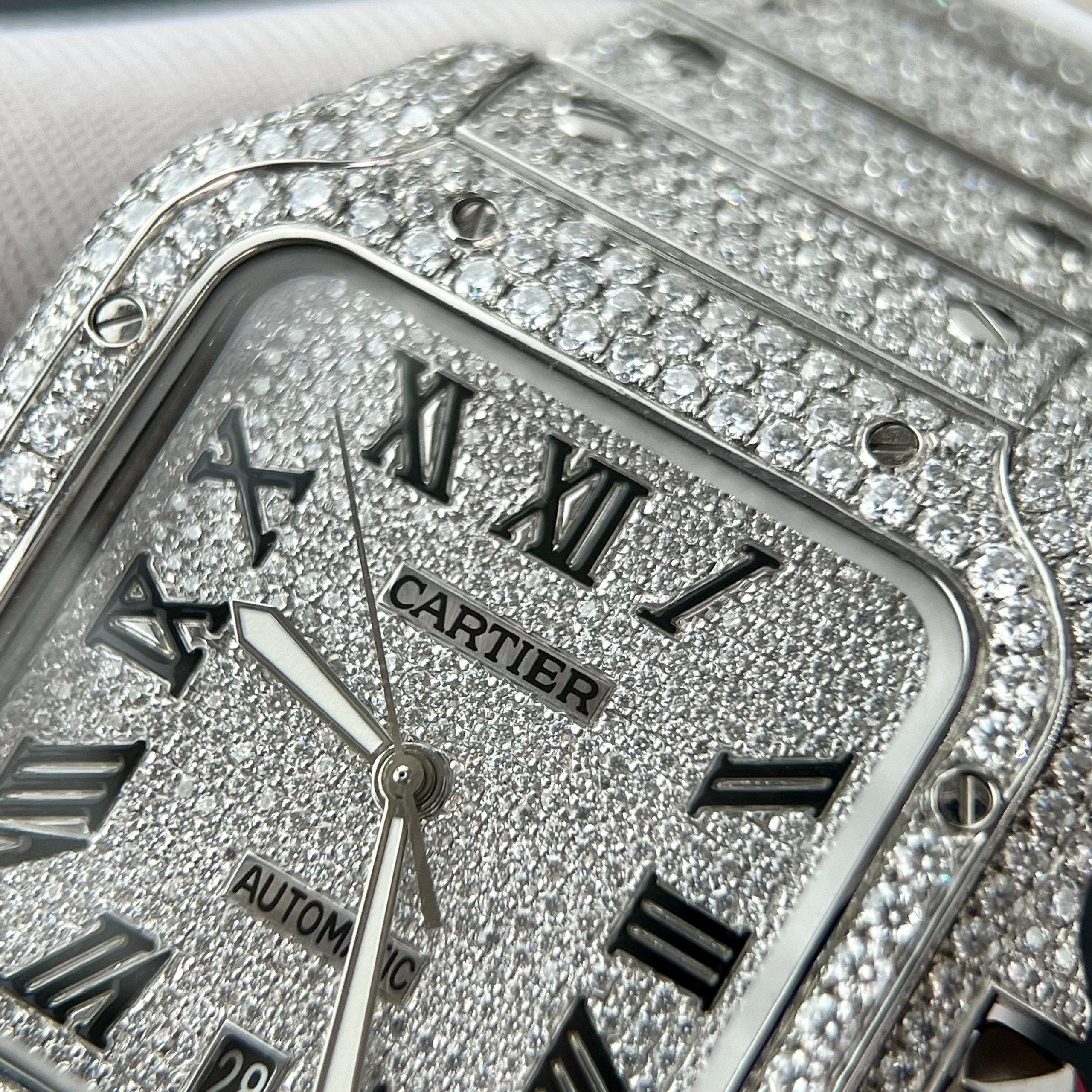 The Cartier Santos Iced Out Replica Watches Diamonds Moissanite Custom BV Factory is a luxurious product meticulously crafted at the BV Factory in Hong Kong, known for producing the finest products. The Cartier diamond-set watch comes with clear certification from reputable inspection units.