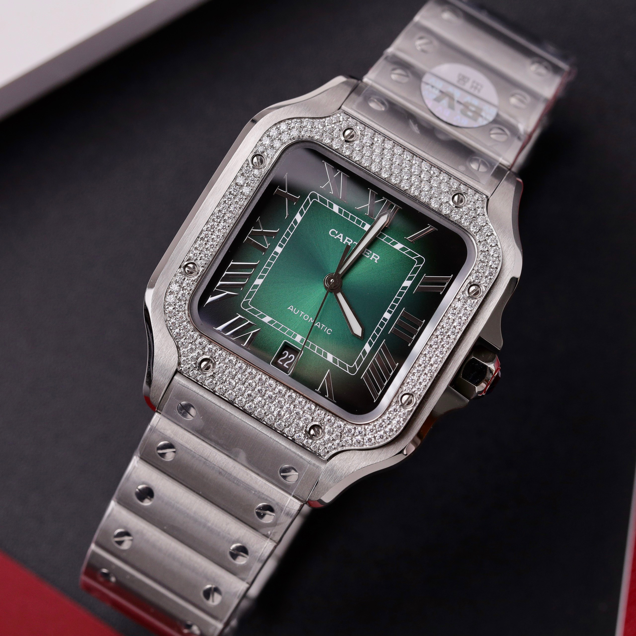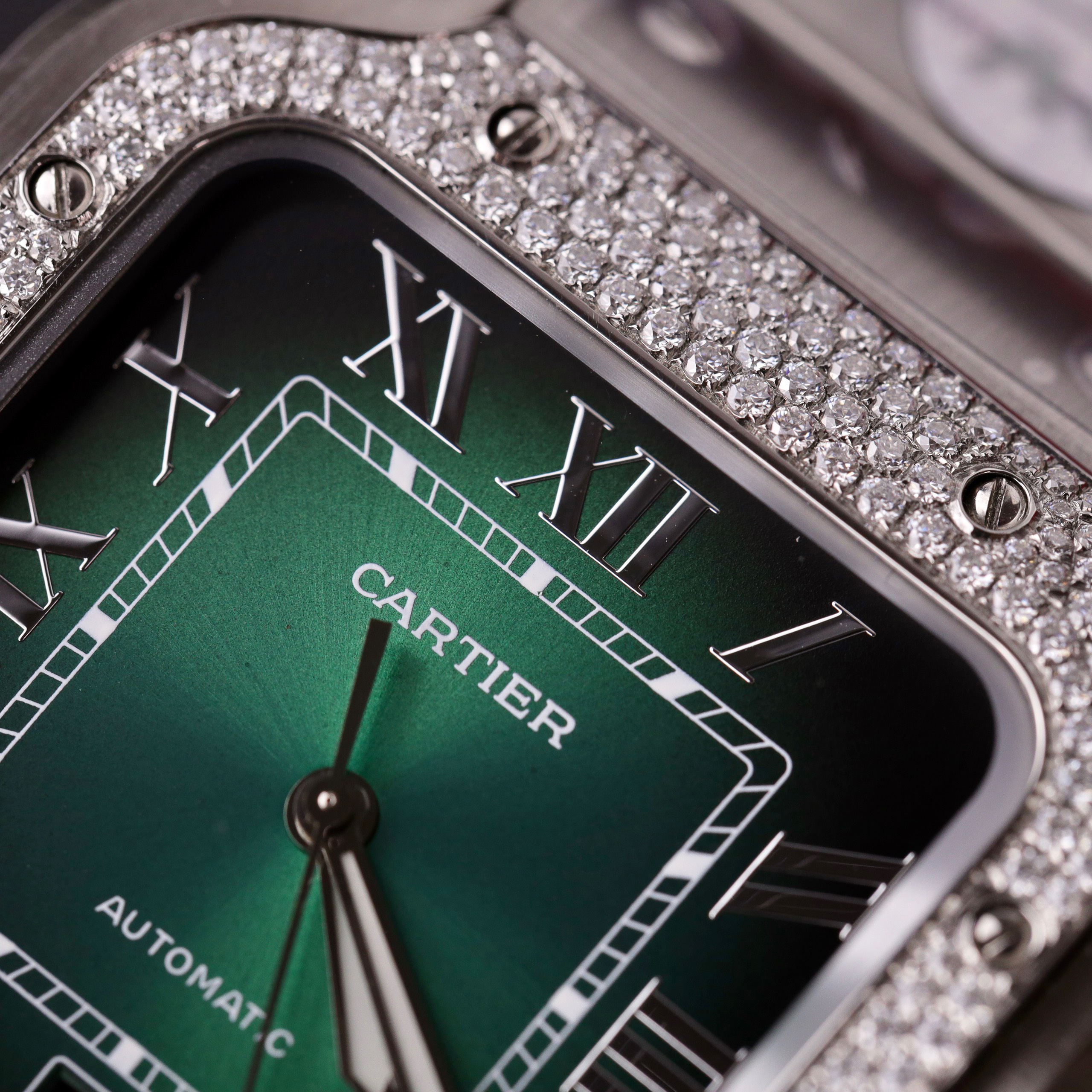 Cartier Santos Imitation Watches Customs Moissanite Diamonds Green Dial BV Factory is available at DWatchGlobal.