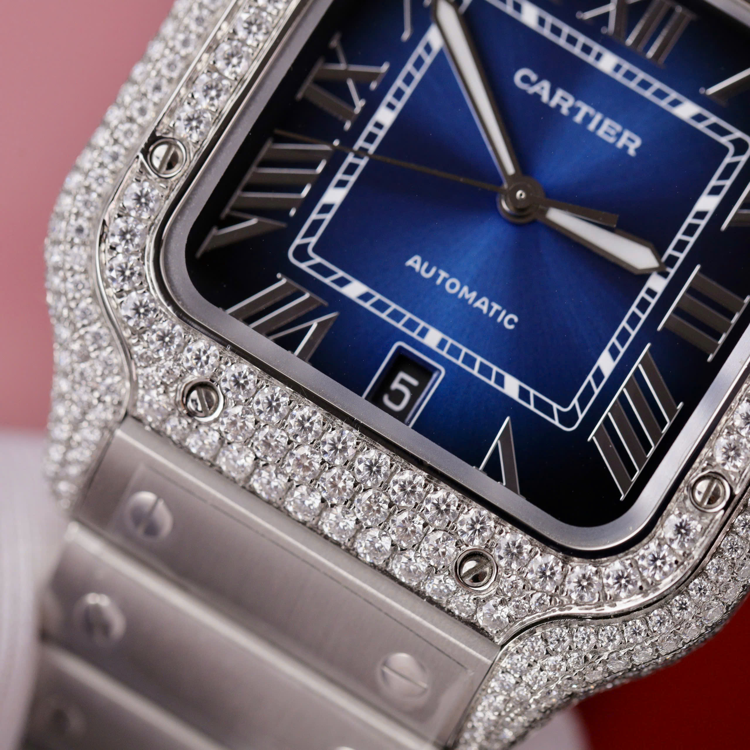 Cartier Santos Luxury Fake Watches Dial Blue Custom Moissanite Diamonds is available at DWatchGlobal.