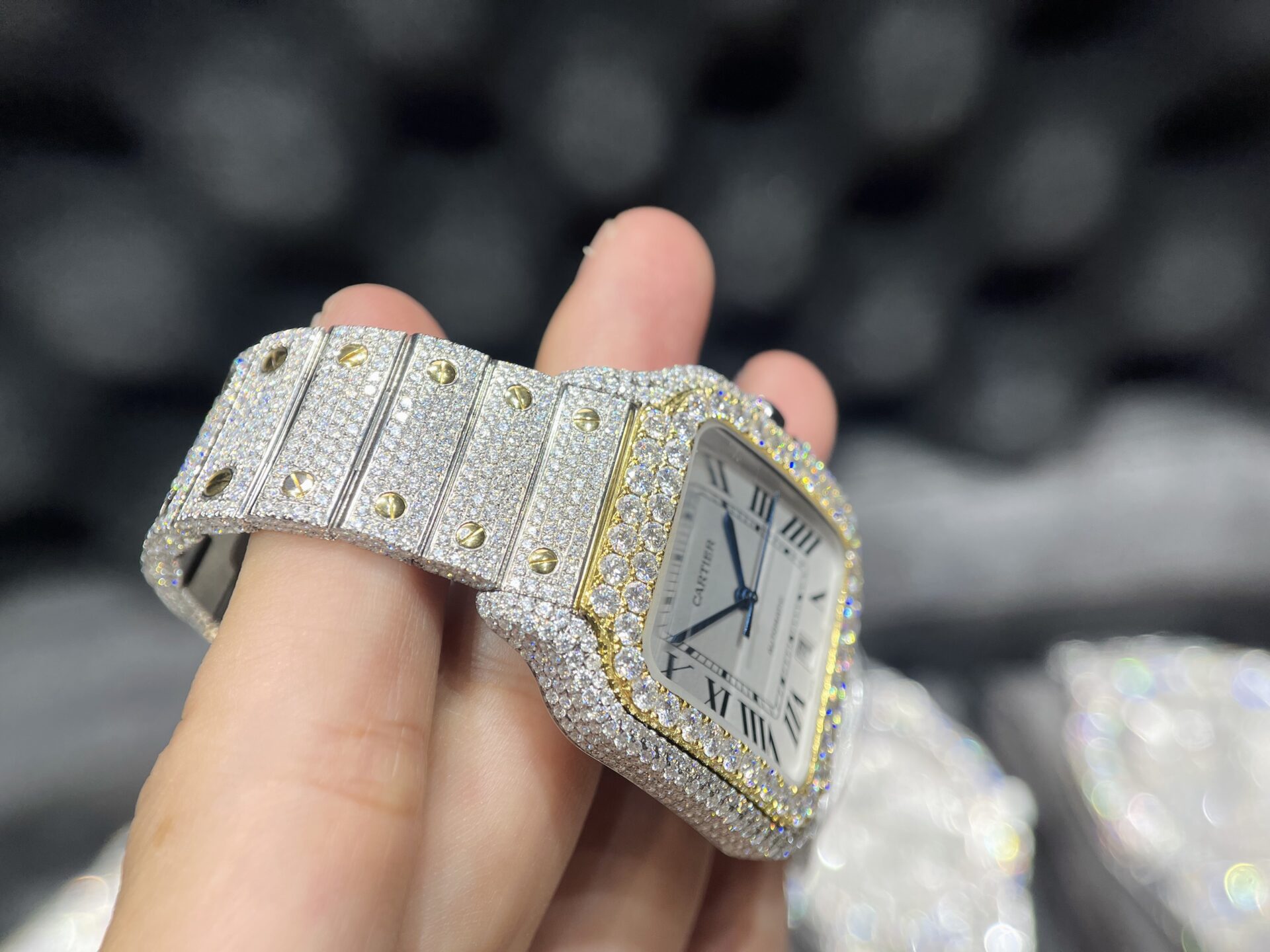 The Cartier Santos Replica Watches Iced Out Demi Gold Full Diamonds Moissanite Custom is a luxurious product meticulously crafted at the BV Factory in Hong Kong, known for producing the finest products. The Cartier diamond-set watch comes with clear certification from reputable inspection units.
