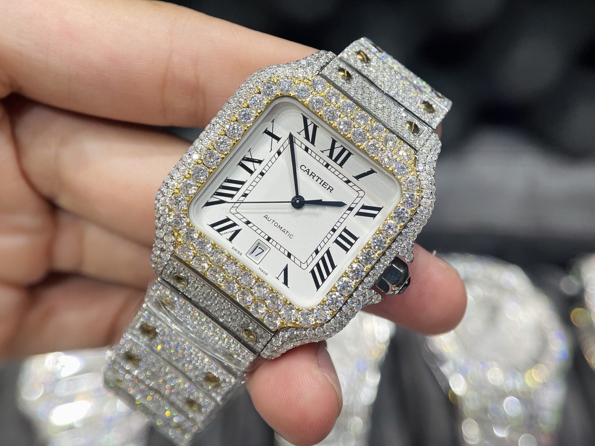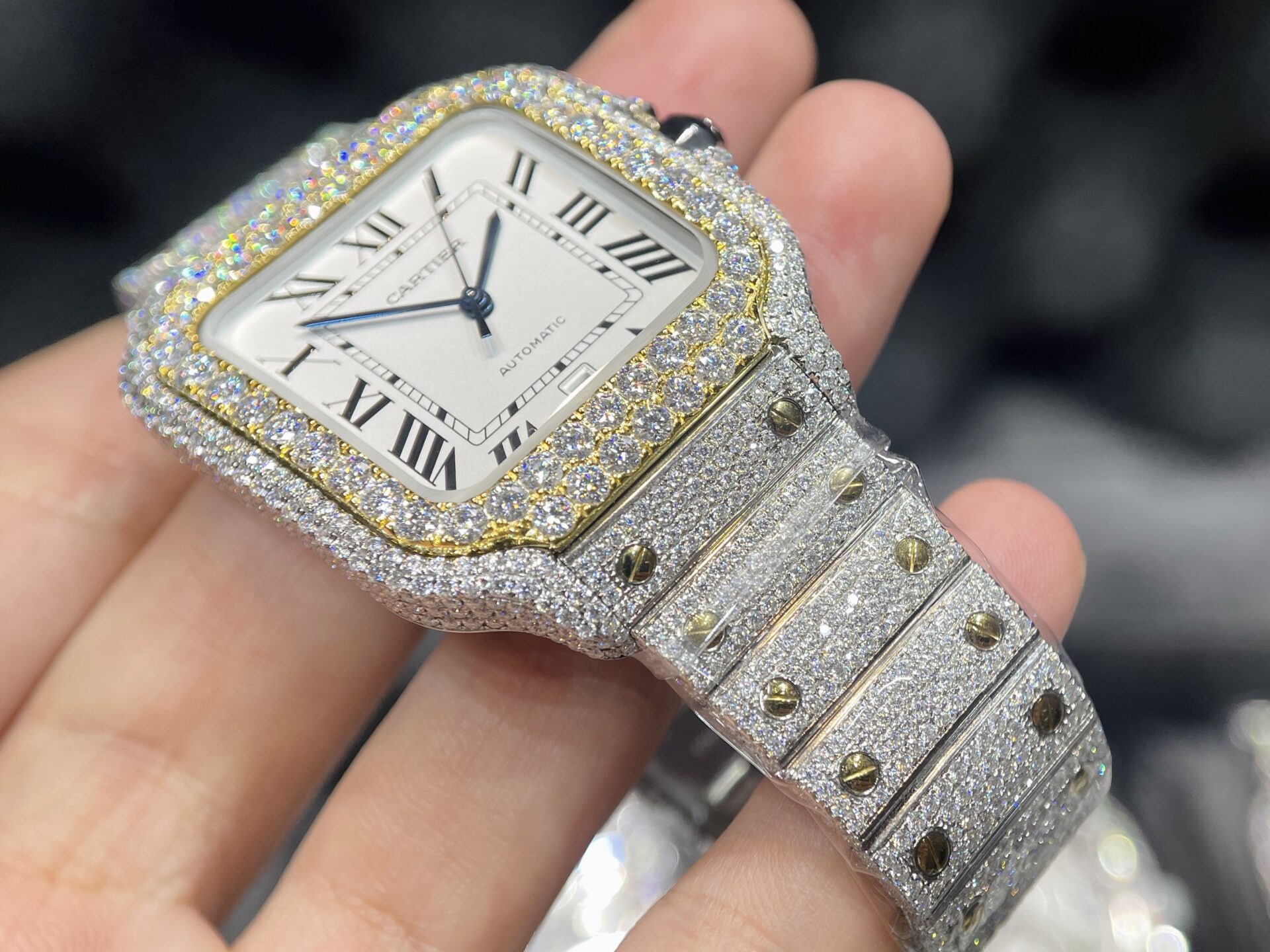 Cartier Santos Iced Out Moissanite Demi Gold Replica Watch