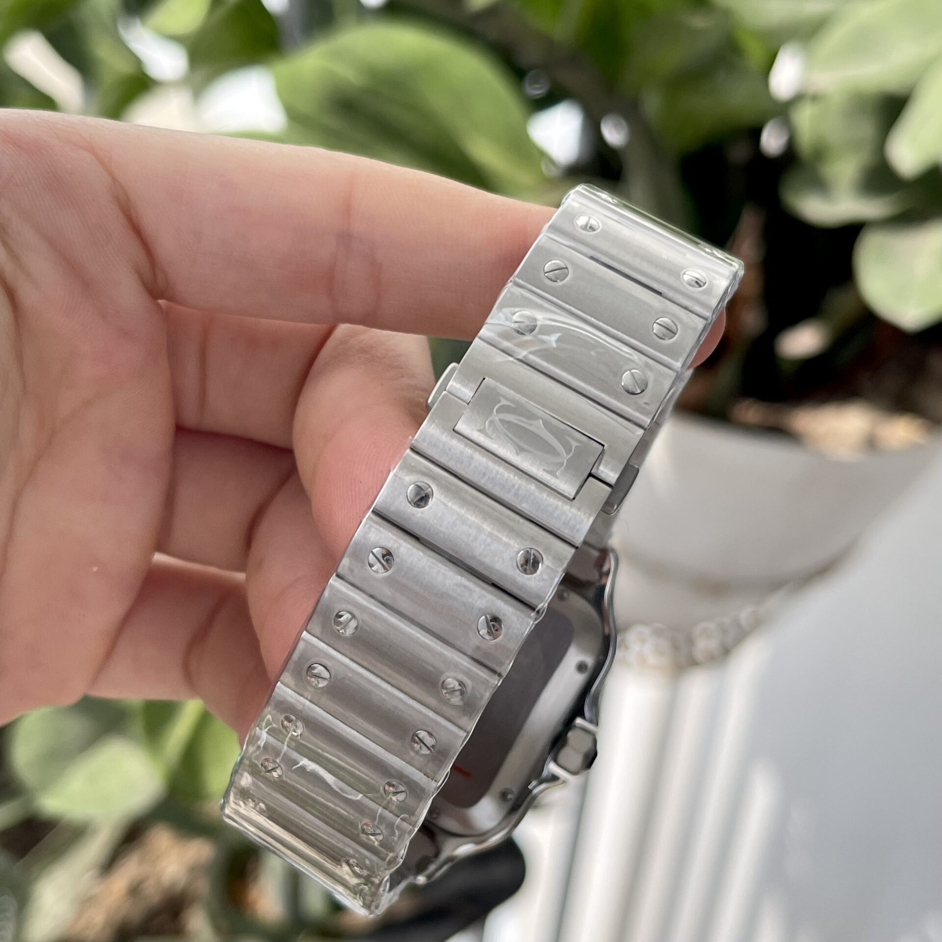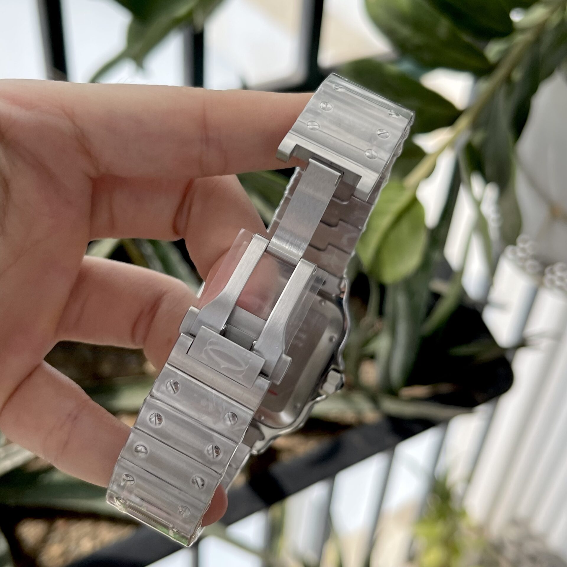 Users can easily swap straps according to their preferences thanks to the QuickSwitch system hidden beneath the strap, activated with a simple touch. In this top-tier Cartier watch version, the manufacturer has equipped it with a stainless steel bracelet and a stylish navy blue calf leather strap.