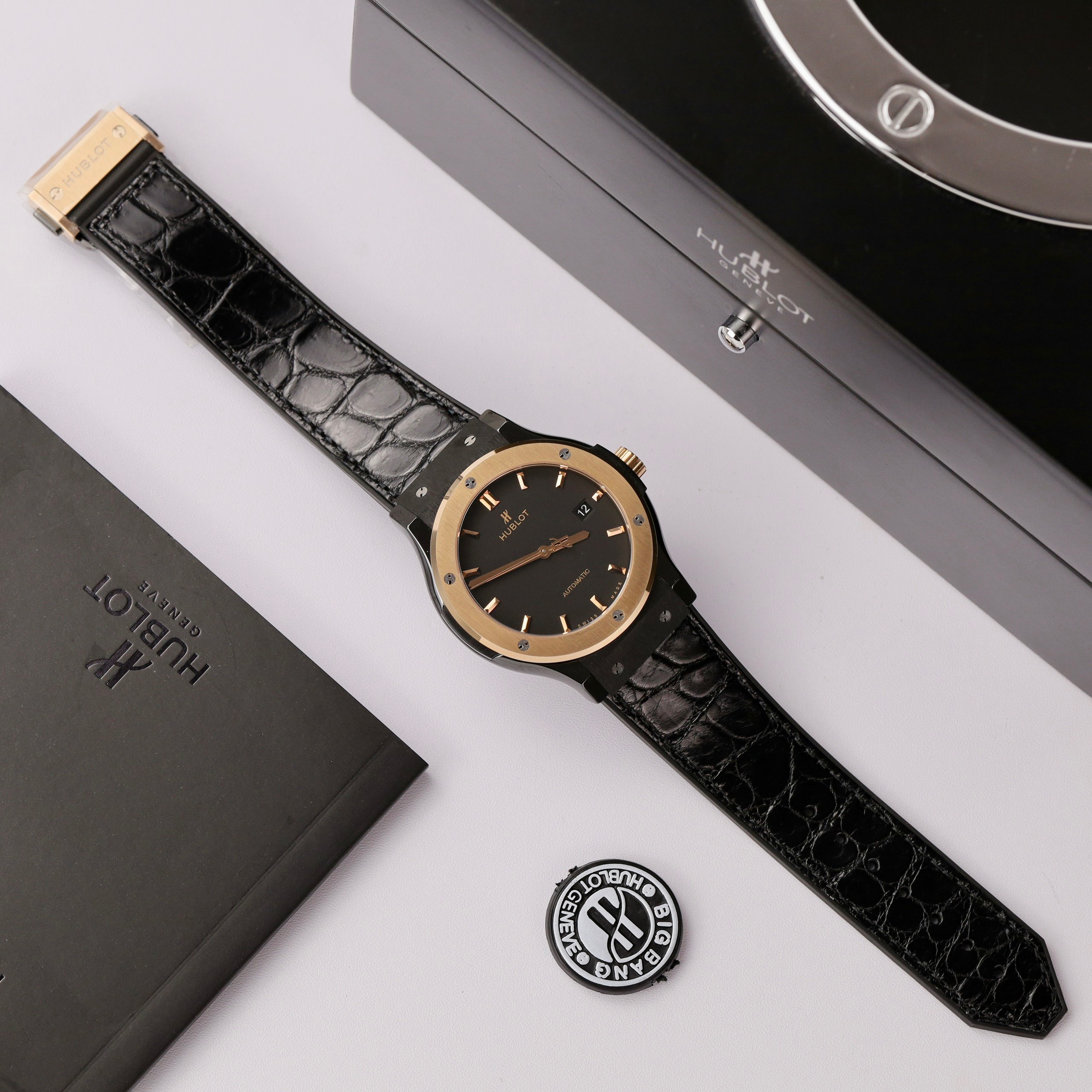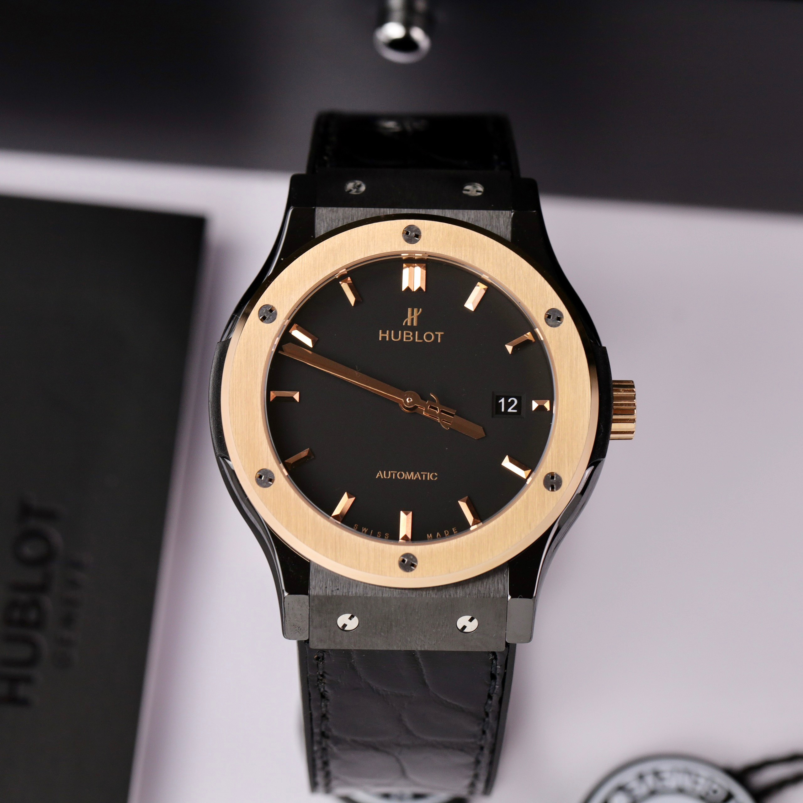 The black dial serves as the background for the central hands, hour markers, Hublot logo, and Automatic inscription, creating a distinctive highlight.