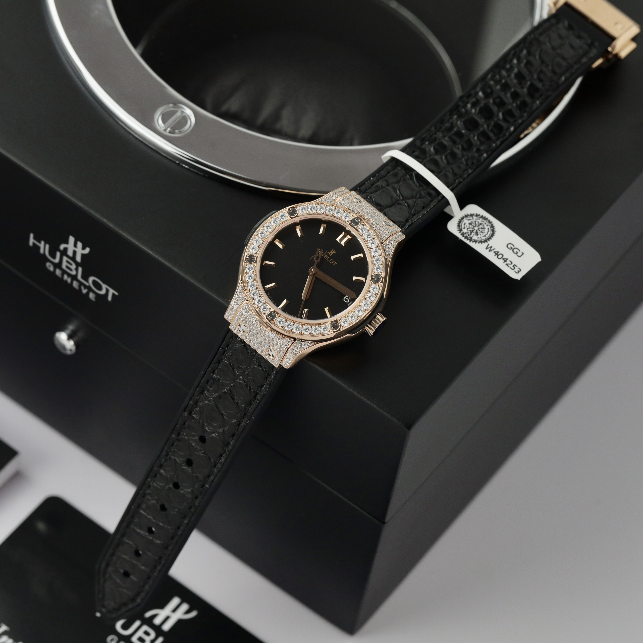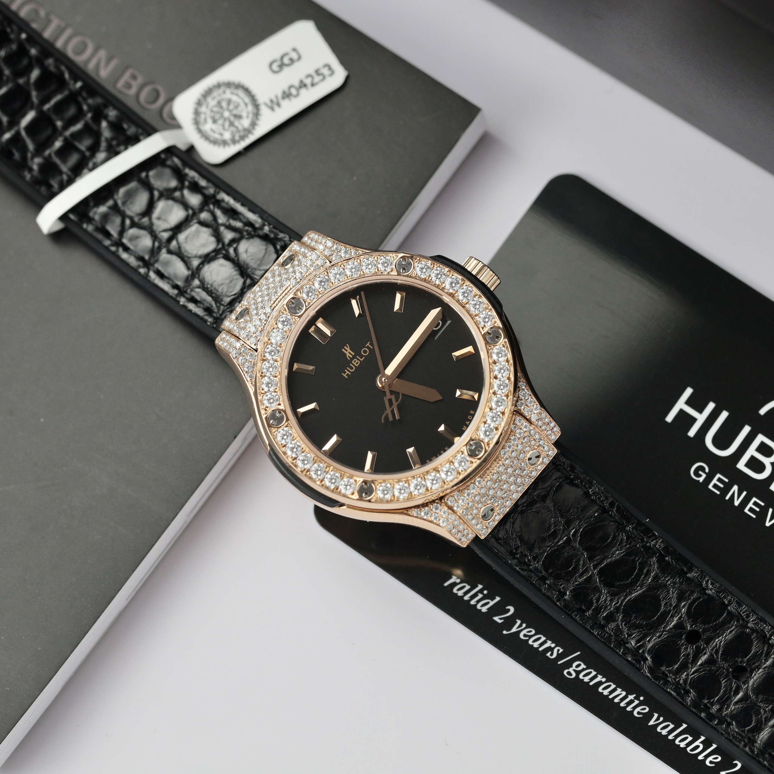 Hublot Classic Fusion King Gold Black Customs Full Moissanite Diamonds HBF is available at DWatch Global.