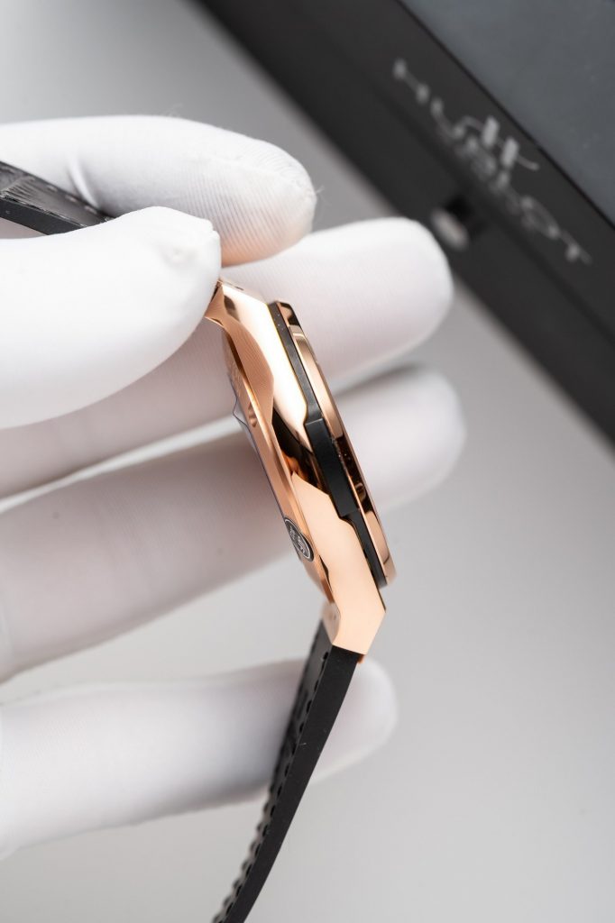 The bezel and lugs of the watch feature round screws shaped into Hublot’s signature H. These screws have a smooth, polished surface that stands out against the brushed finish surrounding them. Particularly when viewed from the side, the beveled and polished sides of the Hublot watch reflect light beautifully.