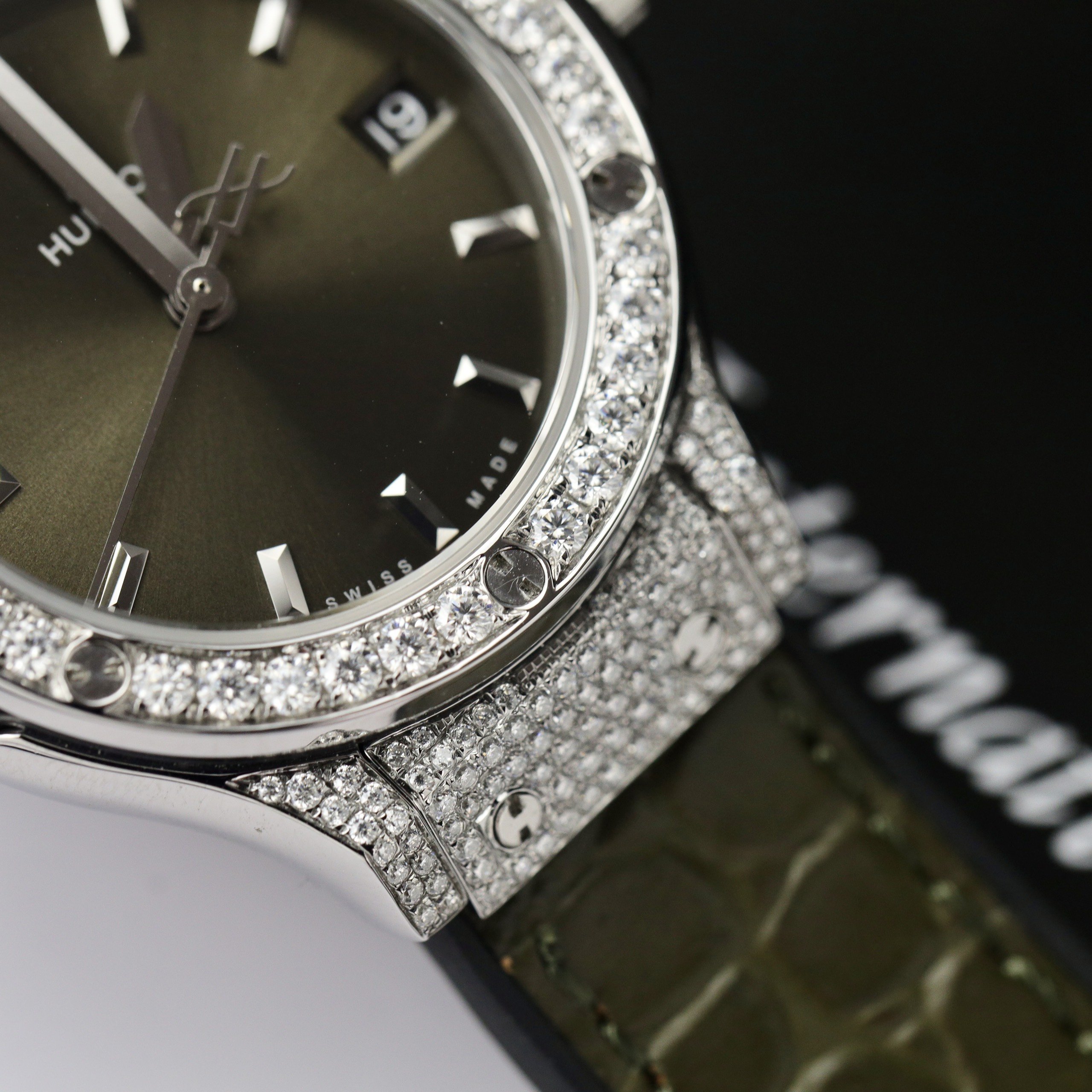 Hublot Classic Fusion Titanium Green Customs Full Moissanite Diamonds HBF is available at DWatch Global.