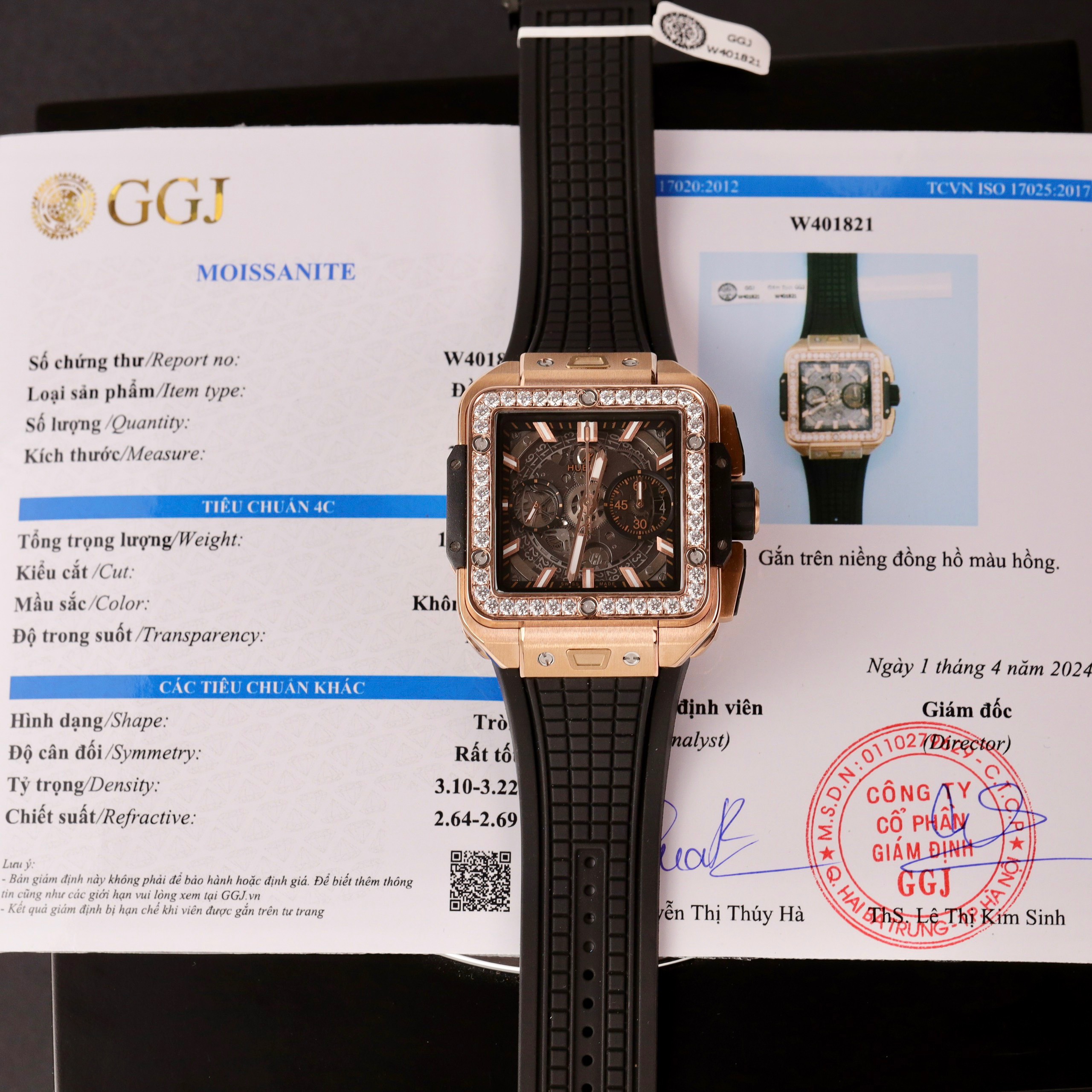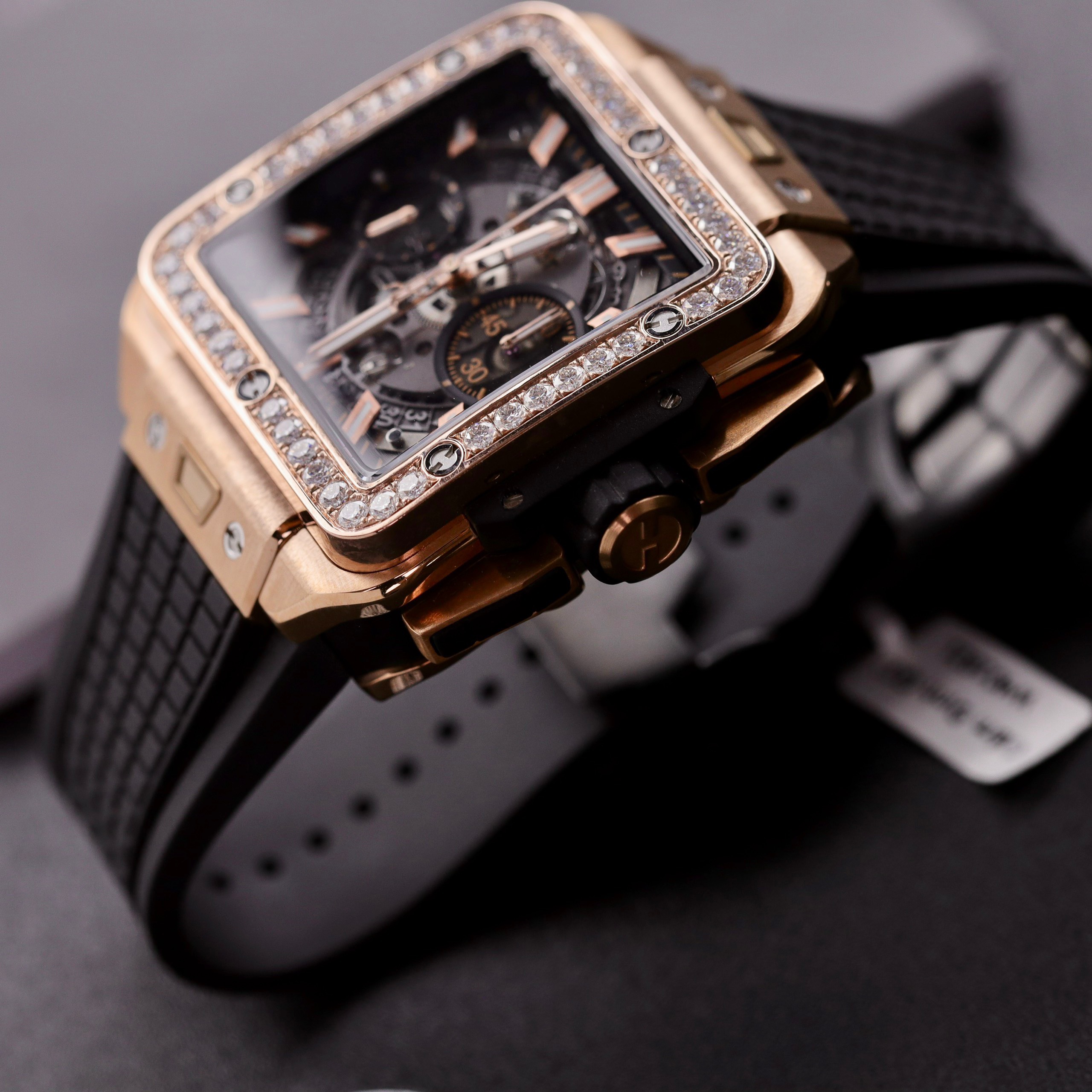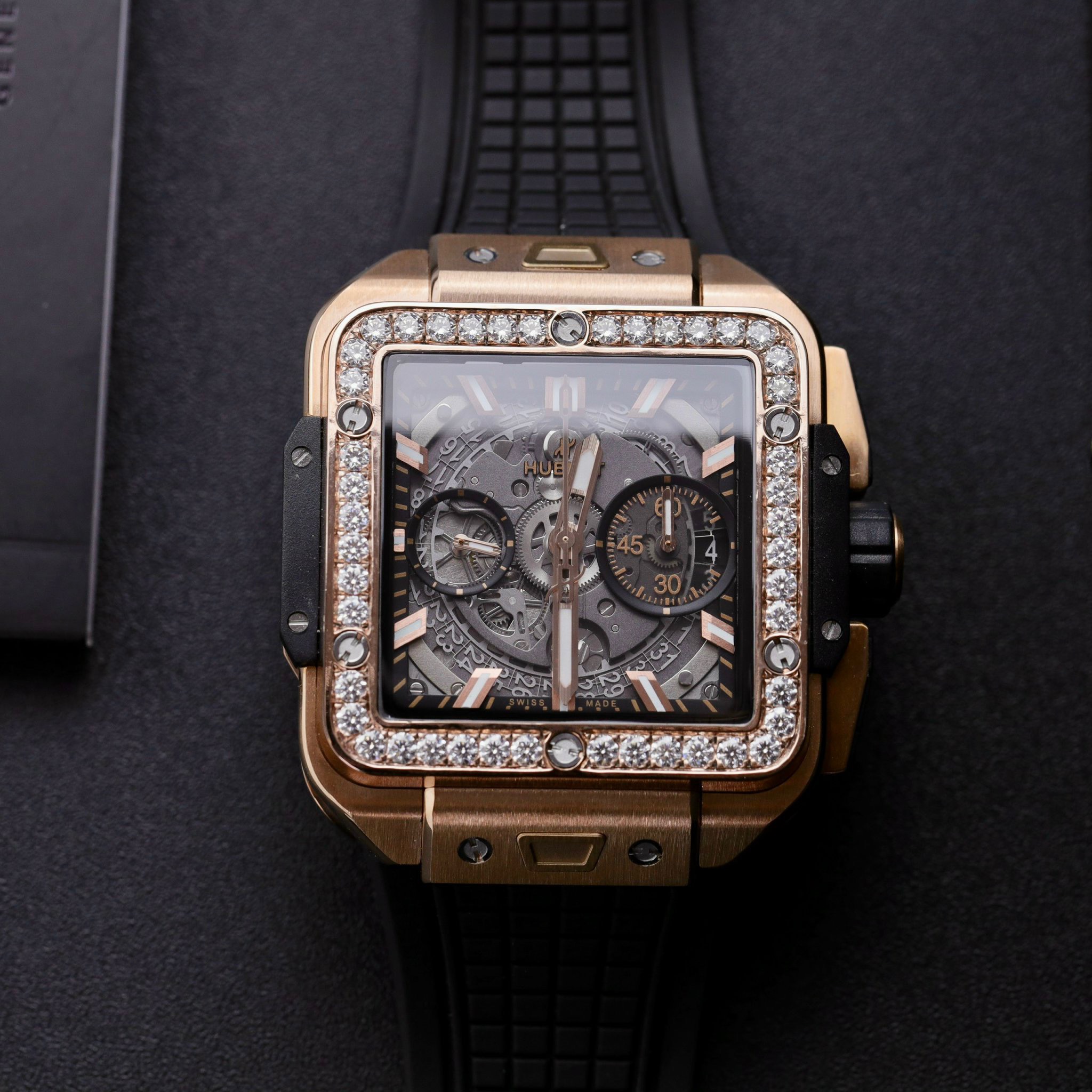 Hublot is one of the emerging watch brands that has quickly made a name for itself in the world of luxury watches. This recognition comes not only from the exquisite design but also from the superior quality and precision of its complex movements. The HUBLOT SQUARE BANG collection is no exception, featuring unique geometric designs combined with premium materials and precise movements. DWatch Global introduces a high-end replica version called the Hublot Square Bang King Gold Custom Bezel Diamonds Moissanite BBF Factory.
