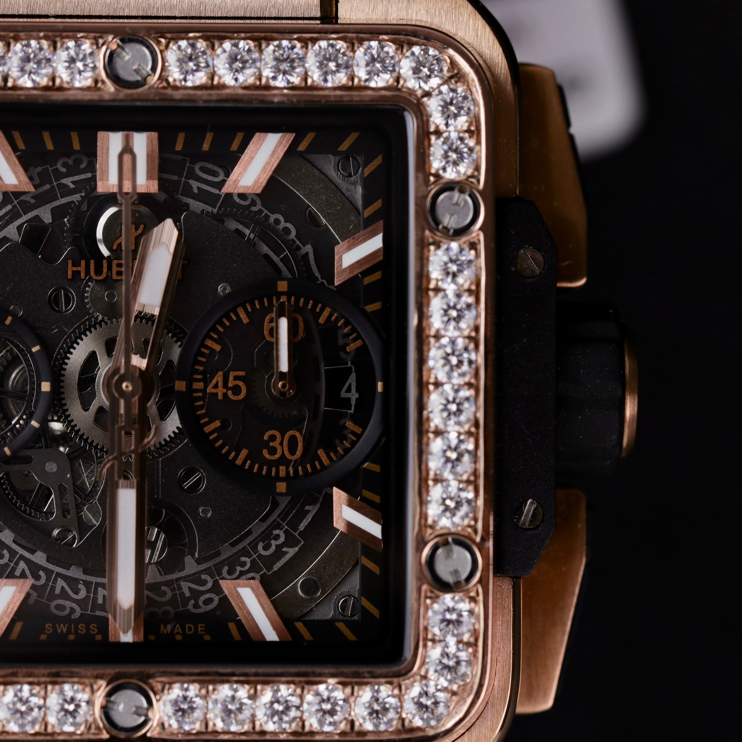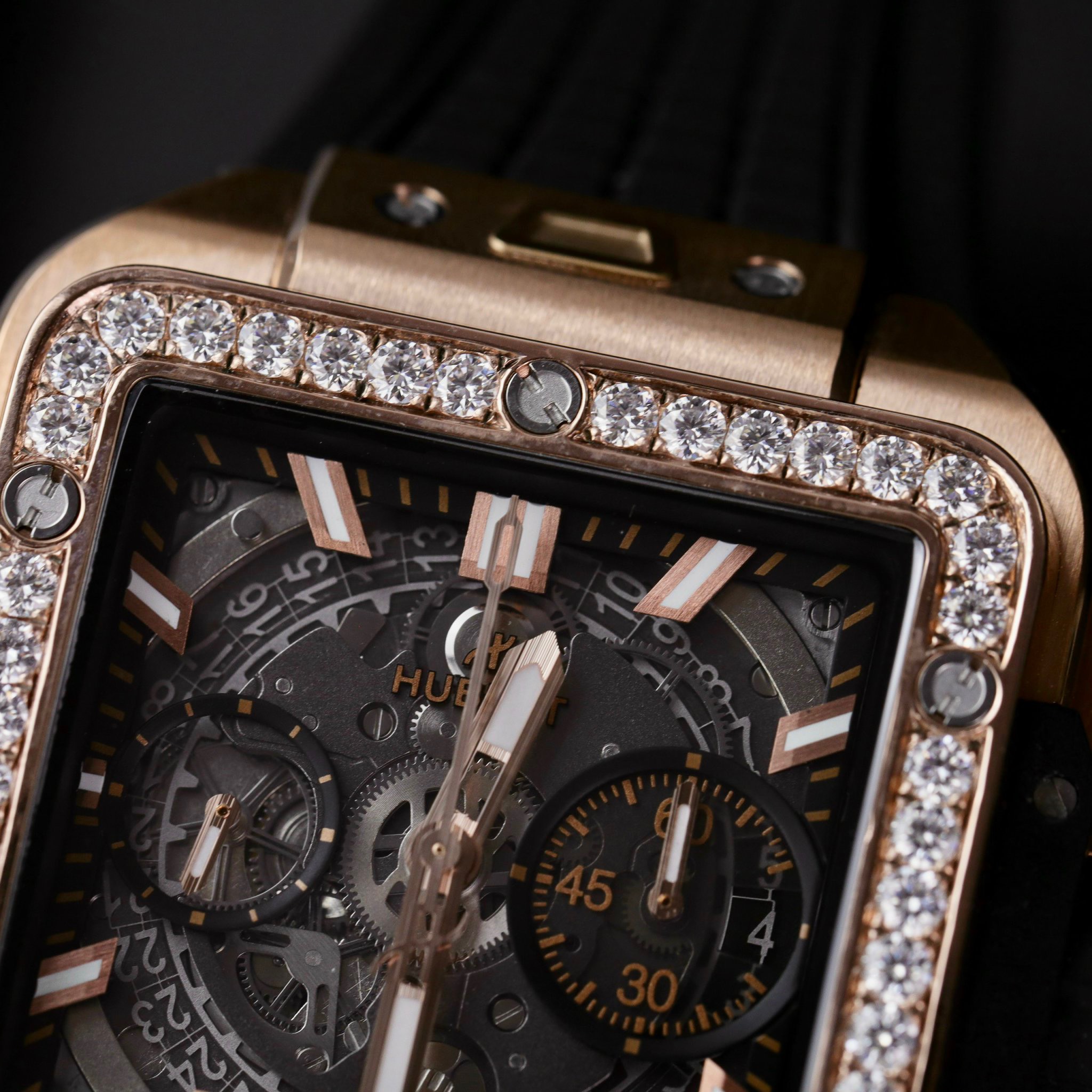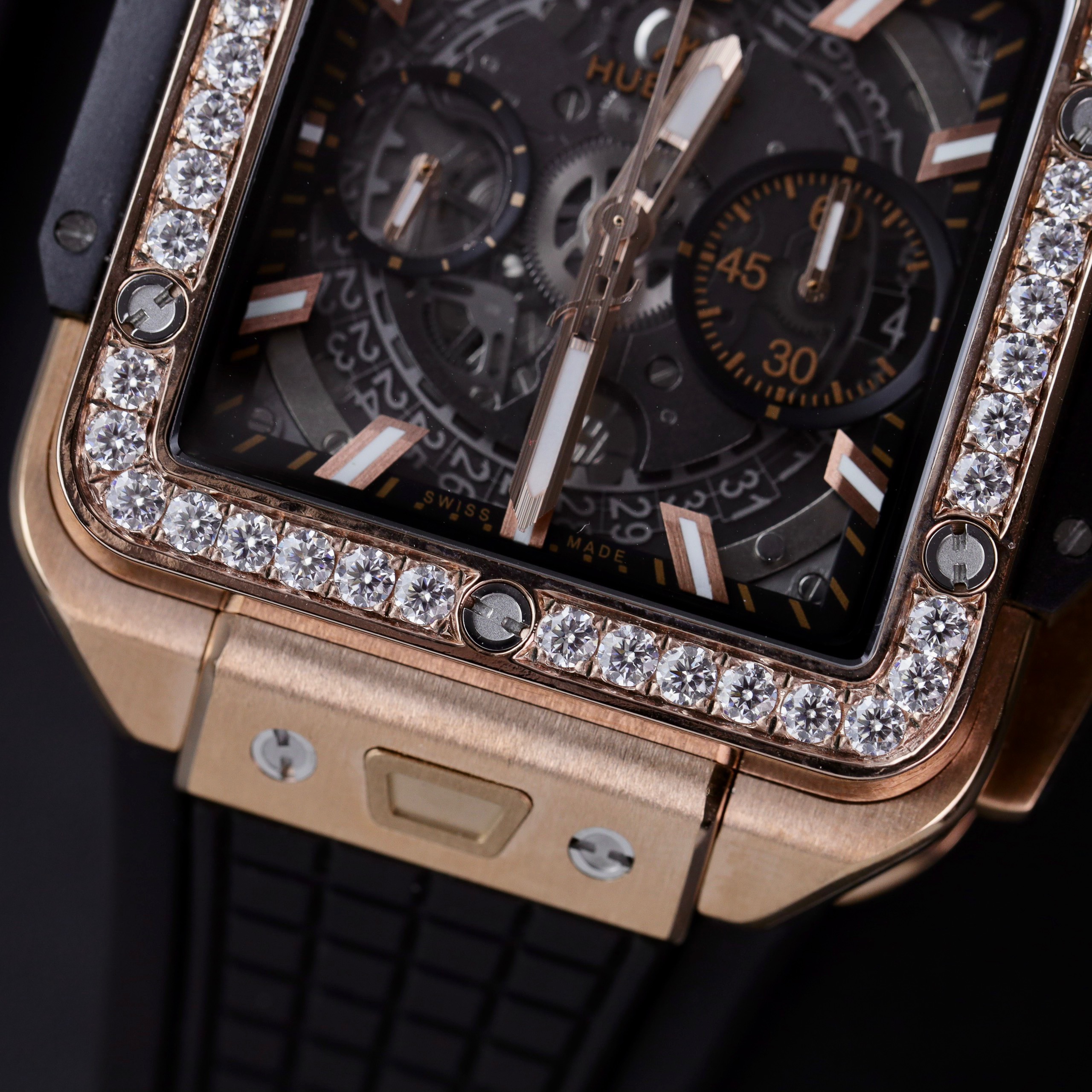 Hublot is one of the emerging watch brands that has quickly made a name for itself in the world of luxury watches. This recognition comes not only from the exquisite design but also from the superior quality and precision of its complex movements. The HUBLOT SQUARE BANG collection is no exception, featuring unique geometric designs combined with premium materials and precise movements. DWatch Global introduces a high-end replica version called the Hublot Square Bang King Gold Custom Bezel Diamonds Moissanite BBF Factory.