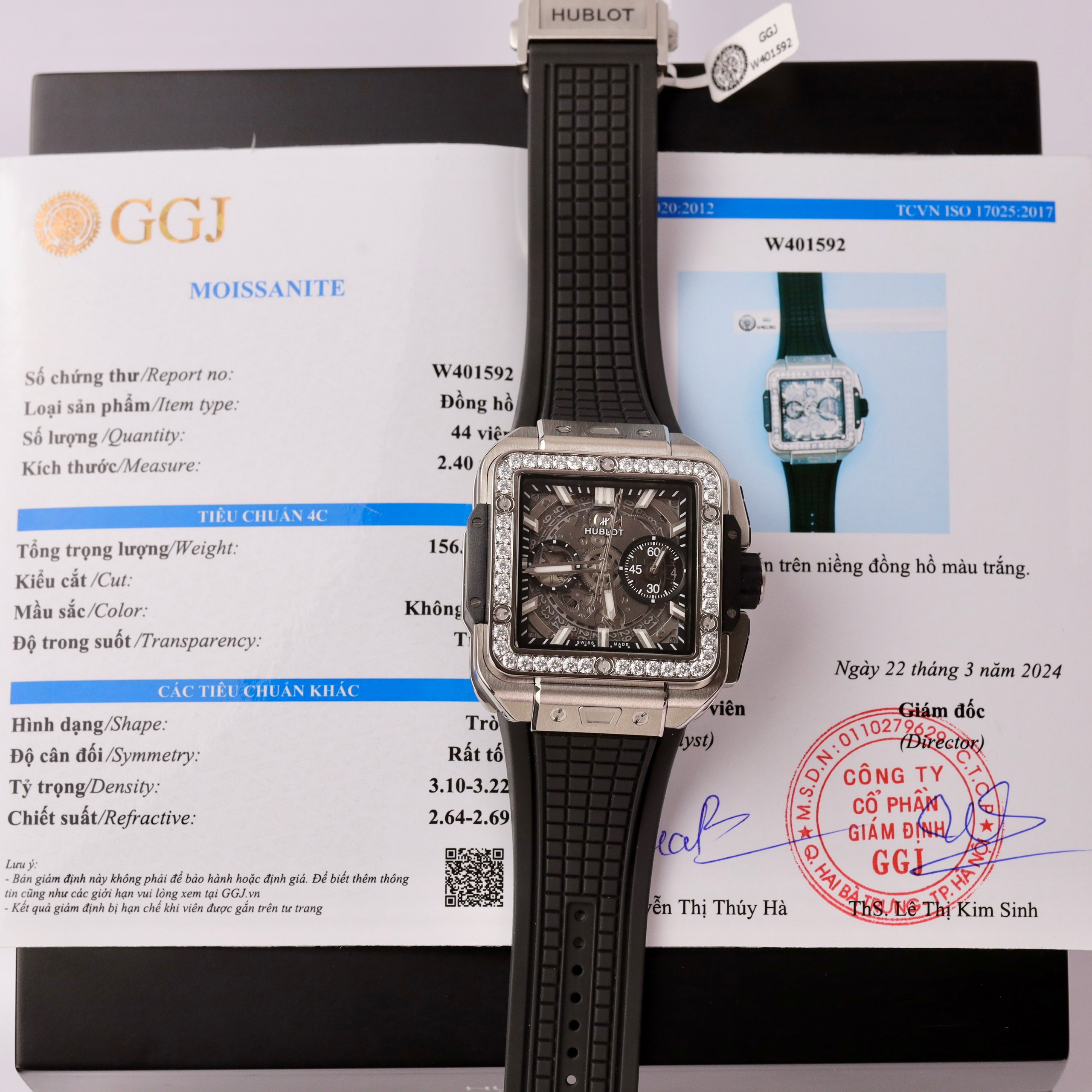 The Hublot Square Bang Titanium Custom Bezel Diamonds Moissanite BBF Factory, with reference number 821.NX.0170.RX.1204, is a true masterpiece of art from the renowned Hublot brand. It’s not just an ordinary replica watch but also a symbol of creativity and elegance, combining unique design and the use of superior materials.