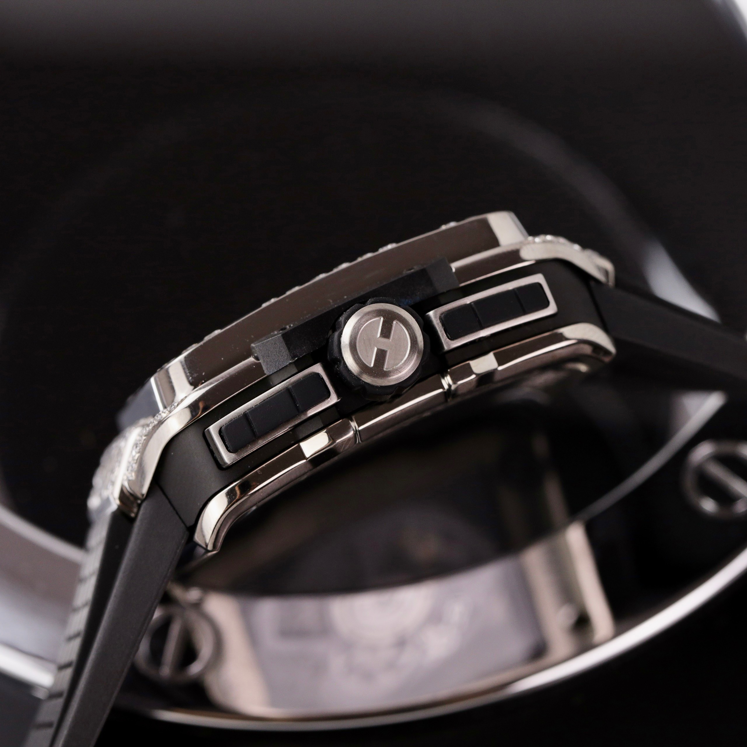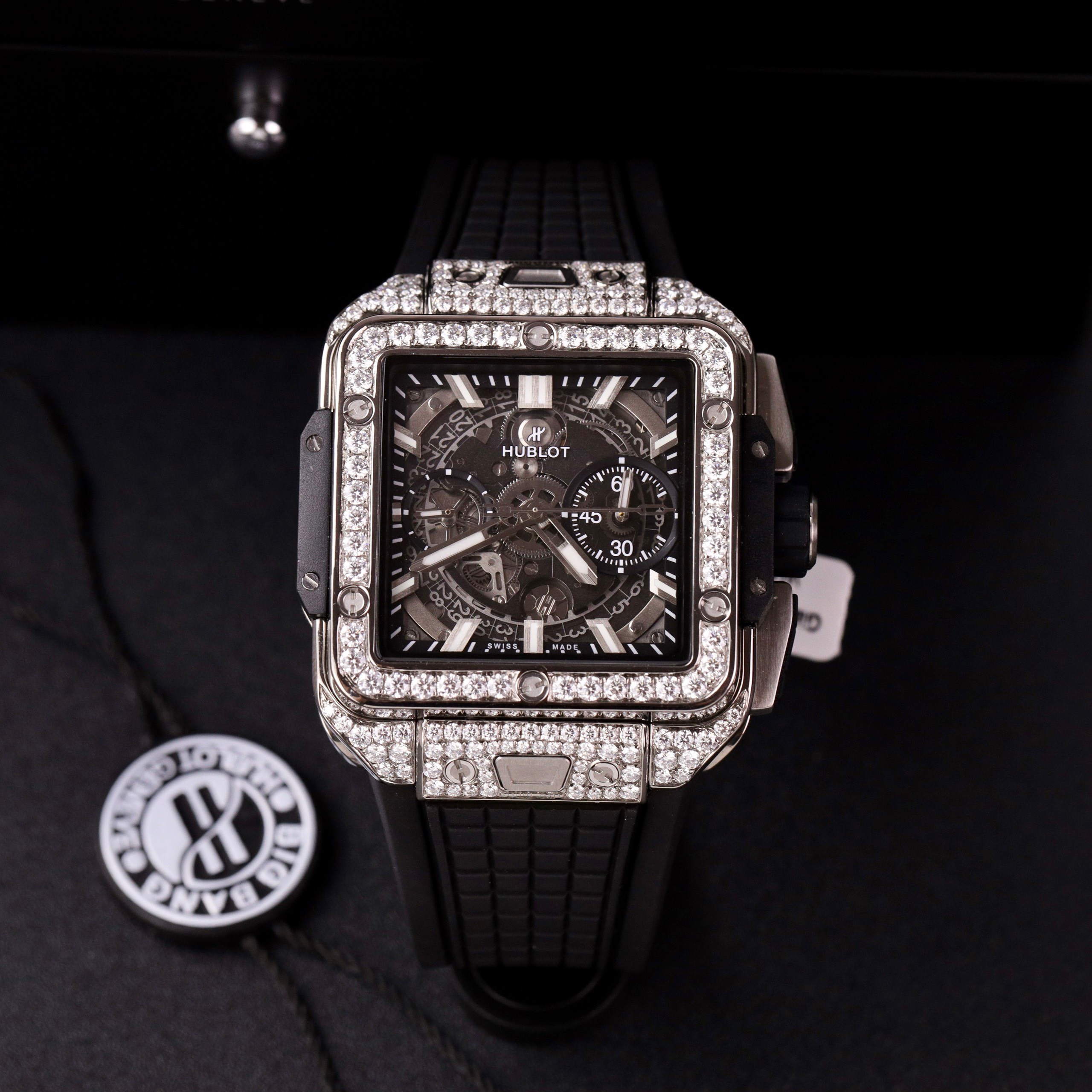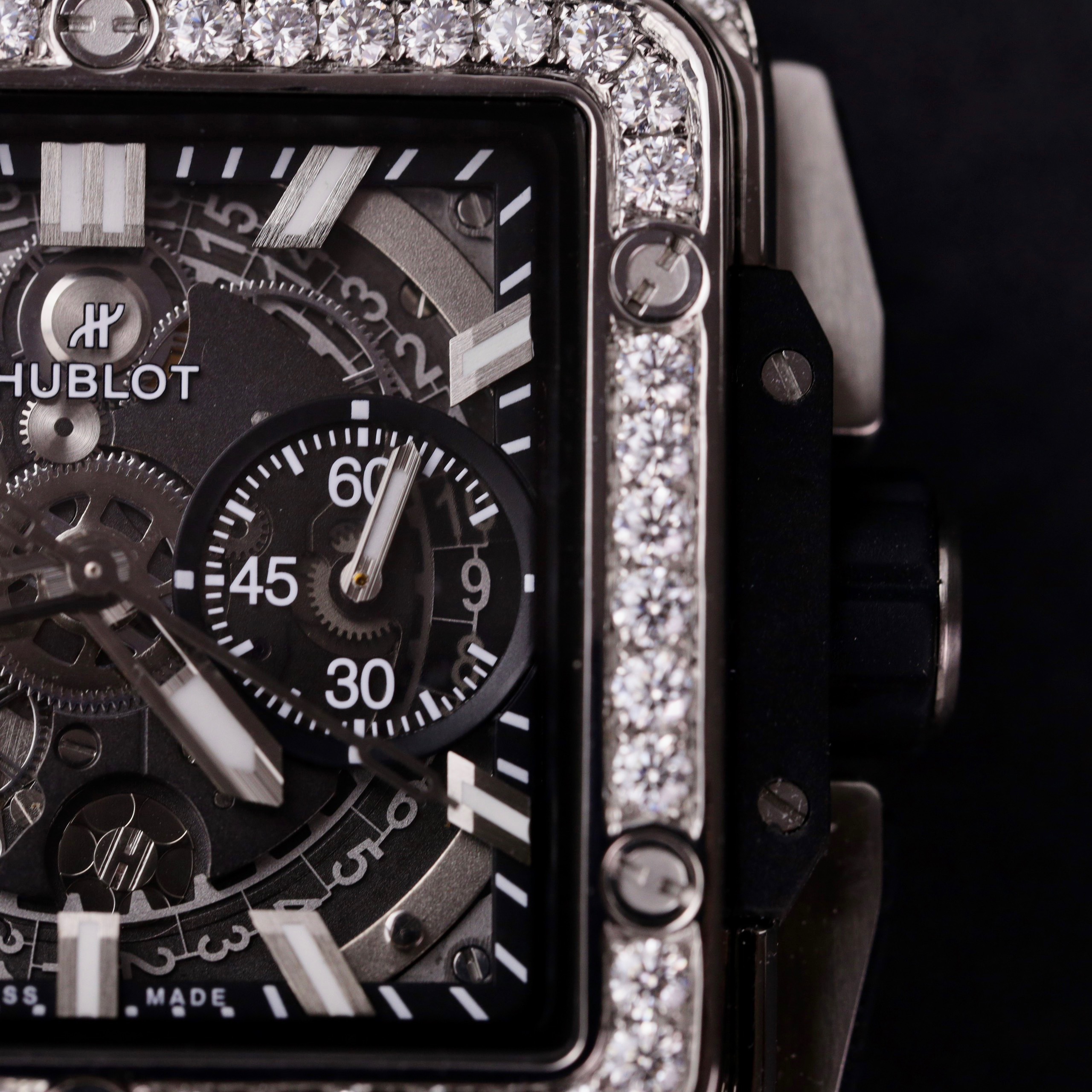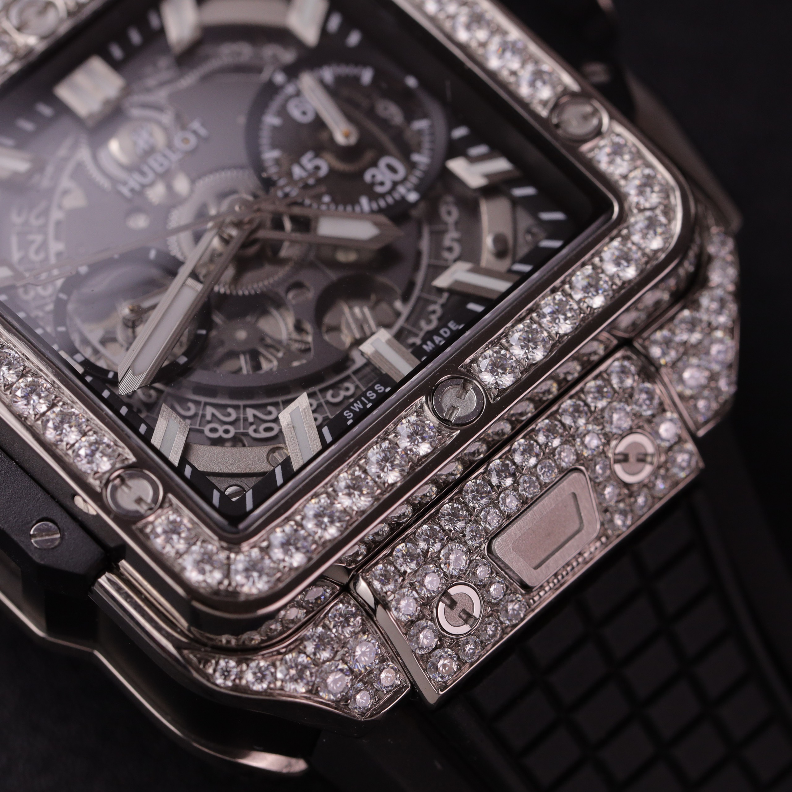 Hublot Square Bang Unico Titanium Custom Full Moissanite Diamonds Replica Watches is available at DWatchGlobal.