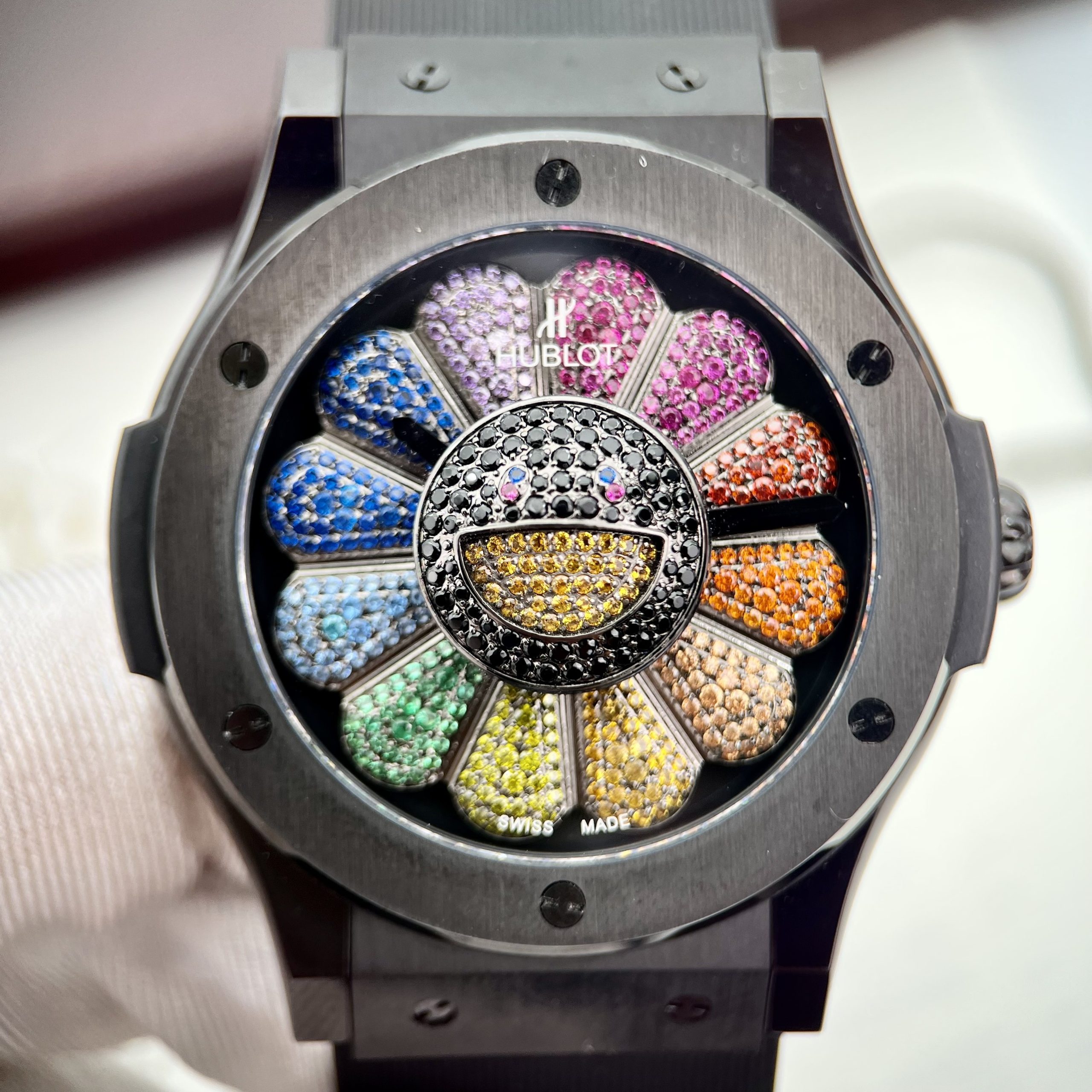 The dial of the Hublot Classic Fusion Takashi Murakami watch is adorned with the image of the smiling flower, symbolizing the artist’s iconic motif. Presently, the Hublot Takashi Murakami Ceramic Rainbow version Best Replica is available at DWatch Global, offering you the opportunity to own one of the most unique artistic creations.