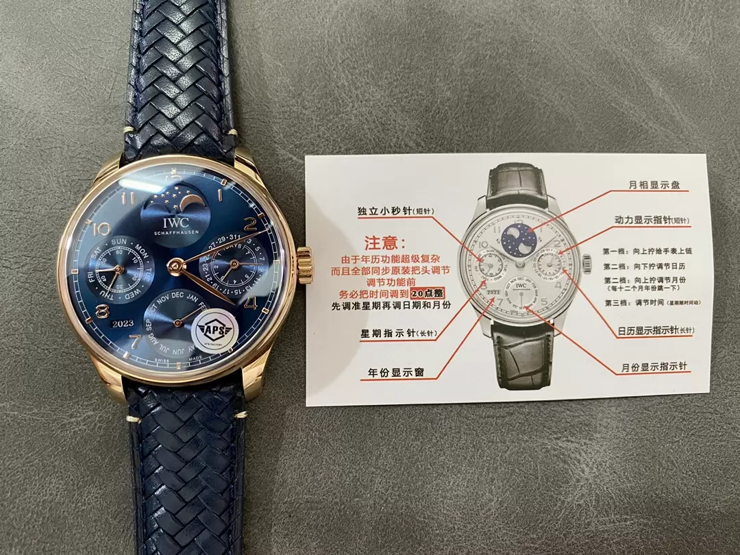 - Mechanical Performance: The watch measures 42.2mm x 14.9mm, utilizing the basic mechanical movement of the Portugieser, ensuring stable and efficient operation, with a power reserve of over 72 hours. Additionally, with the complex perpetual calendar module, all functions are synchronized with the original version through the crown.