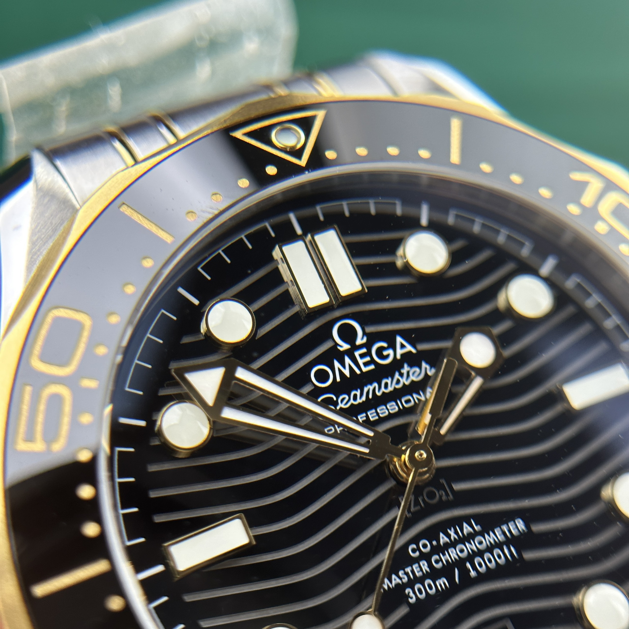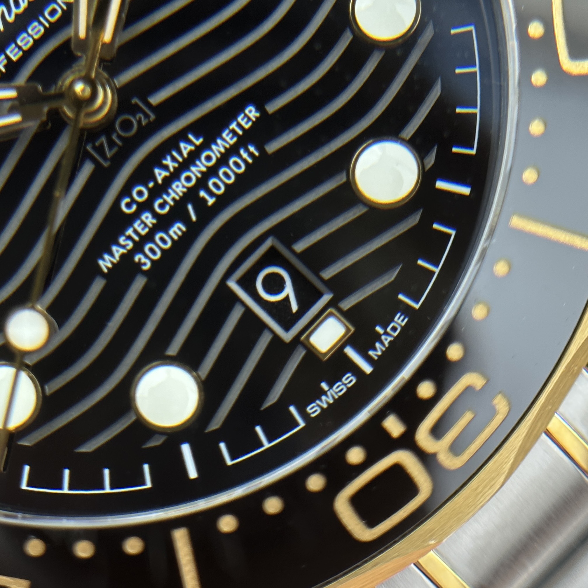 Beneath the anti-reflective sapphire crystal lies a black dial with gentle wave patterns, evoking the imagery of the deep ocean. This also makes the gold hour markers and hands stand out prominently against the watch’s shared background color.