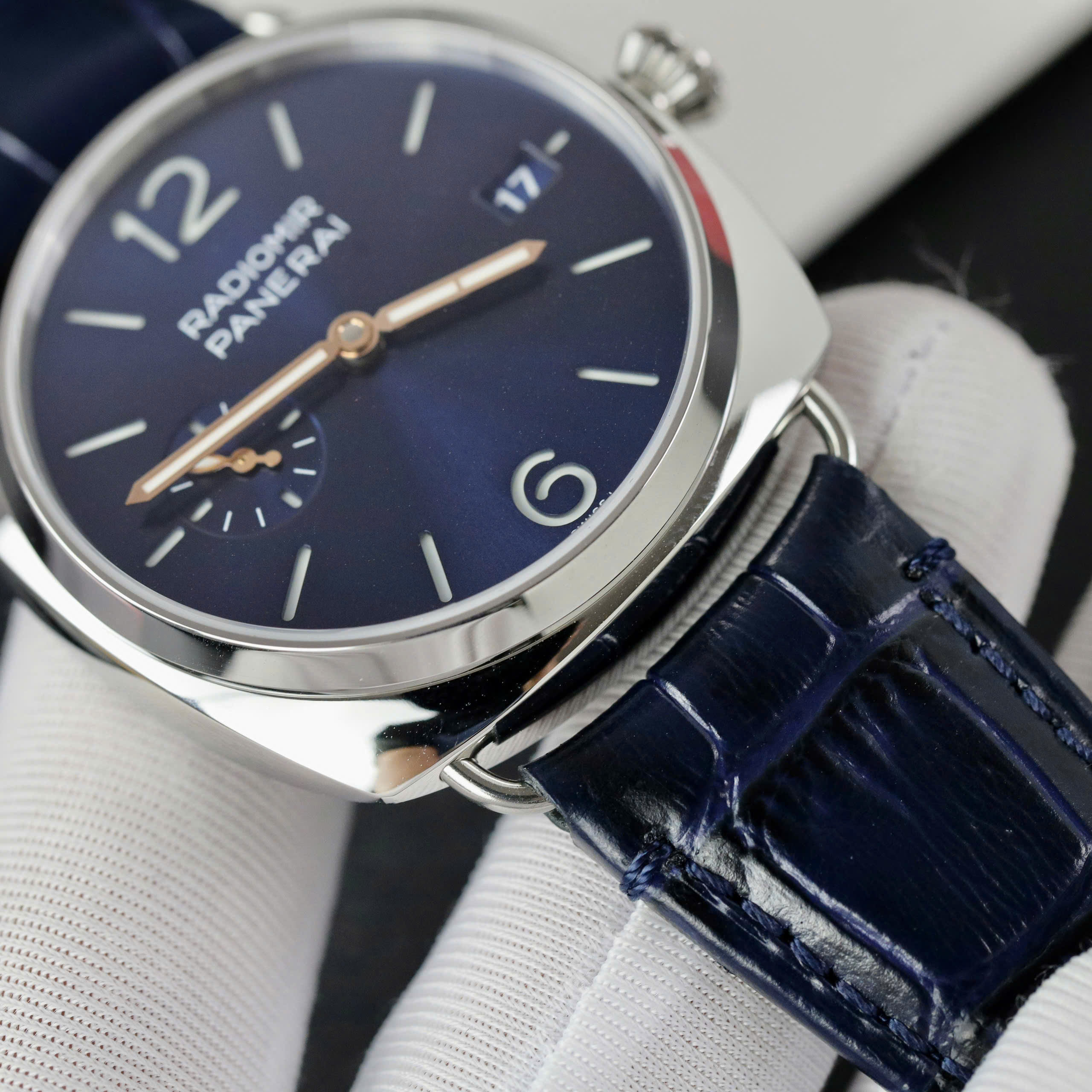 Panerai Gold Imitation Watches Radiomir Quaranta PAM01293 Dial Blue is a high-end watch model, combining classic and modern style, ideal for elegant gentlemen. With a sophisticated 40mm dial, durable Swiss automatic movement, stainless steel case and high-quality leather strap, the watch brings a luxurious and classy look. Scratch-resistant, anti-glare Sapphire glass increases convenience. The product is not only a timekeeping tool but also a symbol of style and class.