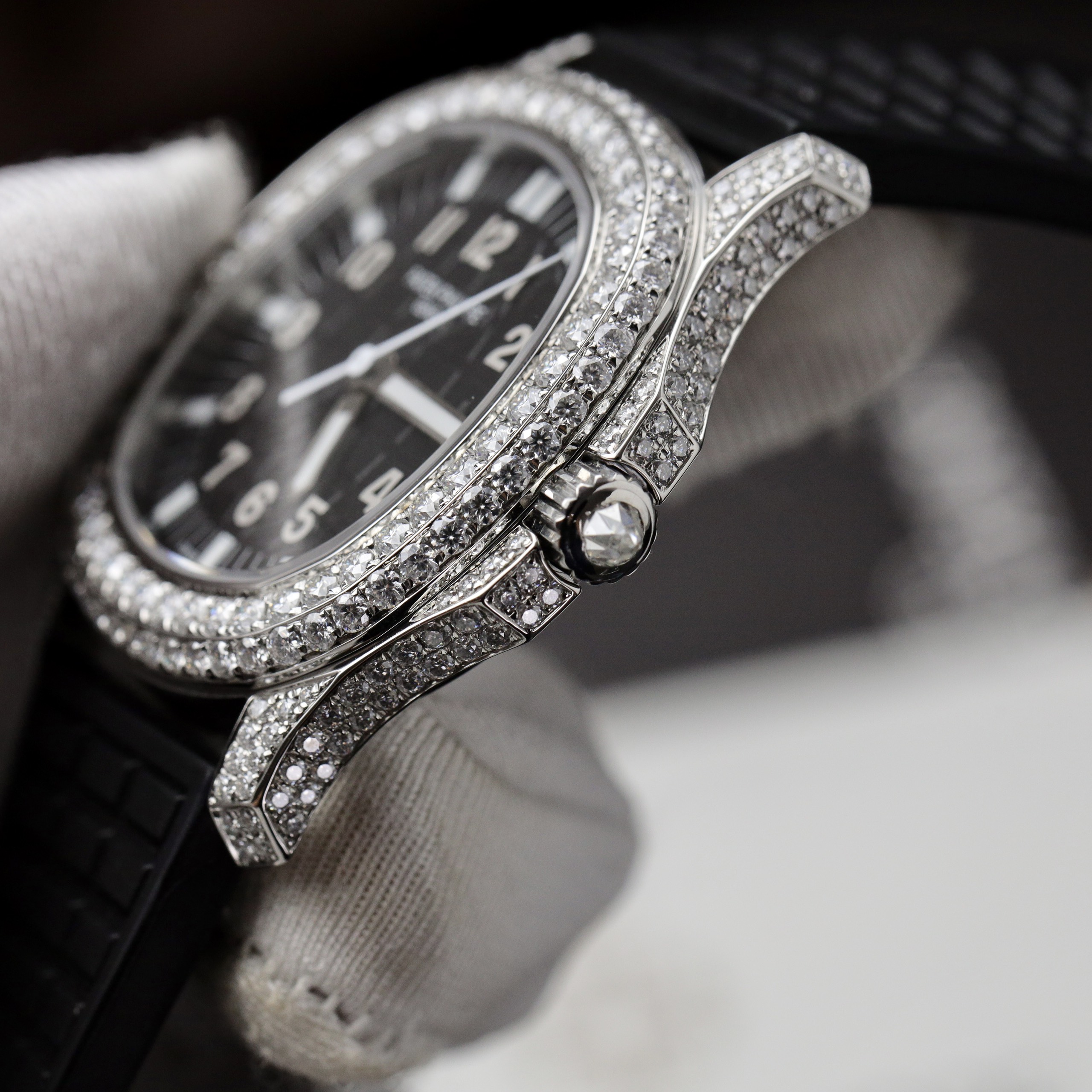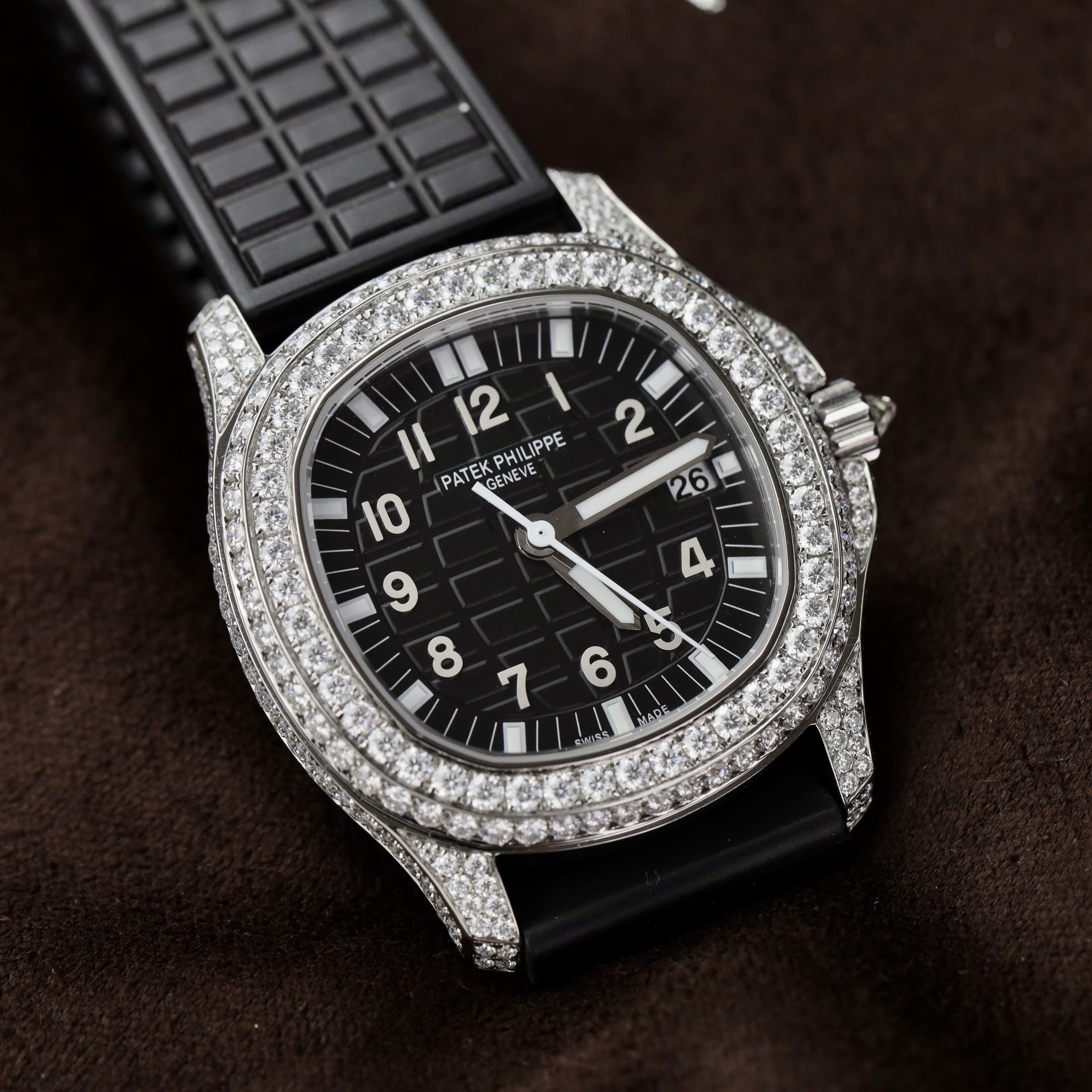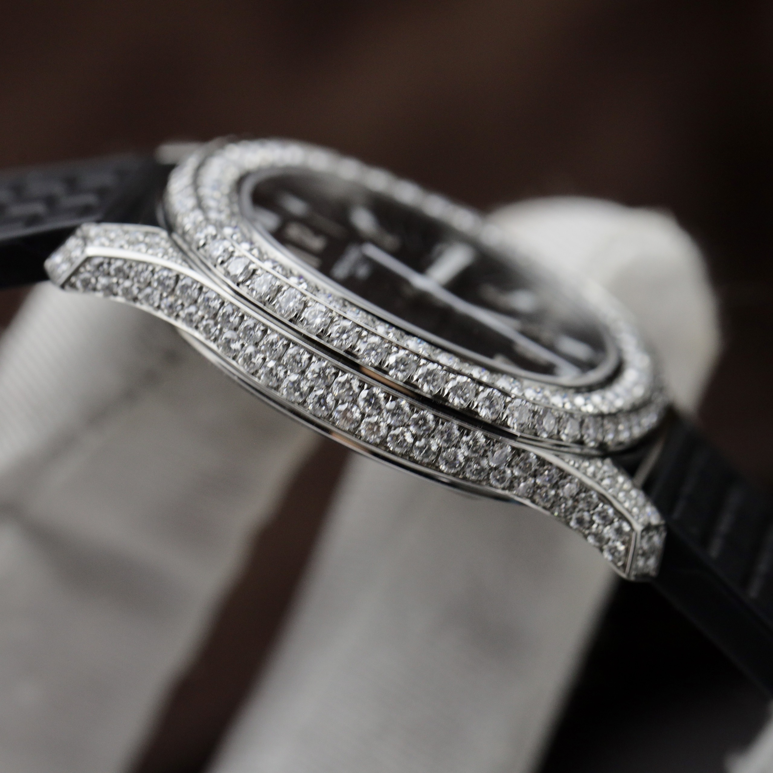 The Patek Philippe Aquanaut 5067 Black Customs Full Moissanite Diamonds, is currently available at DWatch Global.