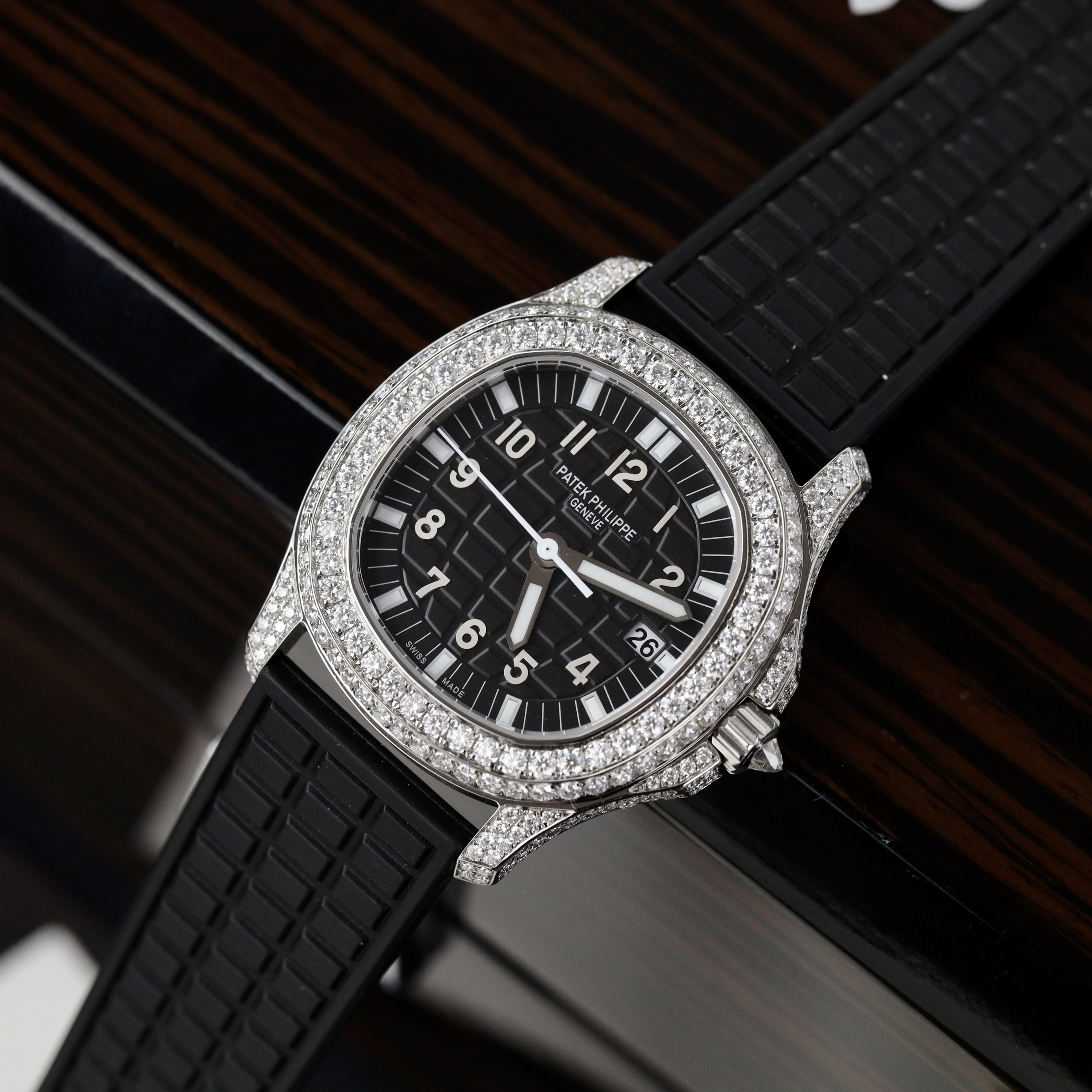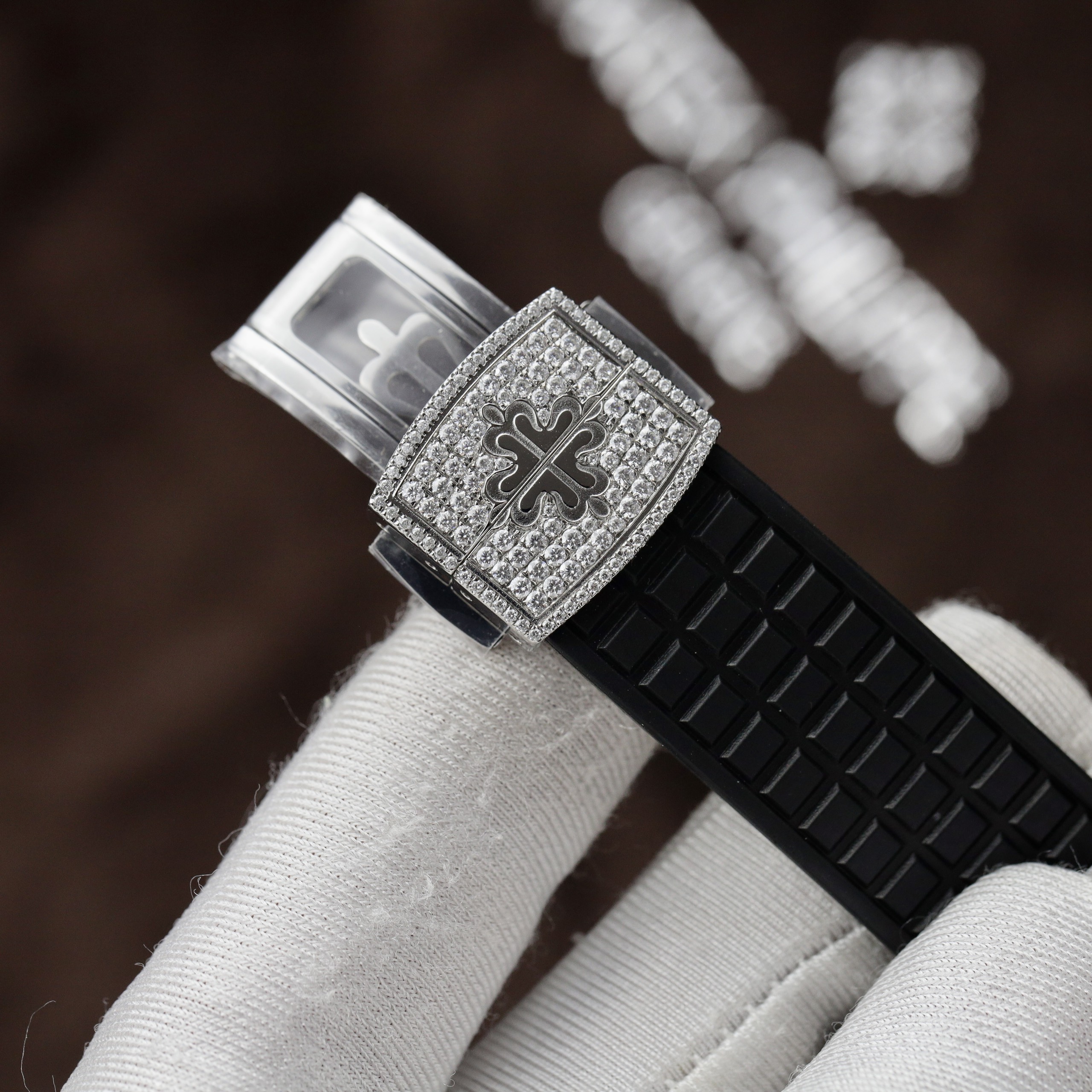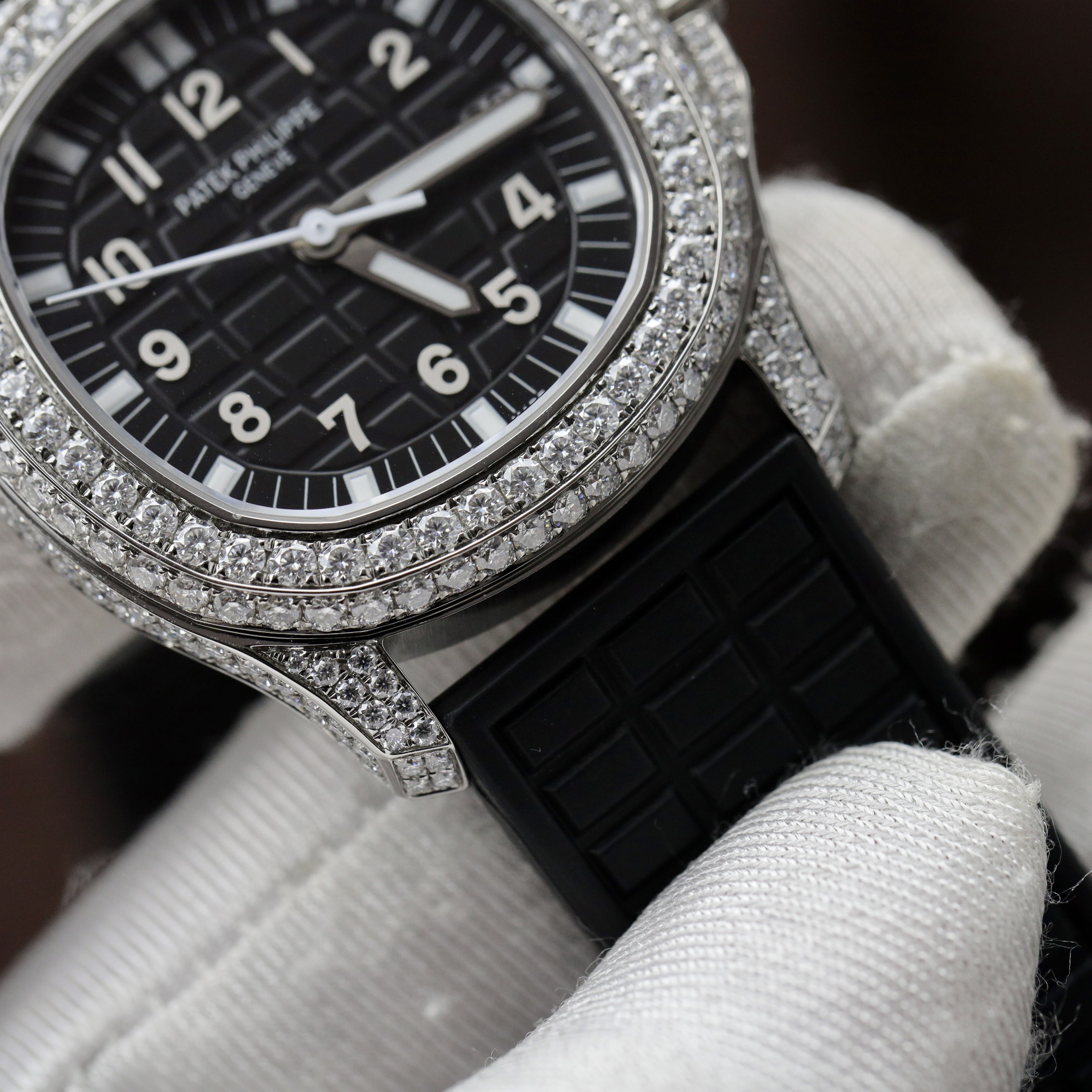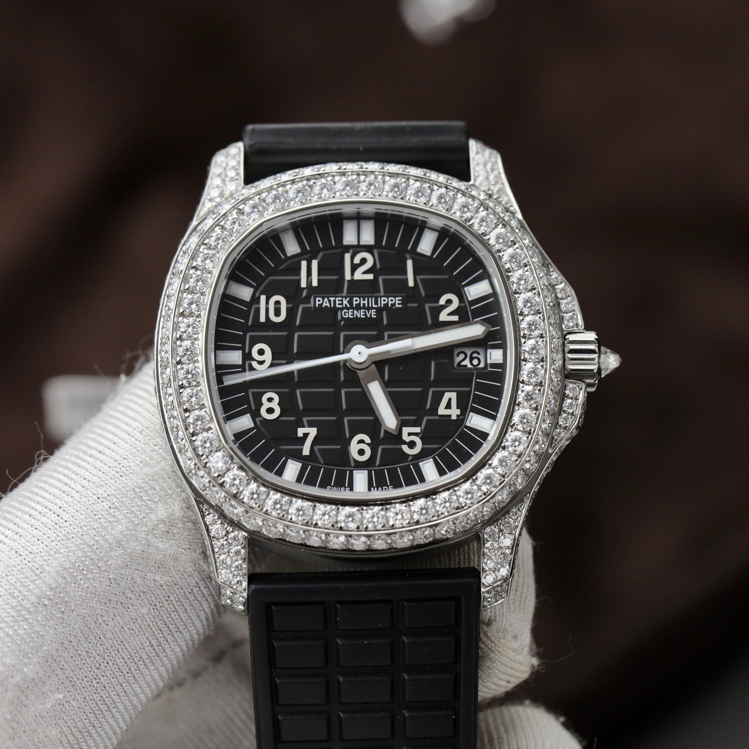 The Patek Philippe Aquanaut 5067 Black Customs Full Moissanite Diamonds, is currently available at DWatch Global.