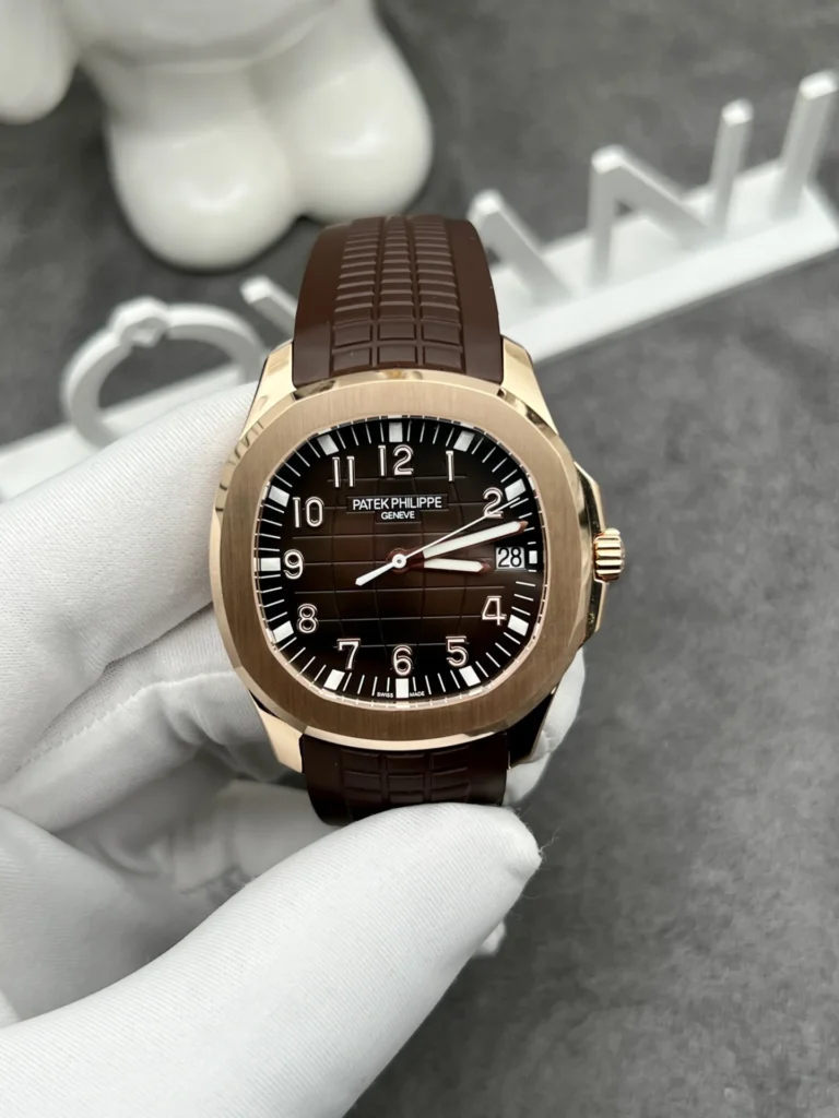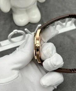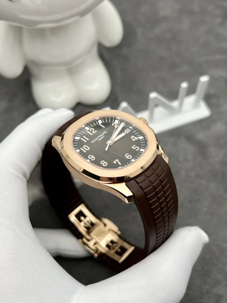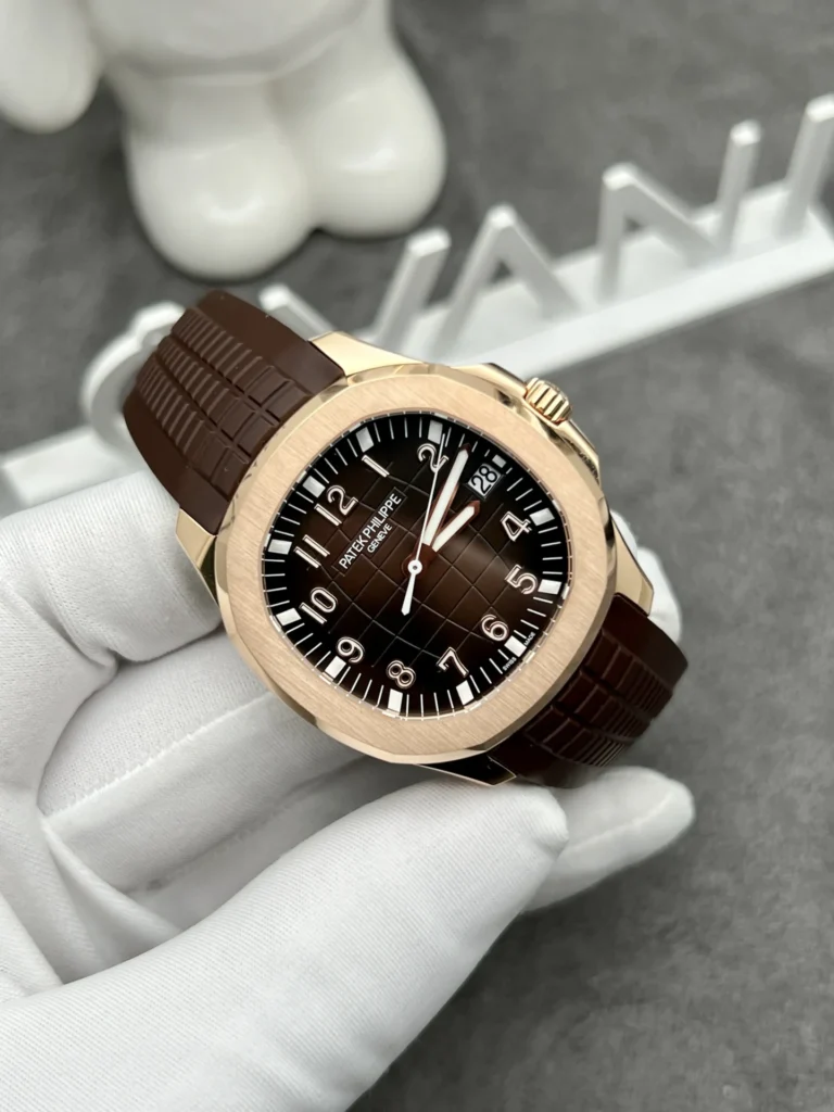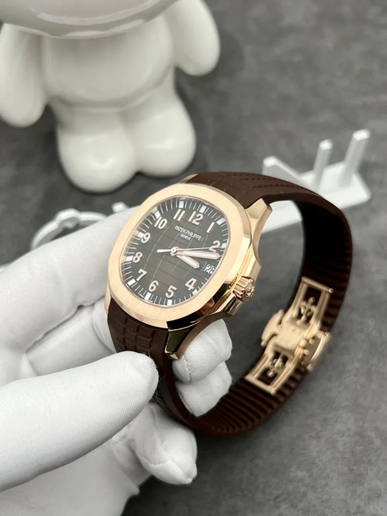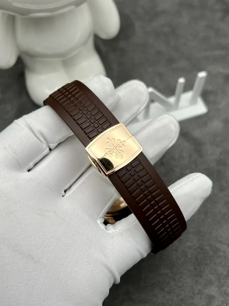 The dial of the Patek Philippe Aquanaut 5167R solid gold watch is adorned with soft, curved grooves, creating an attractive 3D-like effect. The earthy brown color is a perfect choice for this watch dial, with hour markers and hands crafted from rose gold. They will shine brightly under full light, creating dazzling highlights on the watch face.