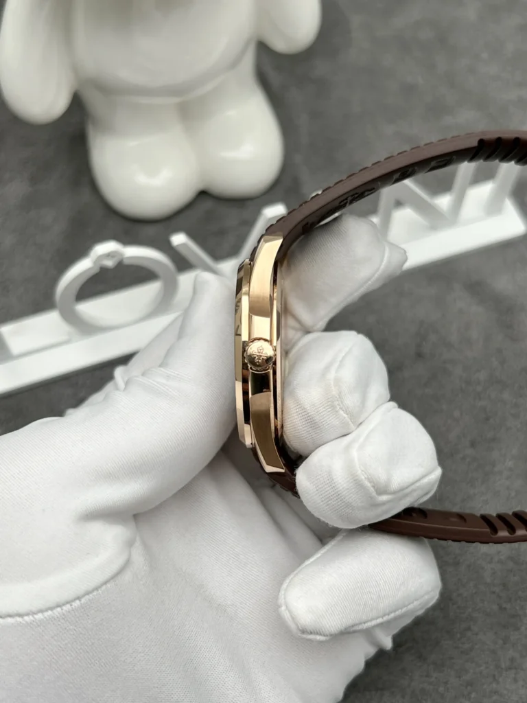 In wristwatch design, the diameter and thickness are crucial factors determining elegance. This replica watch, with a diameter of 40.8mm and a thickness of only 8.1mm, along with its solid rose gold material, creates a sense of lightness and sophistication when worn. The watch case is meticulously finished with brushed lines, maintaining its distinctive Cushion shape.