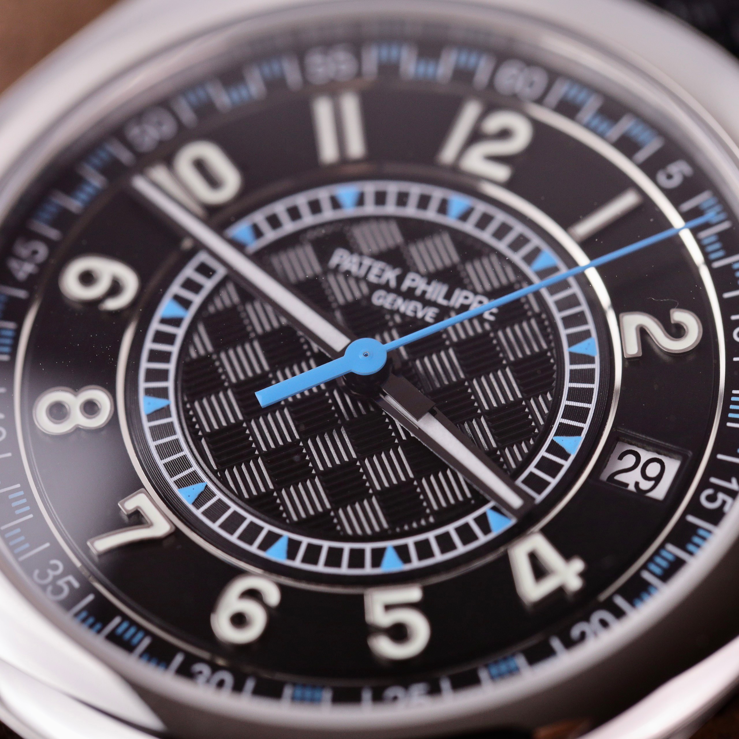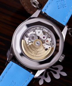 This year’s Calatrava 6007G-011 model still retains the characteristics of the Calatrava line but brings a sense of strength with its blue color on the dial and strap. The dial is more detailed and diverse than other Calatrava models, with large Arabic numeral hour markers coated with white luminescent material.