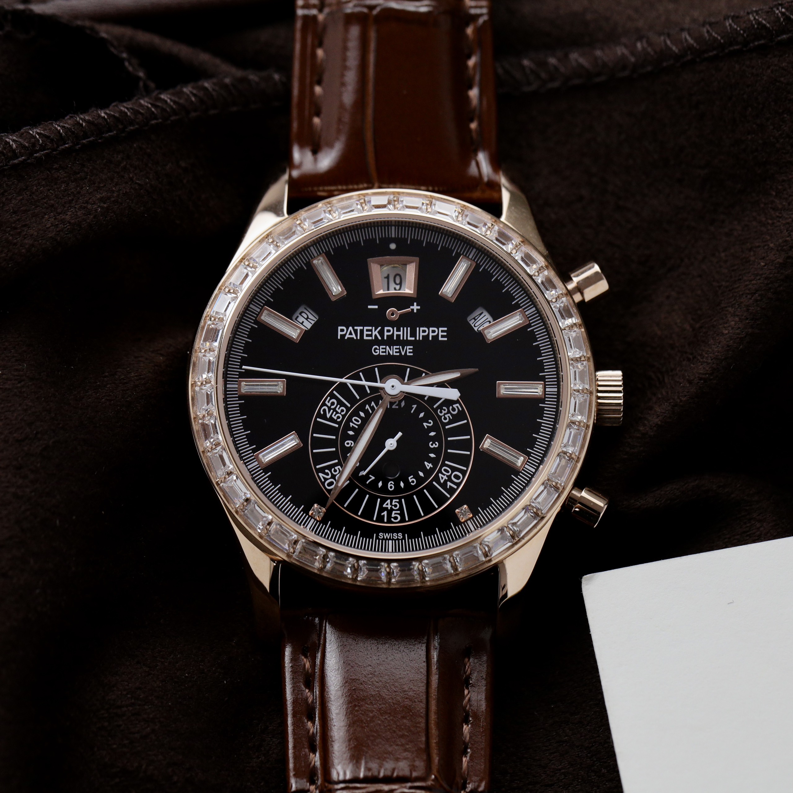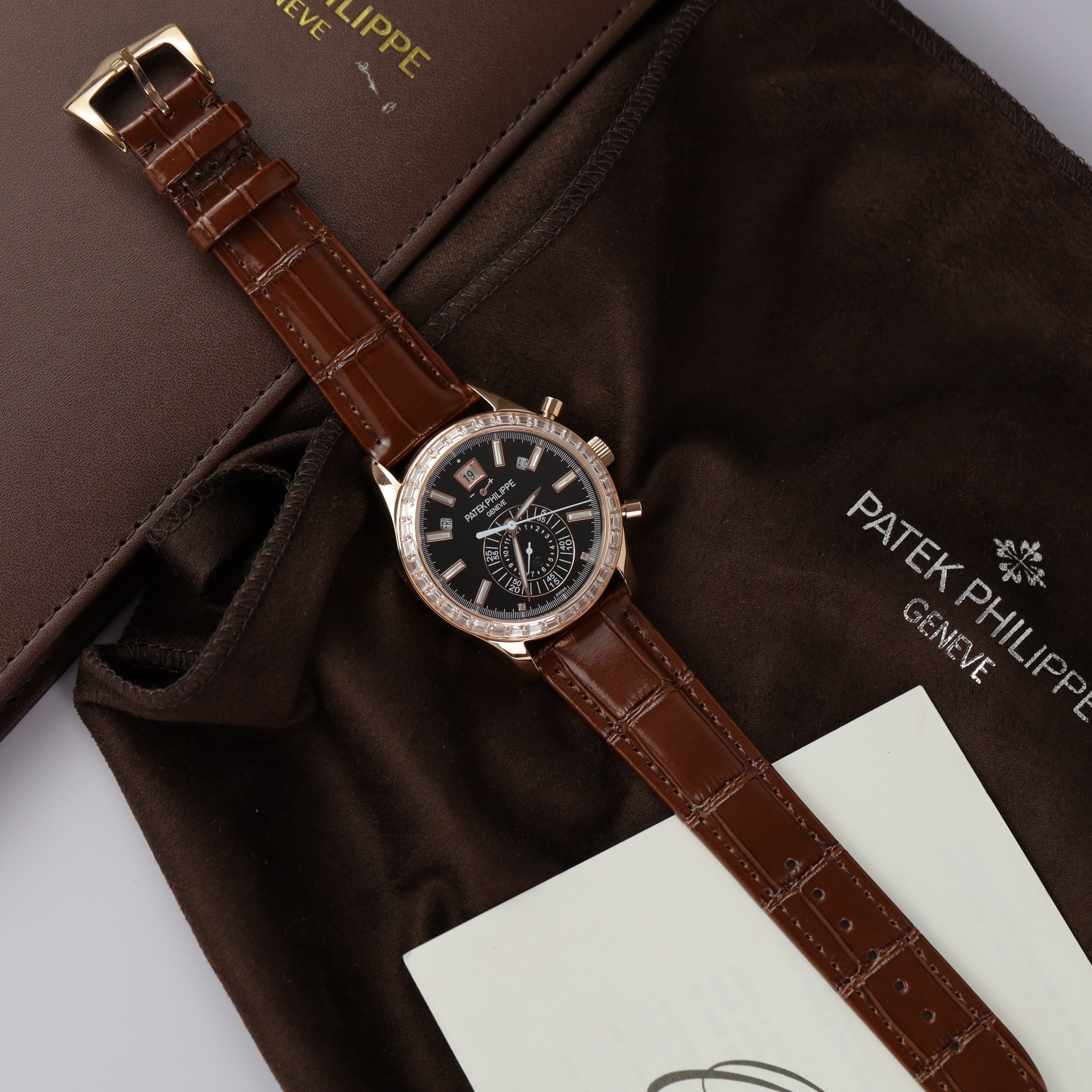 This replica watch is crafted from pink gold-plated steel, with a bezel set with 36 baguette-cut diamonds, enhancing its luxurious and opulent appearance. The time-setting crown and chronograph pushers are also pink gold-plated and feature the Patek Philippe logo.