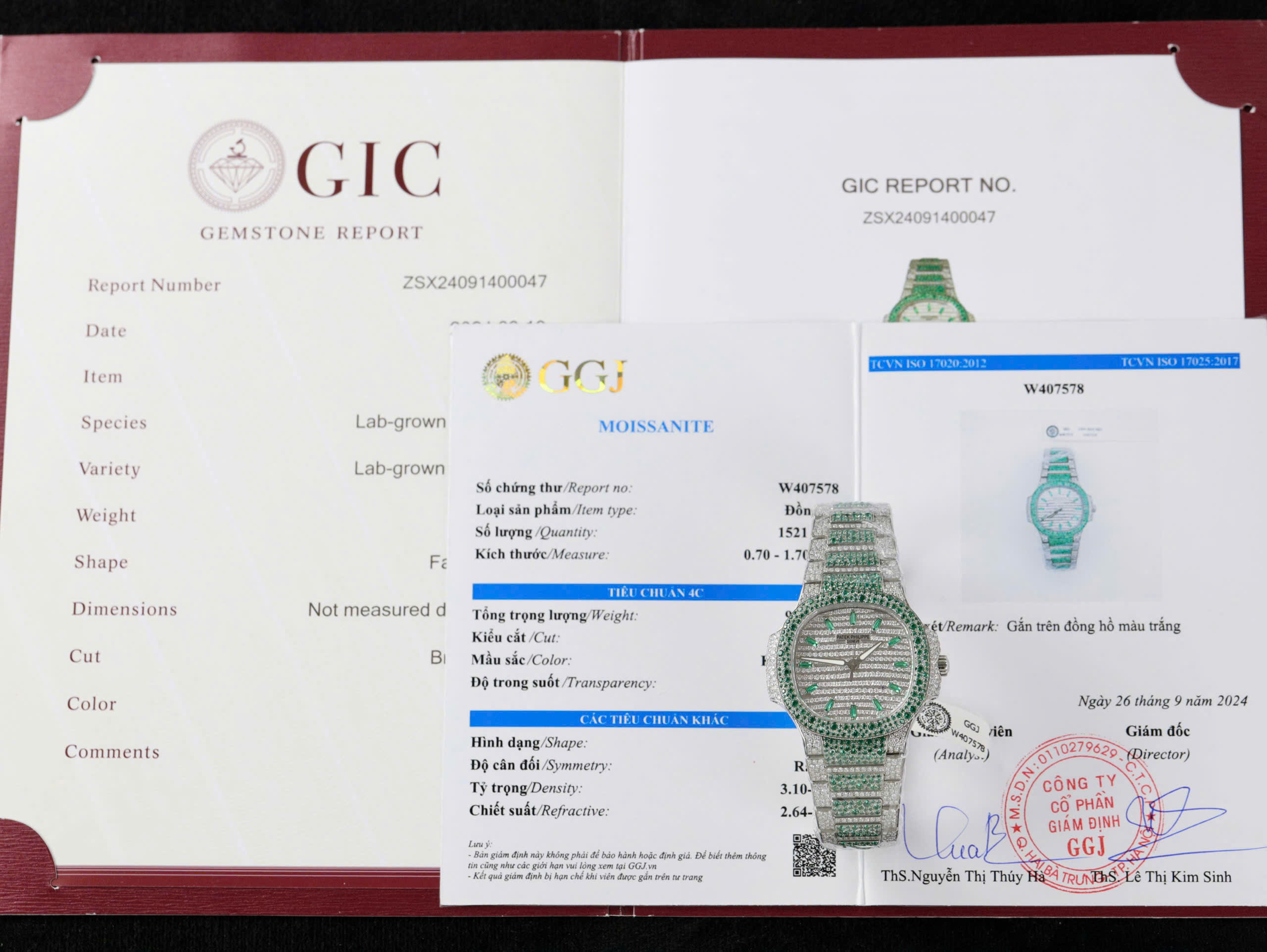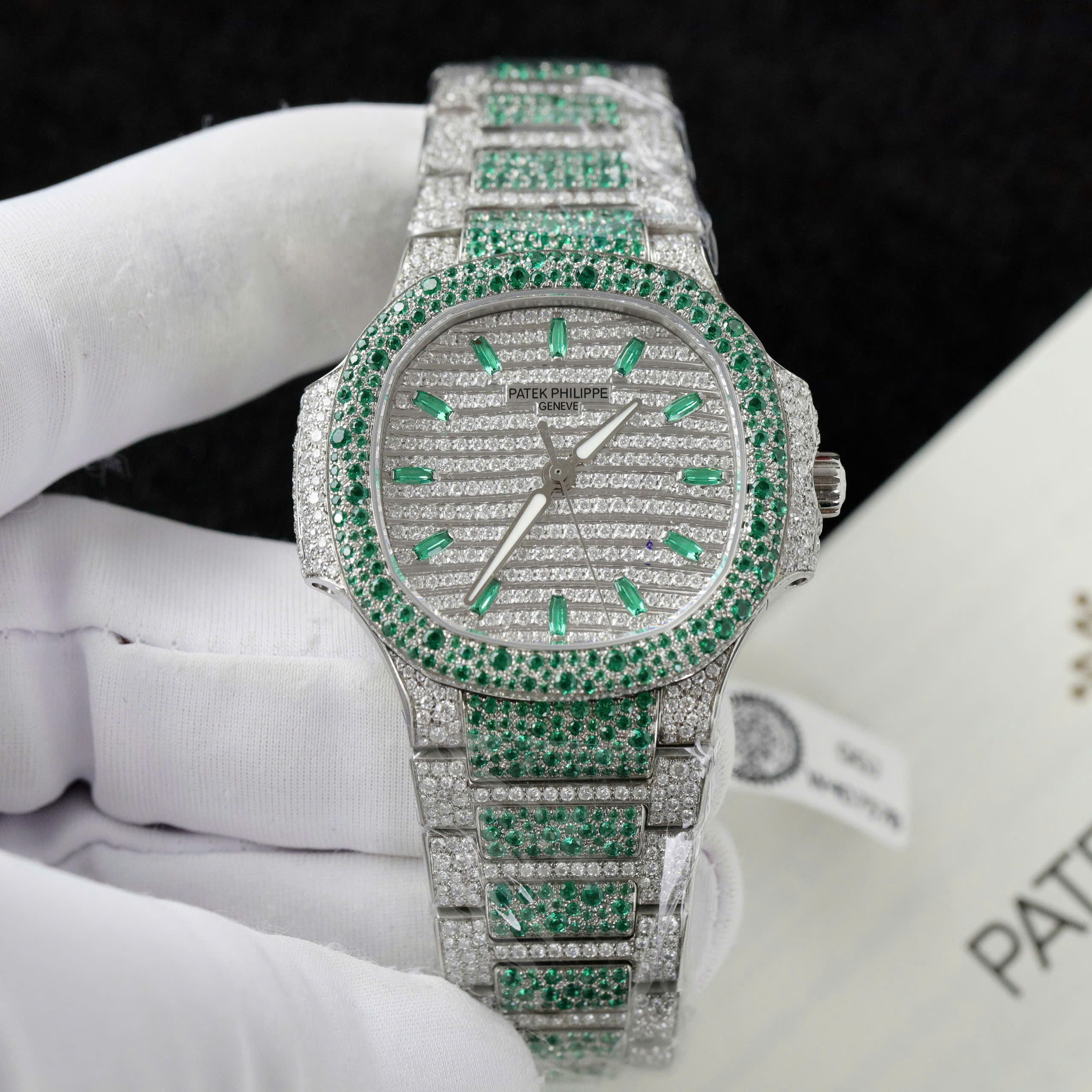 The entire case frame made of premium 904L steel shines brightly, along with the octagonal bezel adorned with sparkling Moissanite diamonds, creating an impressive and elegant appearance. The dial with 12 hour markers and 3 hands is also made of high-quality stainless steel, coated with luminescent material for good light reflection, creating a very attractive look.