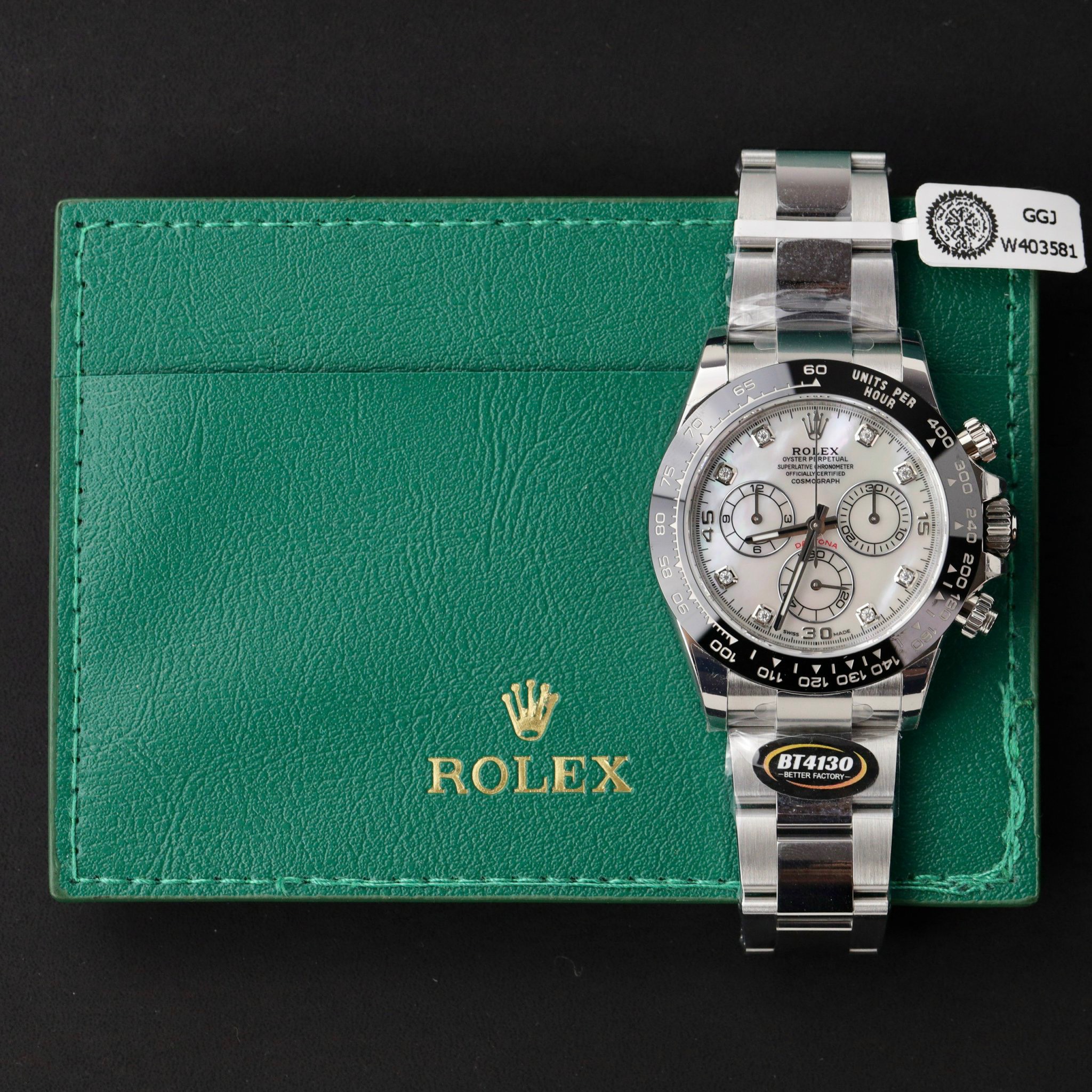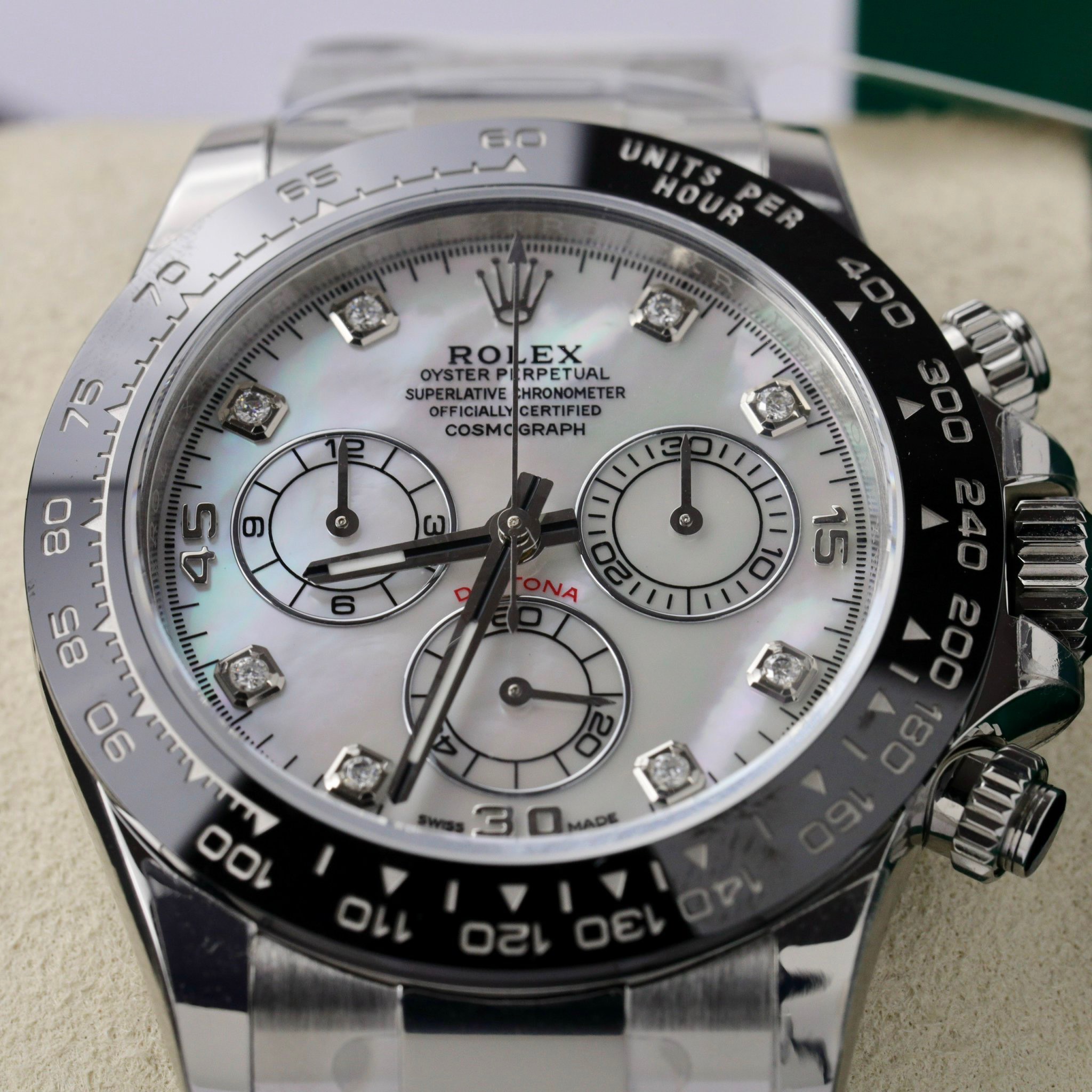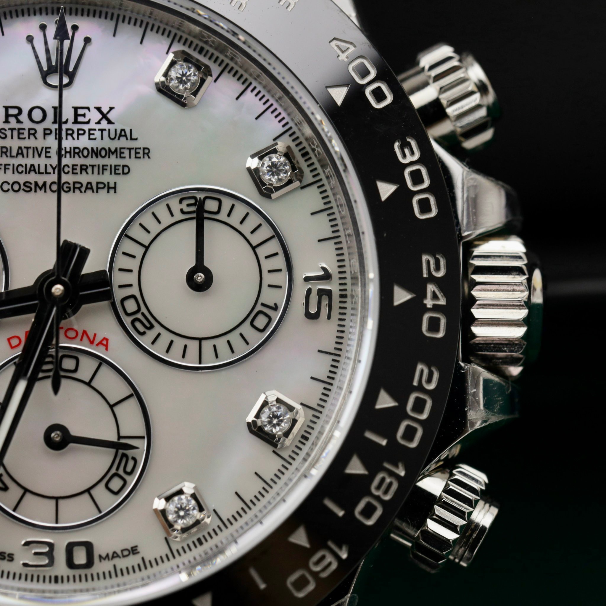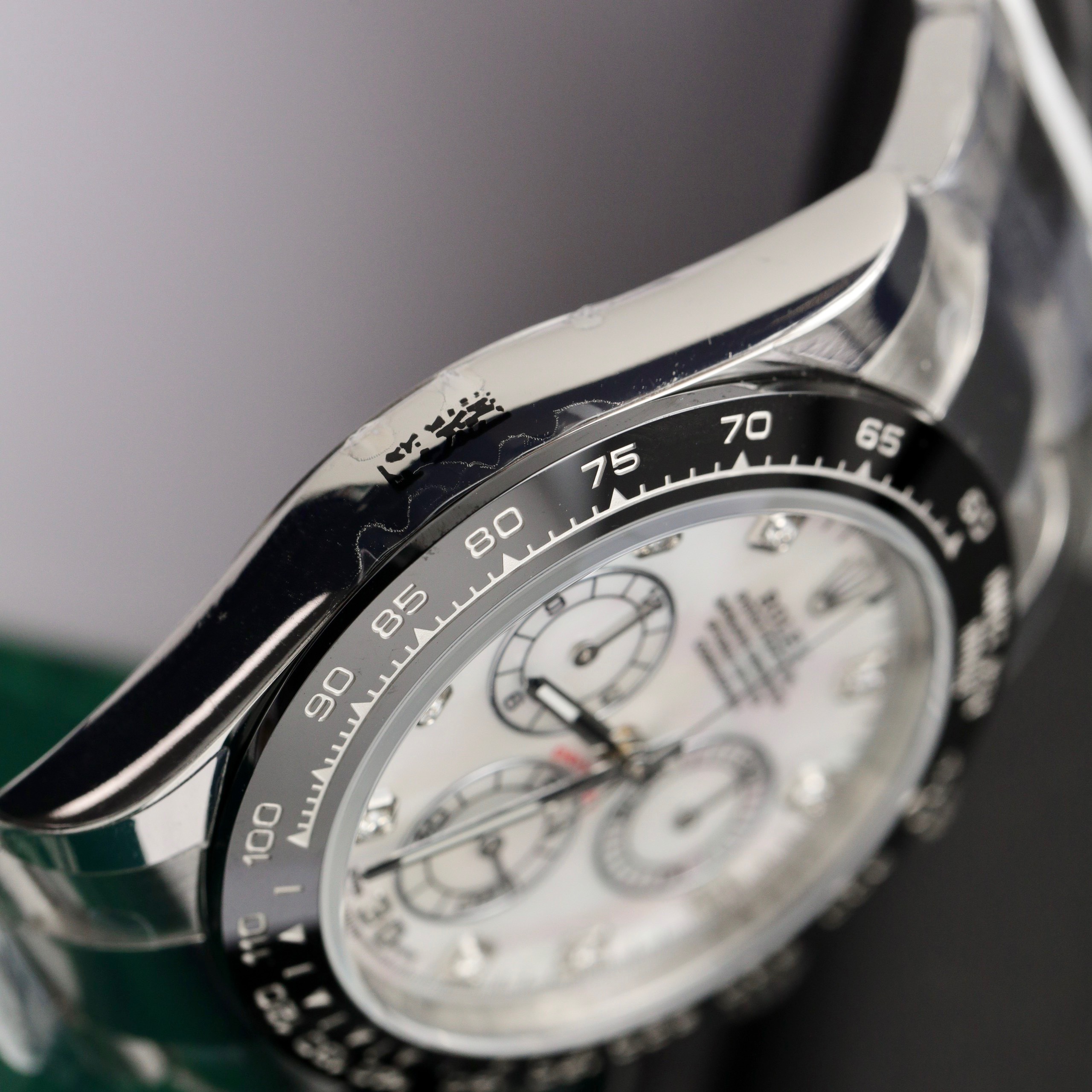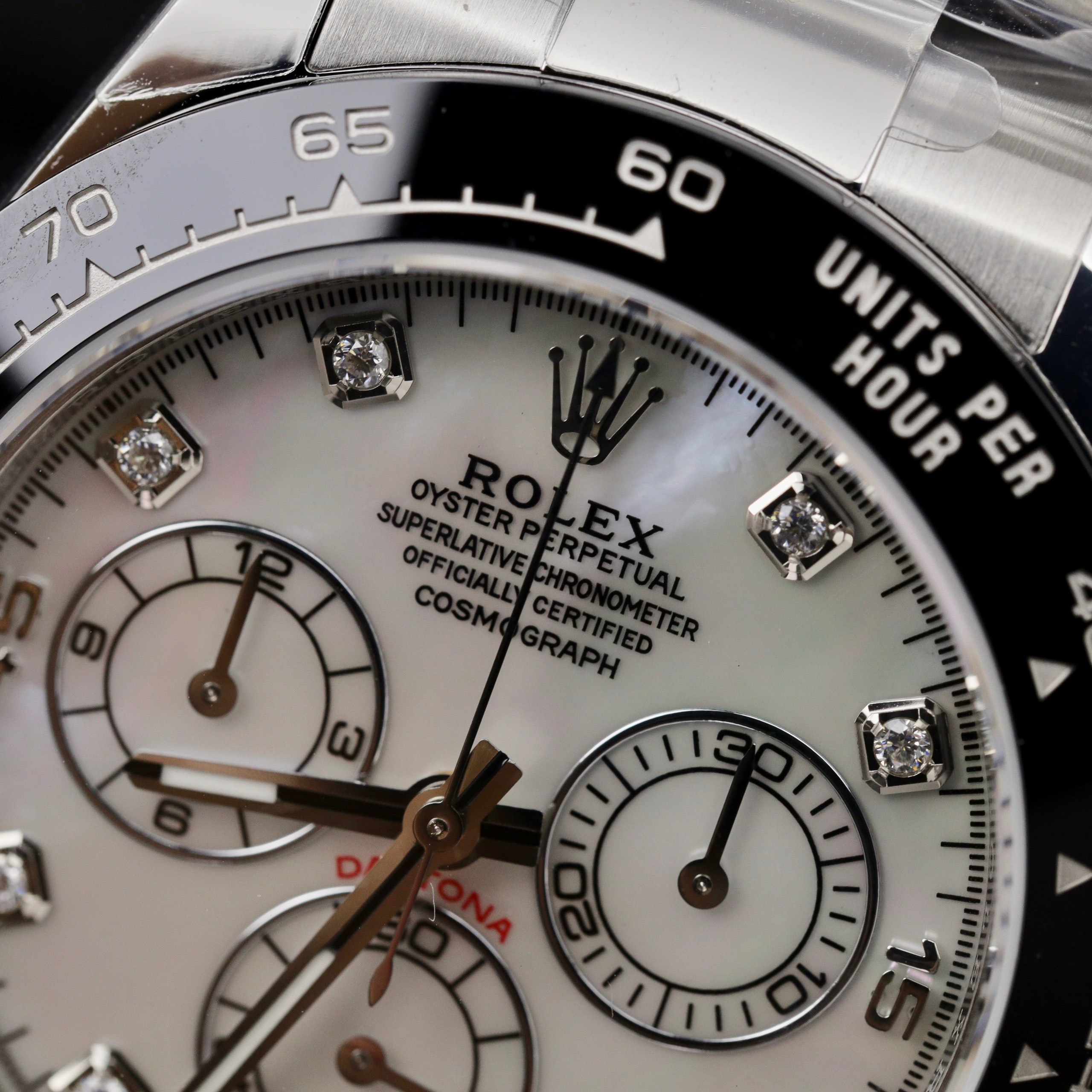 Rolex Cosmograph Daytona 116500LN Mother Of Pearl Dial Customs Moissanite is available at DWatch Global.