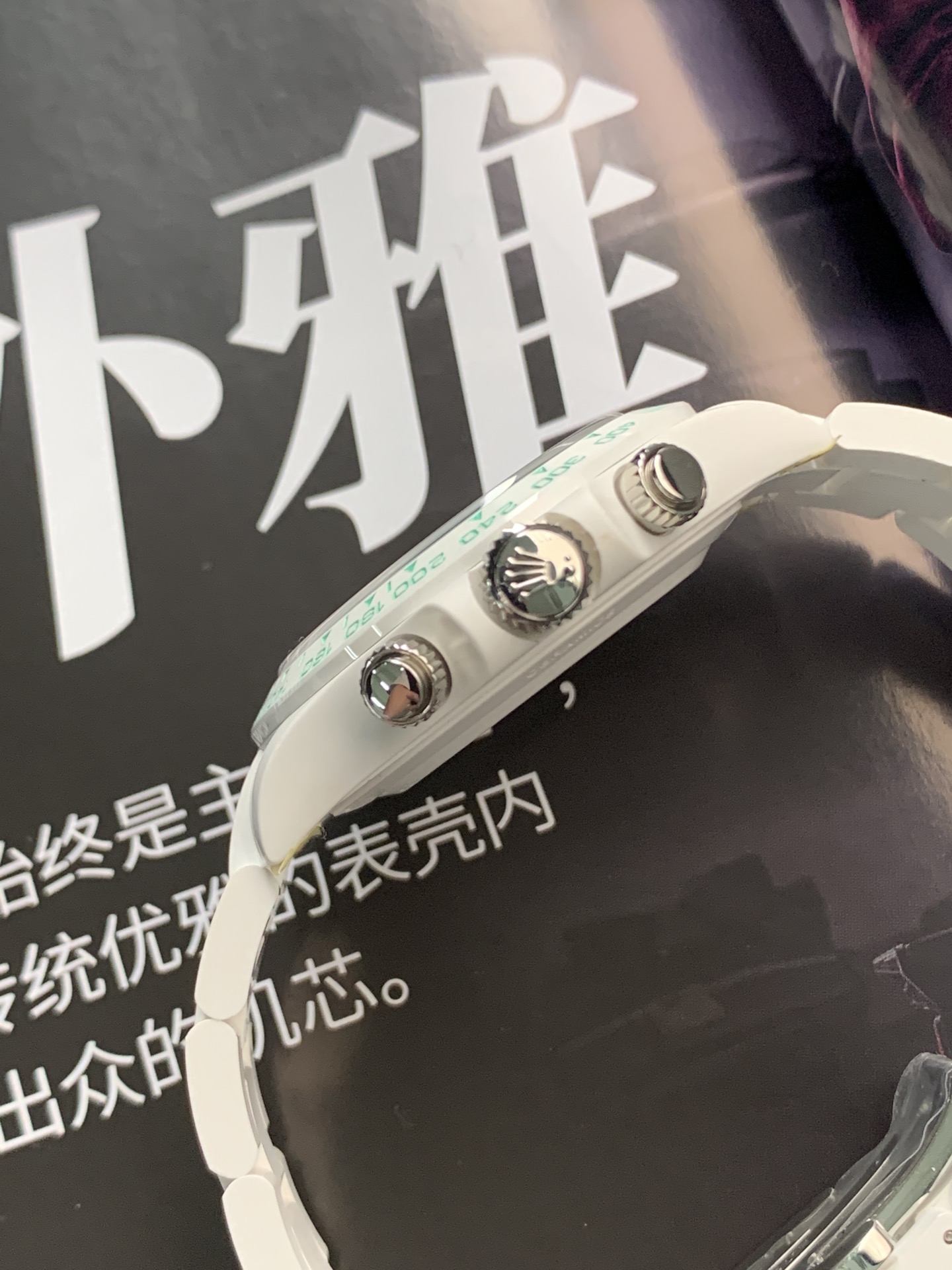 The Biscay Green color is used to decorate both the watch bezel and the Rolex watch face. All three small dials also feature the Biscay Green color, complemented by white chronograph hands and luminescent material, creating a fresh, natural, comfortable, and cool sensation. Therefore, even though the small dials are not embellished with other decorative techniques, only separated by a silver-tone bezel and watch face, the watch still leaves a strong visual impression on the viewer, captivating them from the first glance.