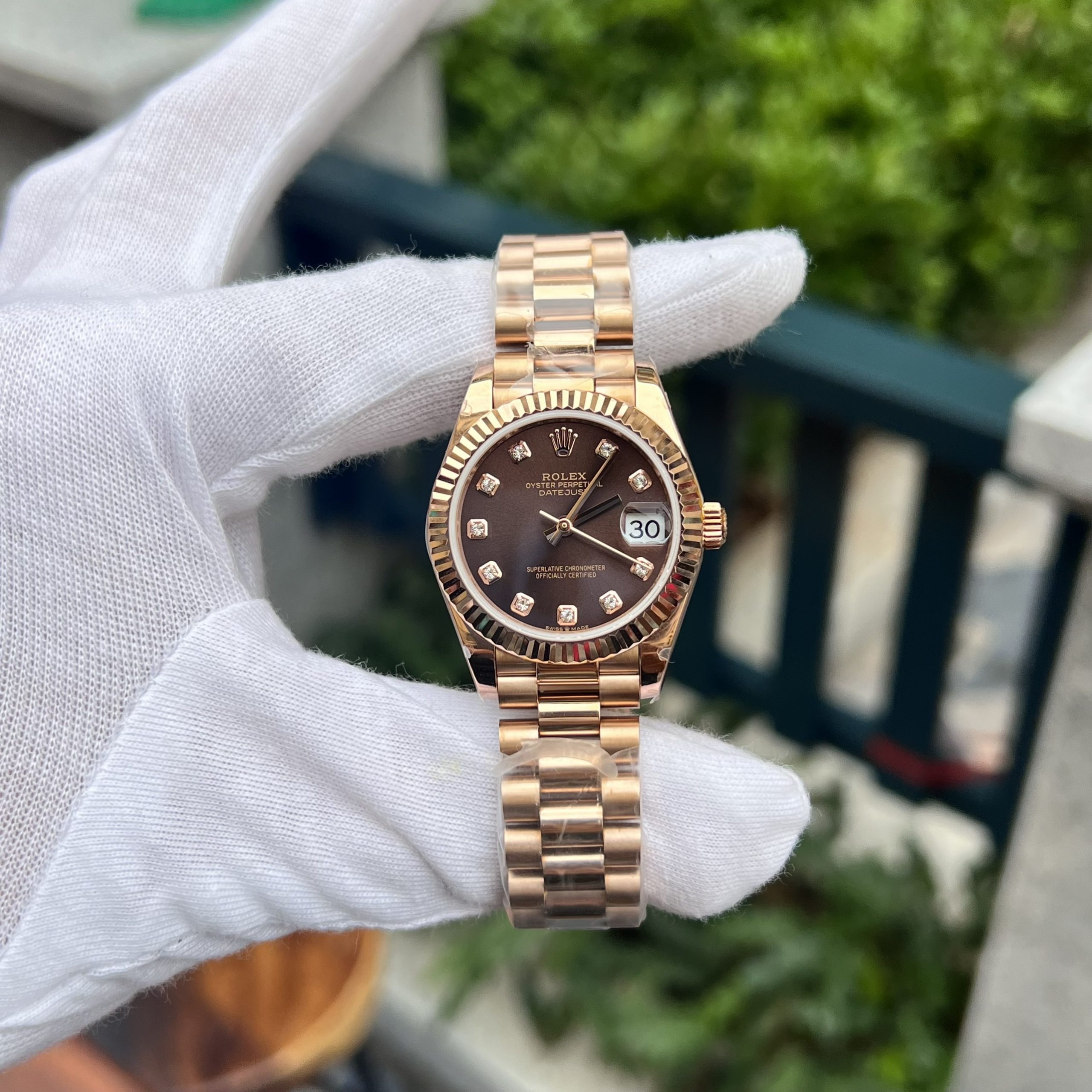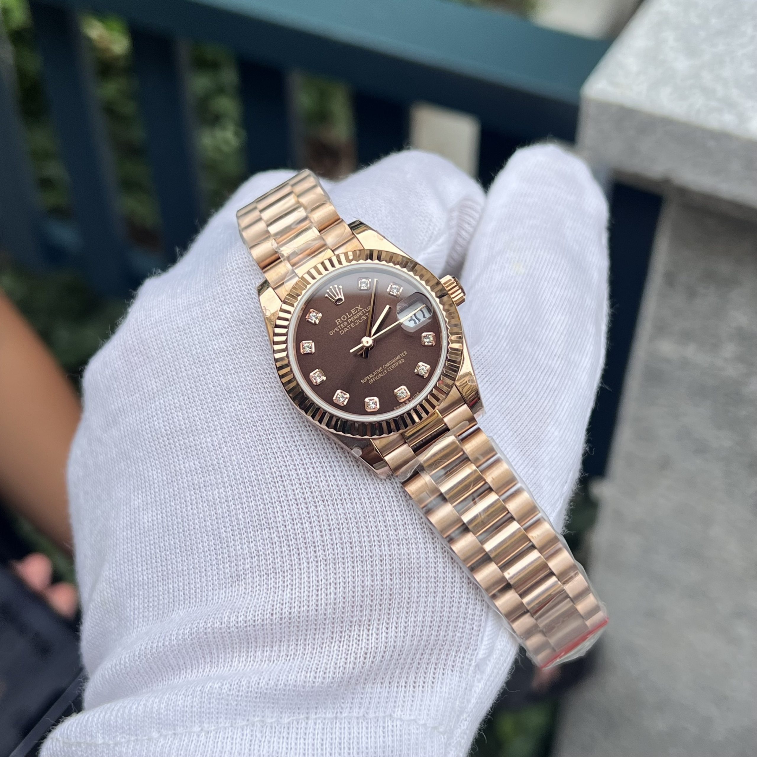 While the Rolex Datejust 36mm and 41mm are designed for men, the Rolex Datejust 31mm is the perfect choice for ladies. The premium Rolex Datejust women’s watch 278275 Replica, currently available at DWatch Luxury, is beautiful and elegant with an Everose gold case and a President bracelet, distinguishing it from the Jubilee bracelet. To celebrate the brand’s 40th anniversary, Rolex introduced a women’s Datejust watch with a classic design. The President bracelet, a distinctive feature on the current premium chocolate dial Rolex Datejust Replica Watches, has only 3 links, making the watch more luxurious and displaying a sense of sophistication. The 31mm size of the Datejust 278275 looks feminine, but the rose gold President bracelet adds a touch of personality. The polished center link on the bracelet is a sparkling highlight alongside the metal indices on the watch’s bezel.