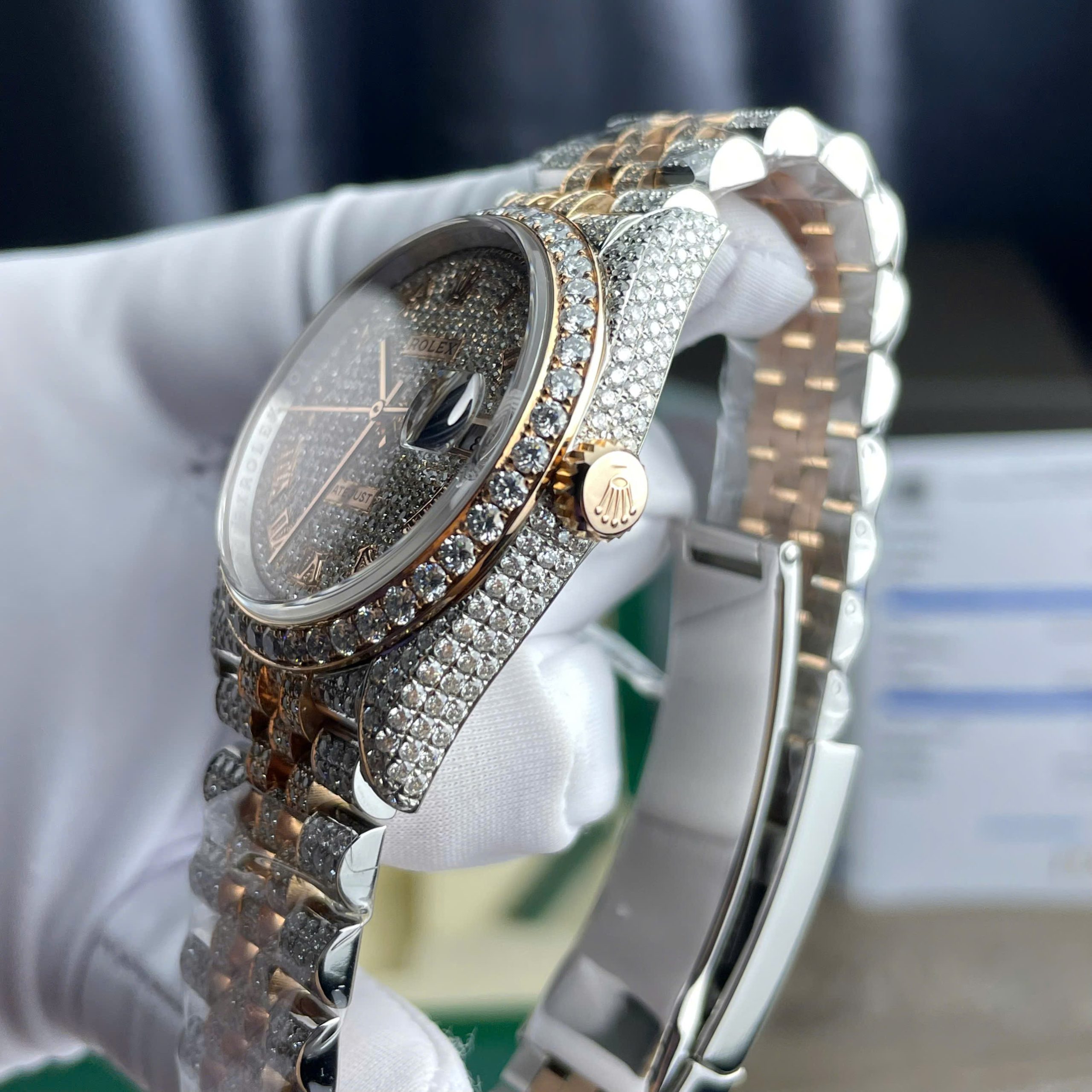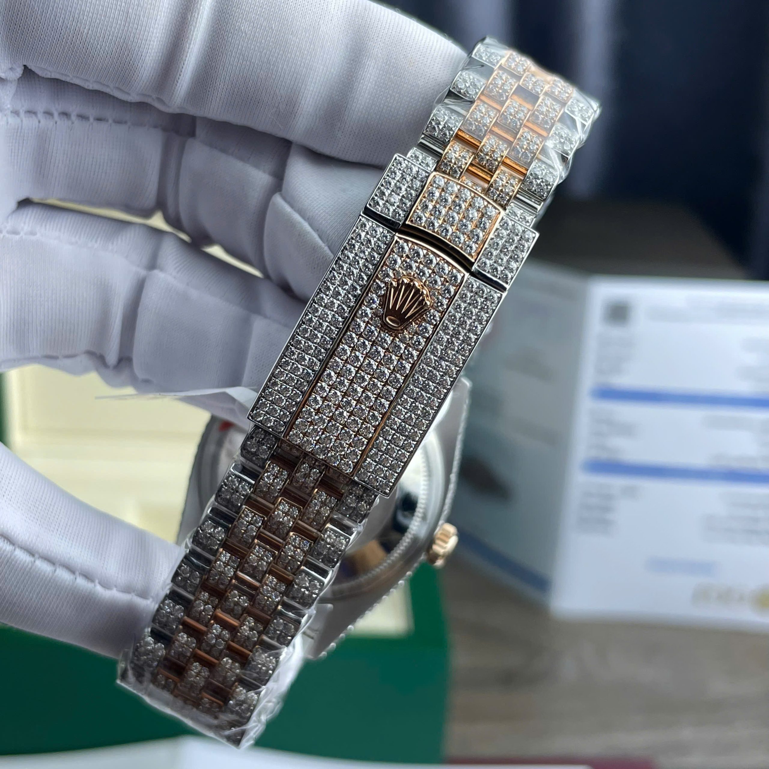 With its elegant design and high aesthetics meticulously crafted, the Rolex watch adorned with Moissanite diamonds is truly a watch for distinguished customers. Whether you’re attending luxurious parties or business meetings, you’ll always stand out and shine with the Full Diamond Rolex Watch.