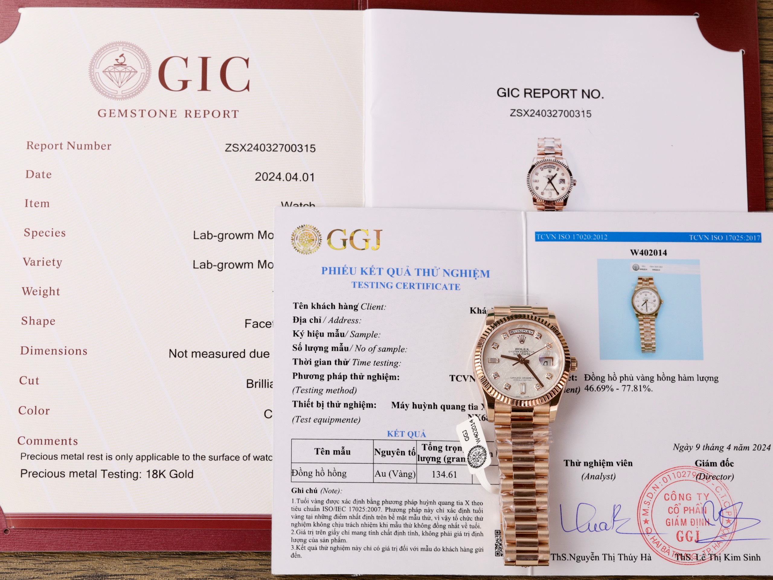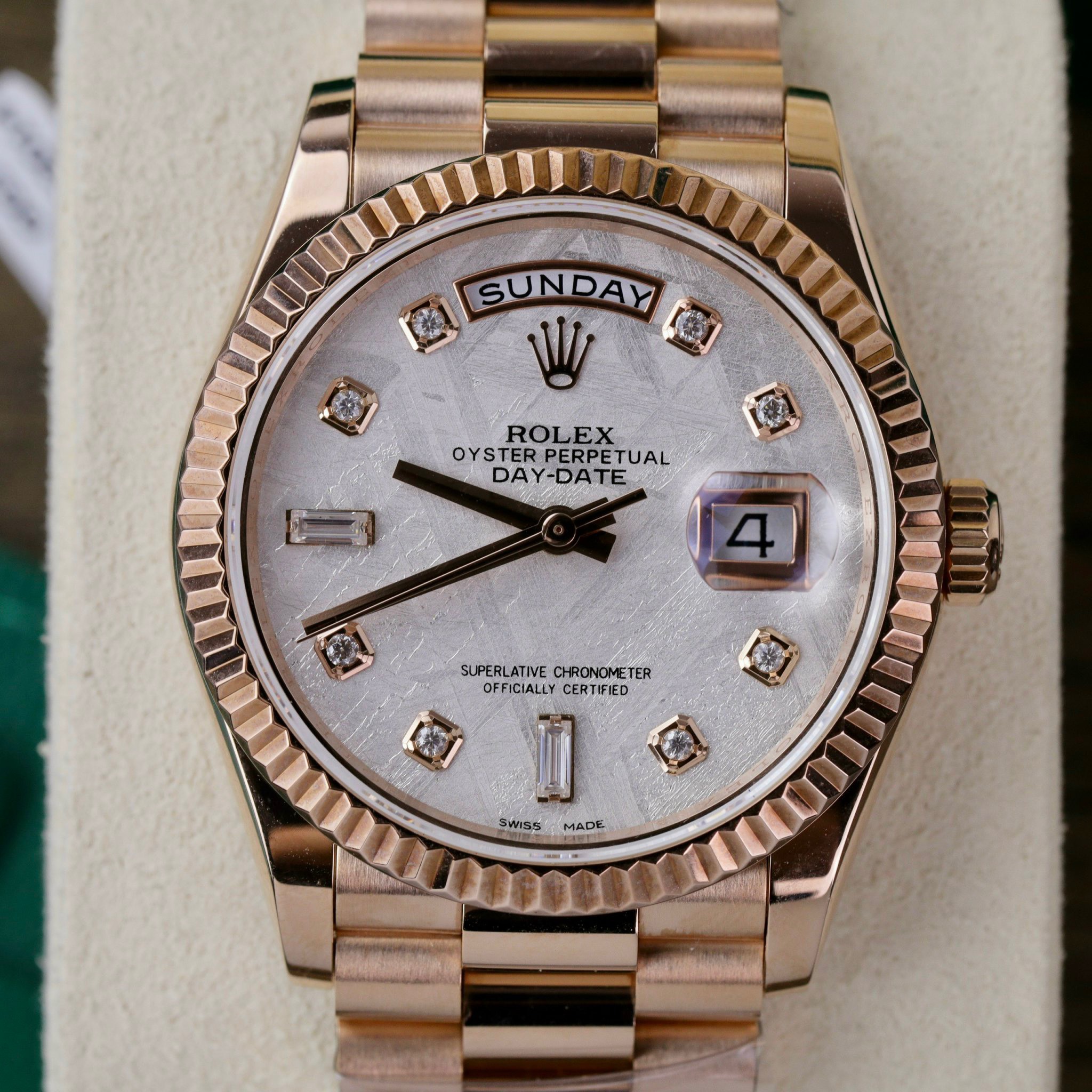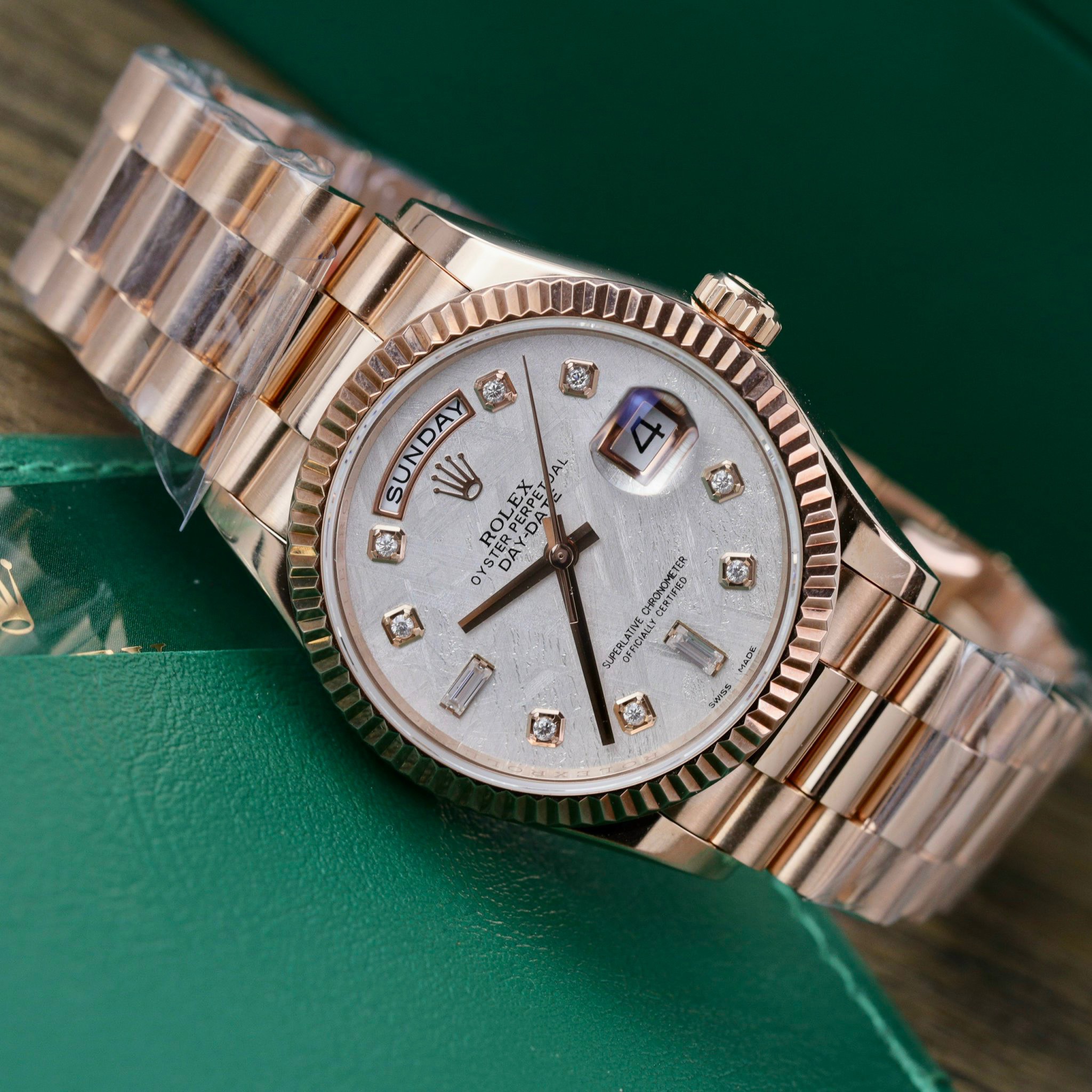 The Rolex Day-Date 128235 is a modern-era timepiece. The Rolex Day-Date 128235 18K Gold Wrapped Custom Meteorite Dial & Moissanite Diamonds Indexes at DWatch Global features a case crafted from Everose pink gold-wrapped steel, a blend emitting a slightly orange-tinged pink hue that’s captivating. However, what truly sets this watch apart is its dial, made from meteorite stone. From the original meteorite, Chinese craftsmen have processed and crafted a premium meteorite dial, enough to be set atop meticulously selected Moissanite diamonds. Each diamond marker, serving as hour markers on the Rolex Day-Date 118235, is encased in an additional gold rim. Positioned at 3 and 12 o’clock are the day and date windows—elements that have remained unchanged for nearly 70 years, defining the Day-Date name.