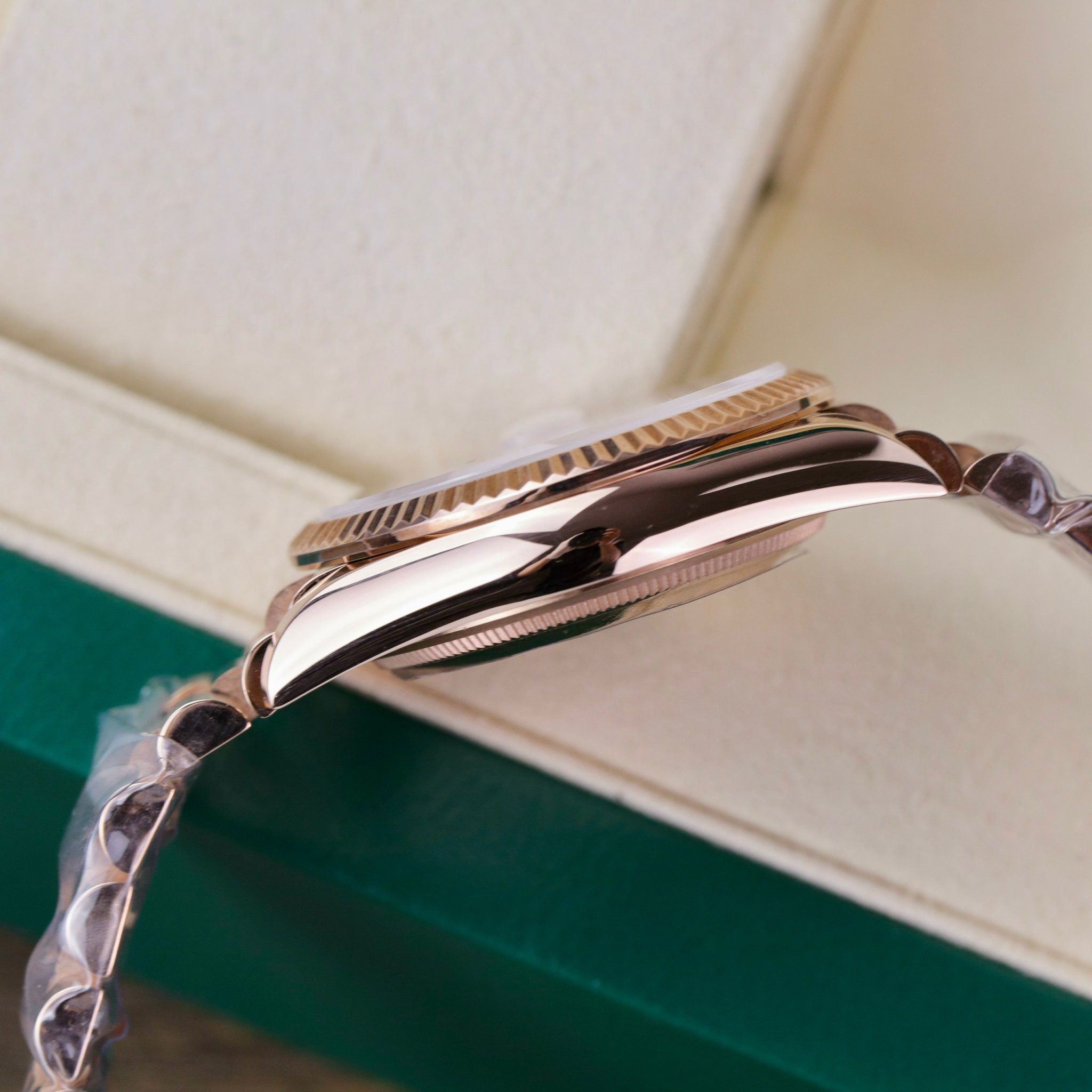 The watch features a fluted bezel, a petite winding crown, and the solid President bracelet, all wrapped in 18K rose gold