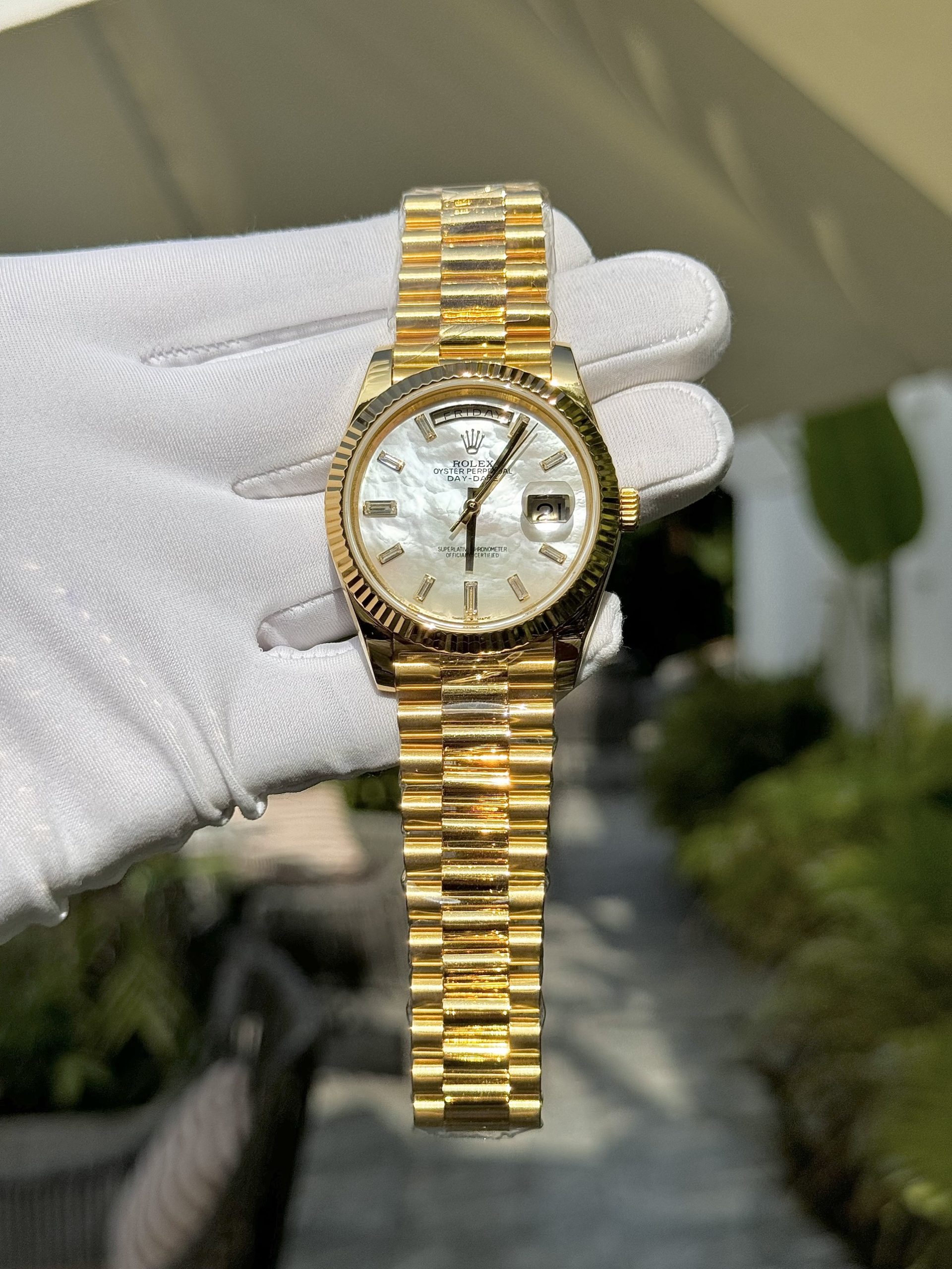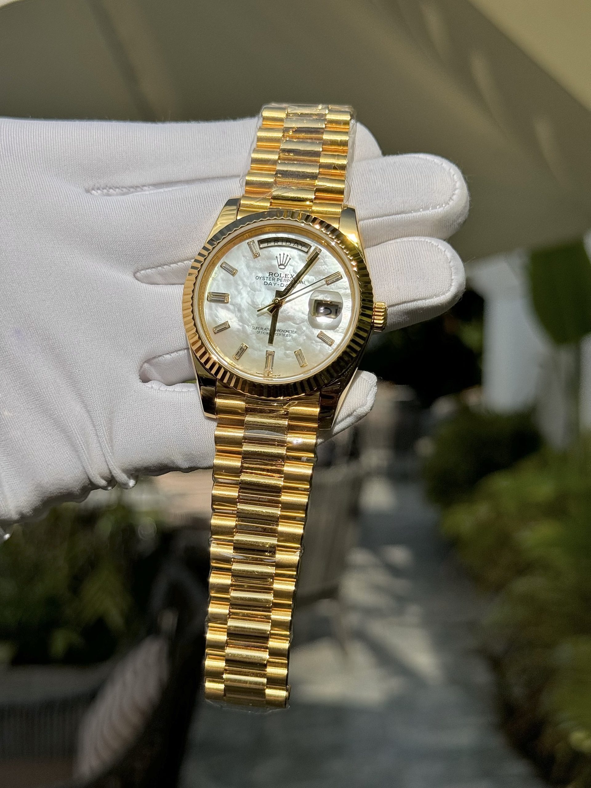 Rolex Day-Date Gold Wrapped Customs Mother Of Pearl Dial & Moissanite GM V3 is available at DWatch Global.