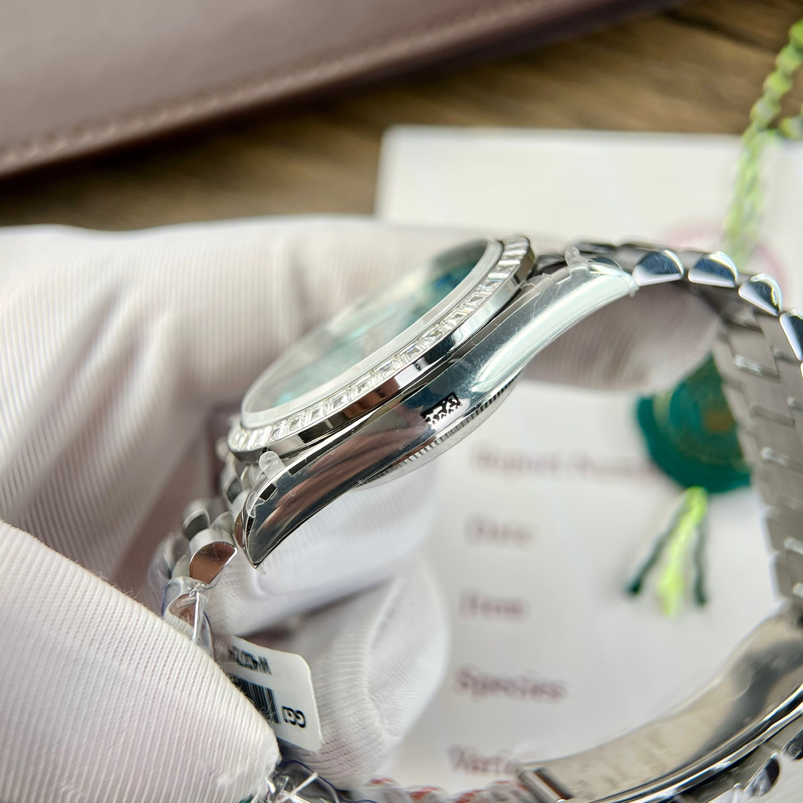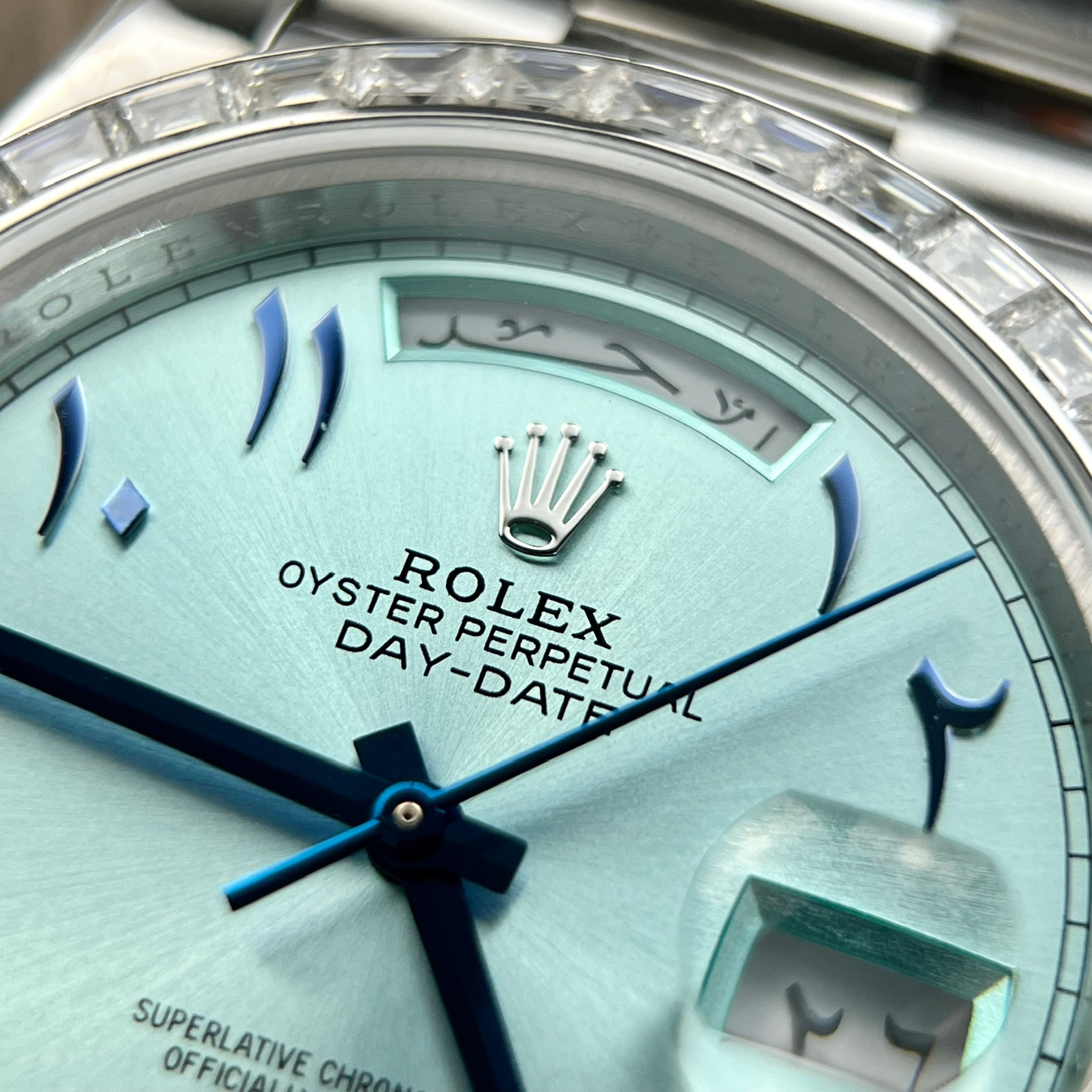 Rolex Day-Date Ice Blue Arabic Dial Custom Moissanite Diamonds Bezel GMF is available at DWatch Global.