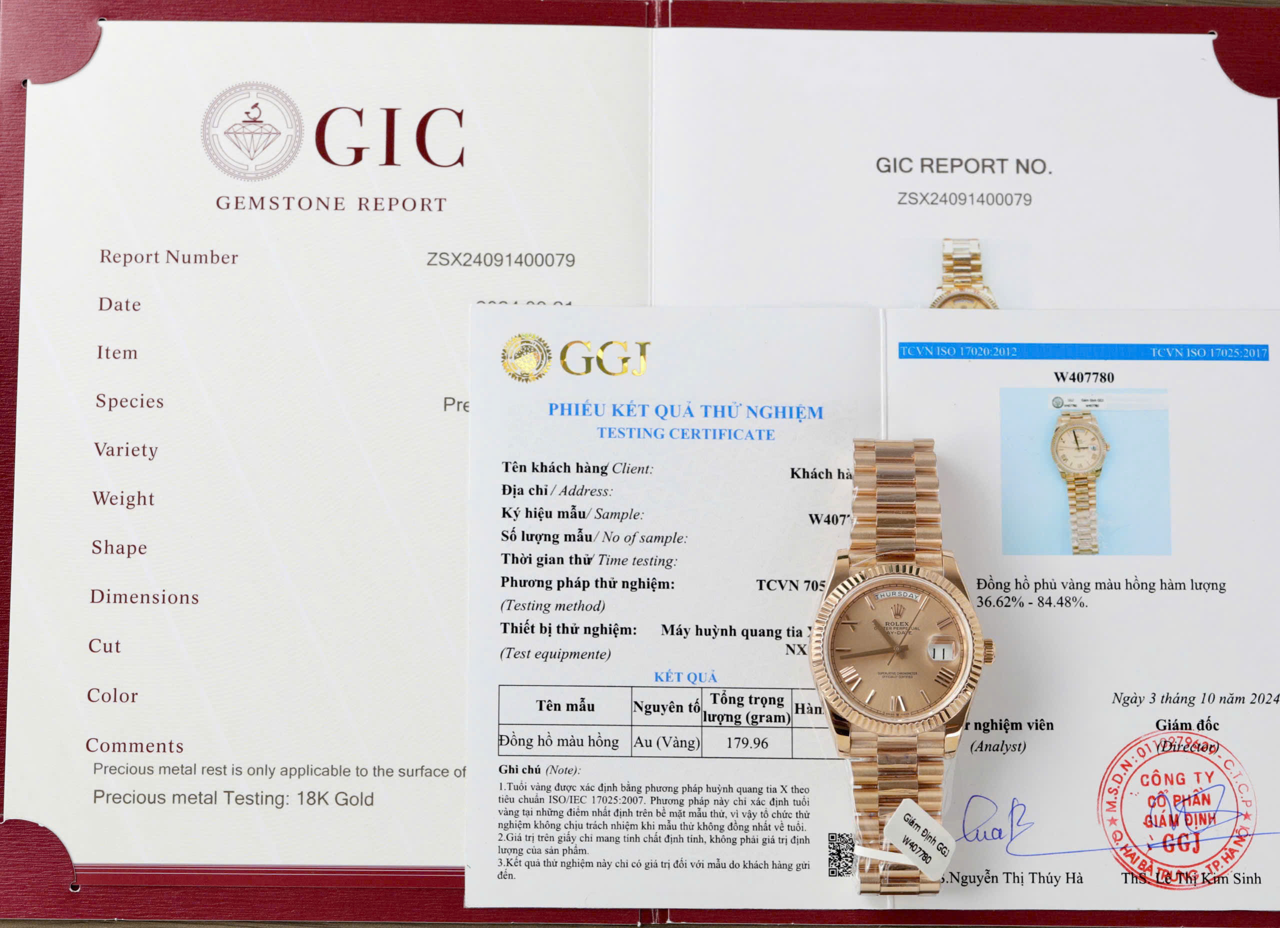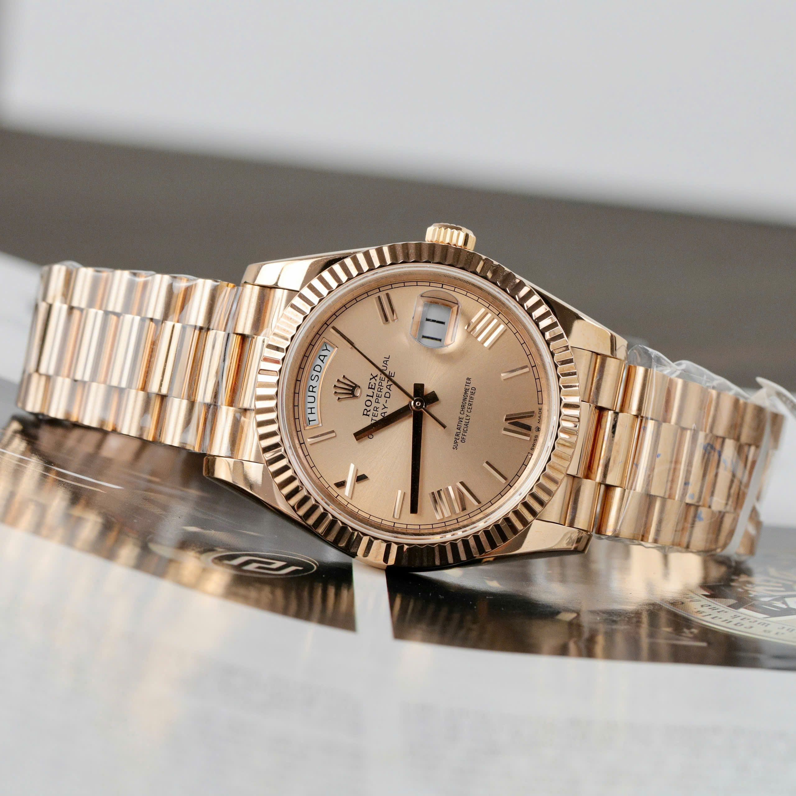 If you are looking for a reliable place to buy a genuine 18K gold watch in Hanoi or Ho Chi Minh City, DWatch Global is sure to meet your expectations. All of the Rep 11 gold-plated watches at DWatch Global are crafted in Hong Kong workshops, delivering the most flawless products. Each piece comes with a full certification of gold content from reputable jewelry and gemstone testing units in Vietnam. A high-end replica like the Rolex Day-Date Replica 11 Watch Pink Dial Gold Wrapped GM Factory, will undoubtedly make you appear more elegant and captivating. Additionally, we offer an after-sales warranty policy and lifetime customer support.