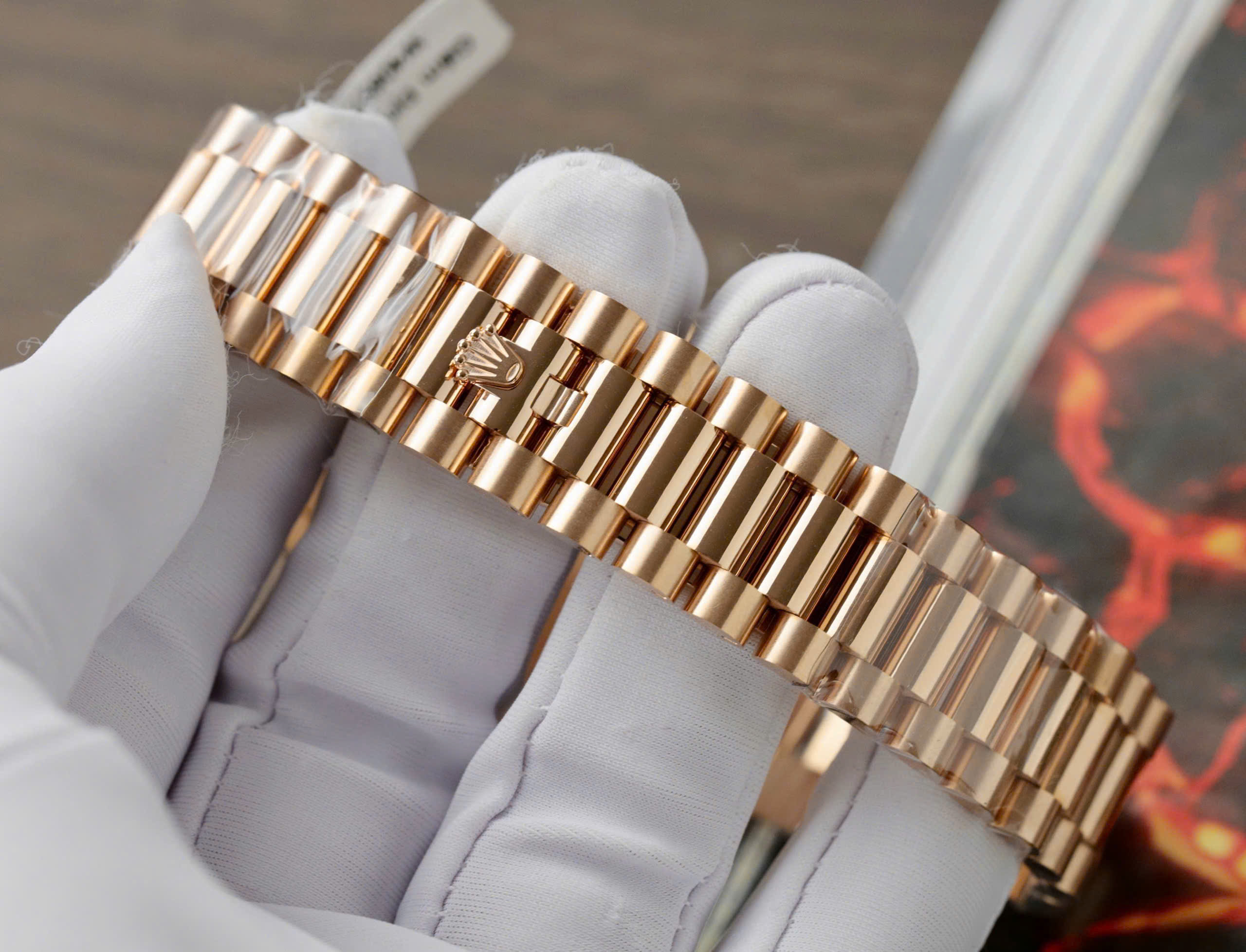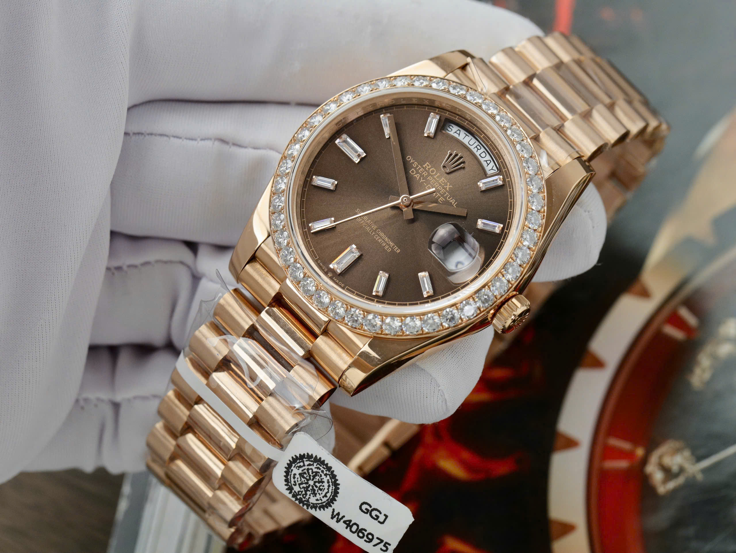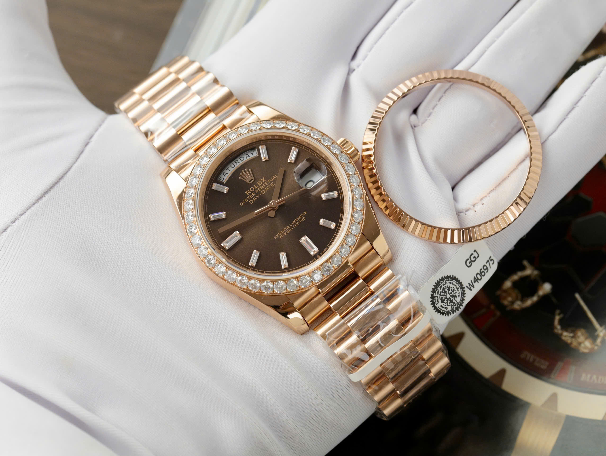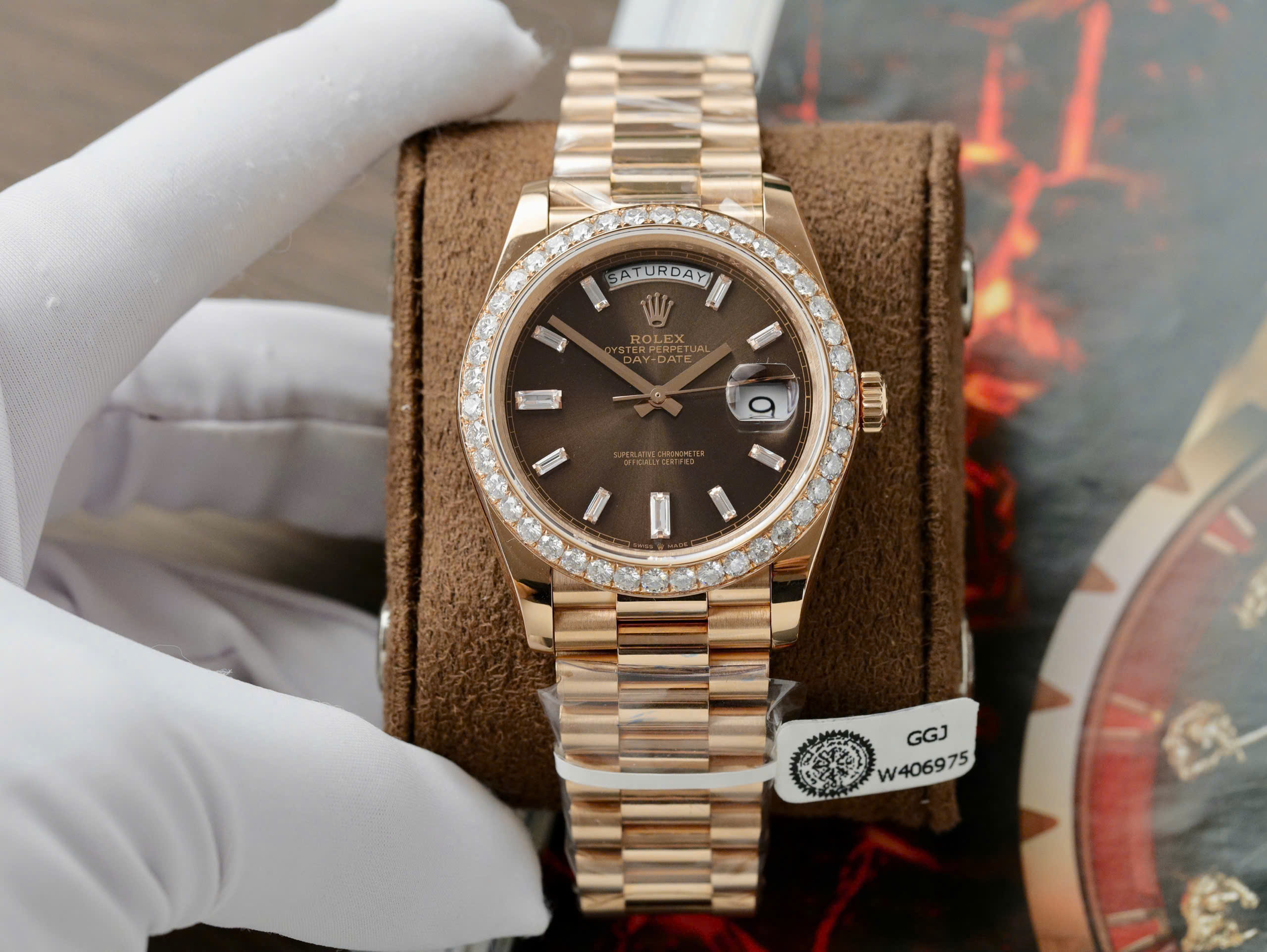 Rolex Day-Date Replica Watch Gold Wrapped Moissanite Diamonds Chocolate Dial GMF is available at DWatch Global.