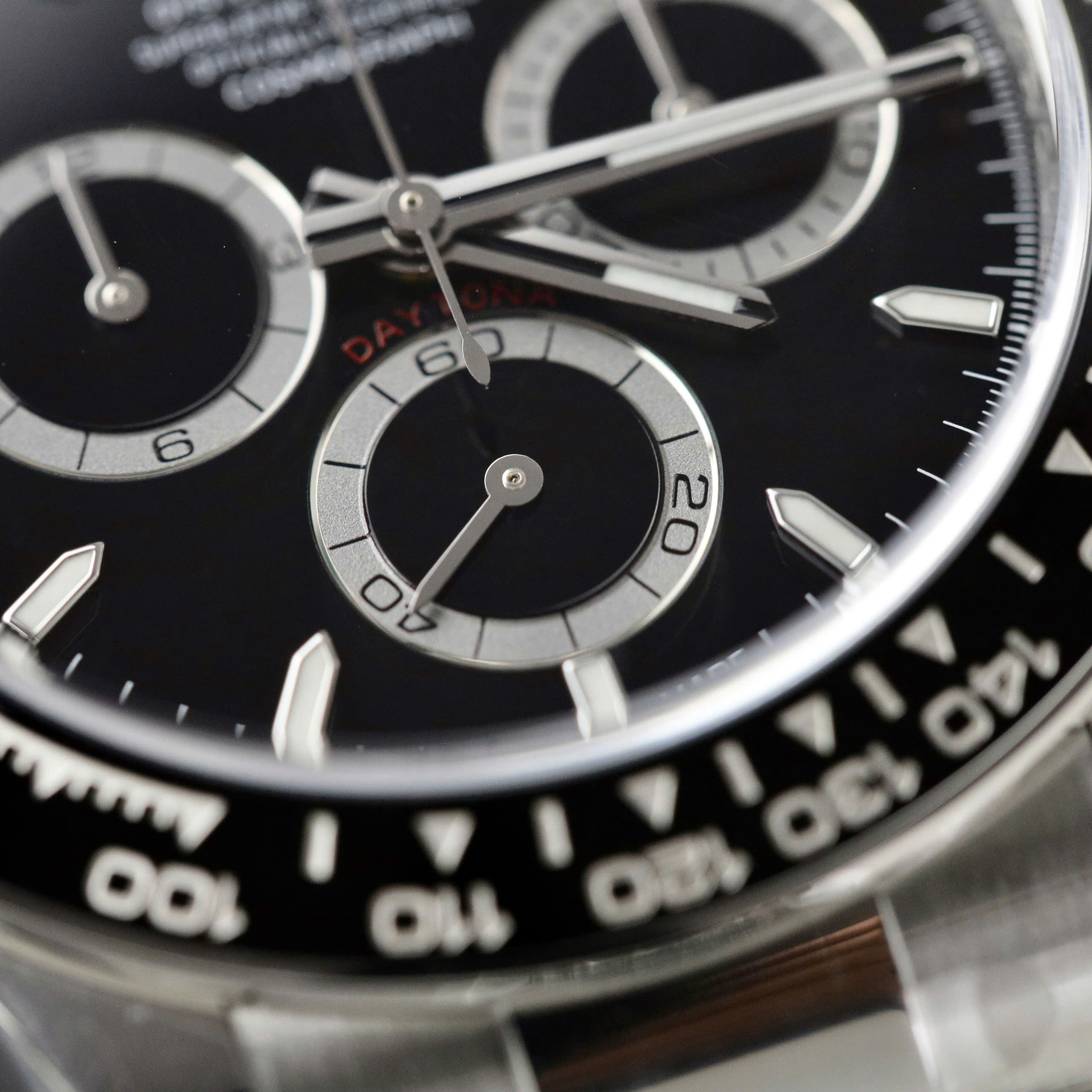Other aspects: The chronograph hour markers, the luminescent material, are also well-crafted. Note: It has been mentioned above about the changes after 4131, the shape of the hour markers has changed to cylindrical, but in the four real models provided by Clean, we have detected some issues, for example, the roundness of the chronograph hour markers, the hour markers still use the old cylindrical ones, so Rolex may be trying to clear out their 4130 inventory.