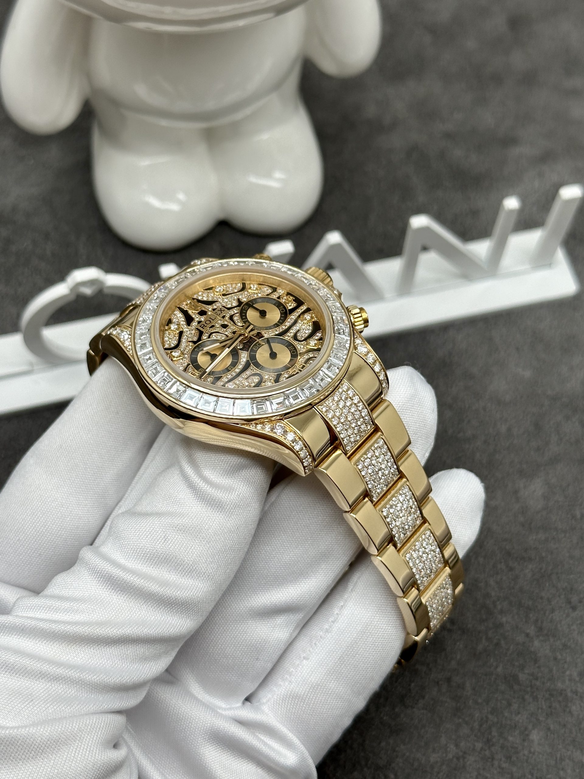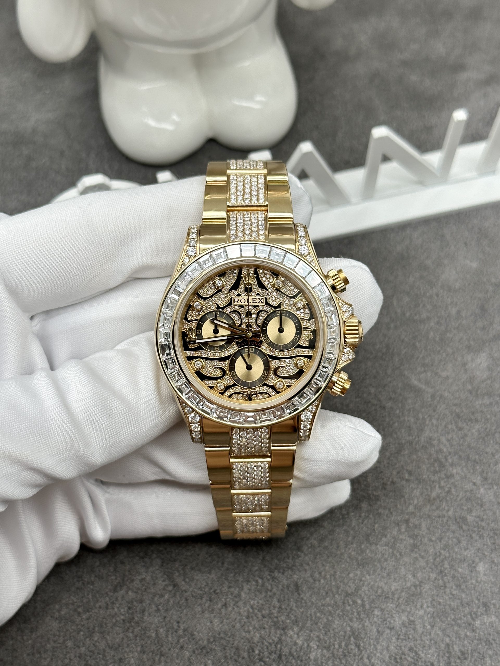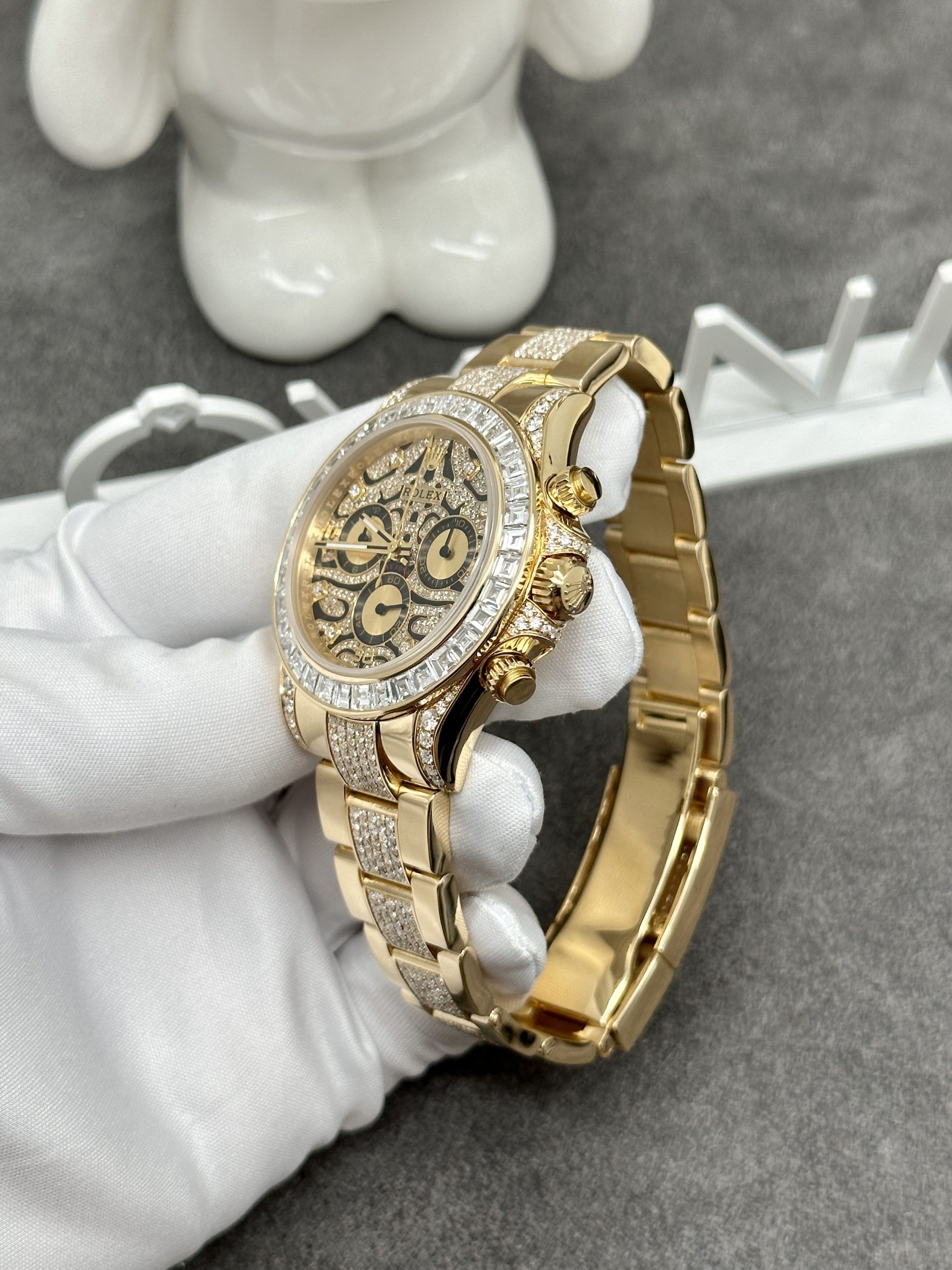 The most striking feature of the Rolex Cosmograph Daytona Eye of the Tiger is its unique, unmistakable dial. Inspired by the tiger’s stripes, the dial combines striking black and gold hues. Beneath the high-quality anti-reflective sapphire crystal, the gold-striped layers are adorned with tiny diamonds, enhancing its sparkle. The black lacquer is symmetrically and intricately designed, creating a visually pleasing harmony.