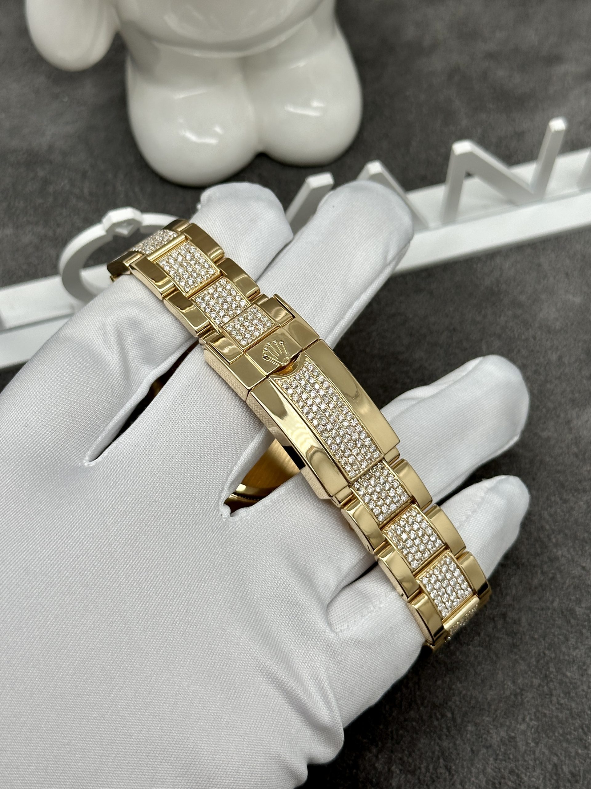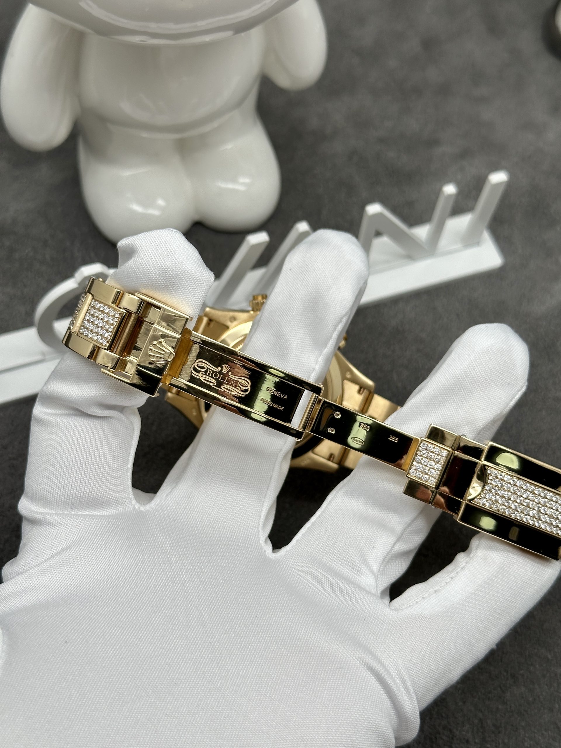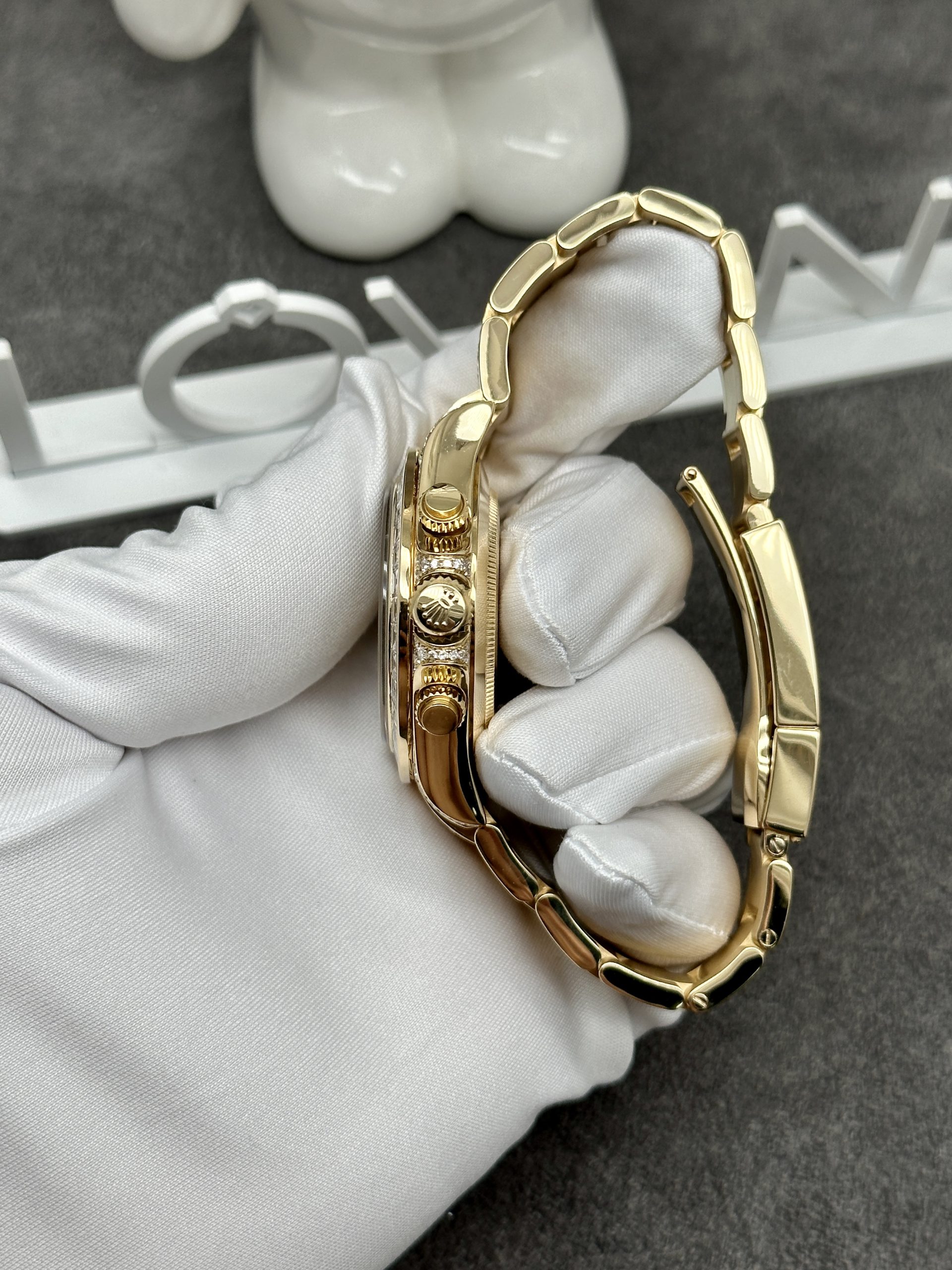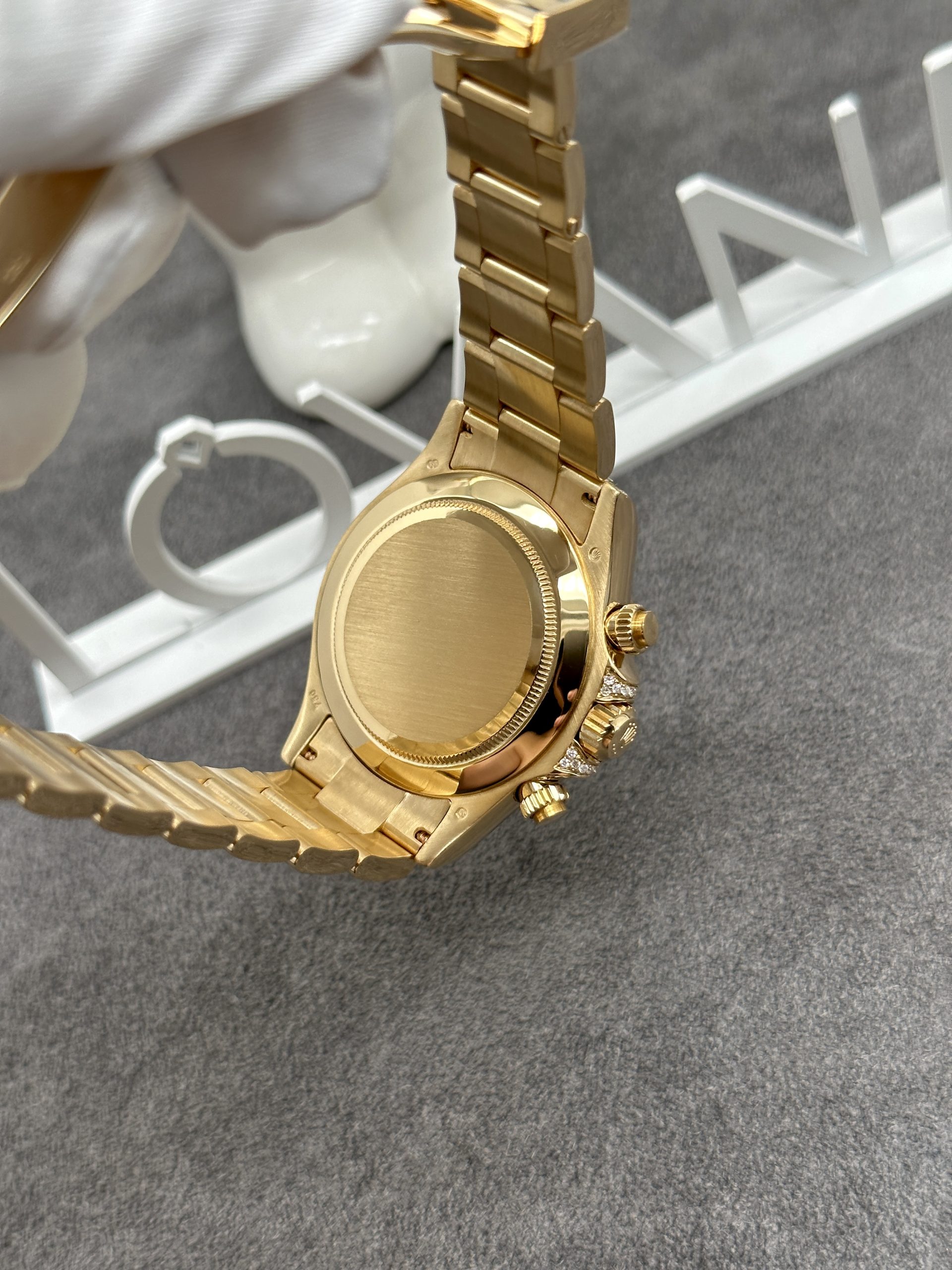 The most striking feature of the Rolex Cosmograph Daytona Eye of the Tiger is its unique, unmistakable dial. Inspired by the tiger’s stripes, the dial combines striking black and gold hues. Beneath the high-quality anti-reflective sapphire crystal, the gold-striped layers are adorned with tiny diamonds, enhancing its sparkle. The black lacquer is symmetrically and intricately designed, creating a visually pleasing harmony.
