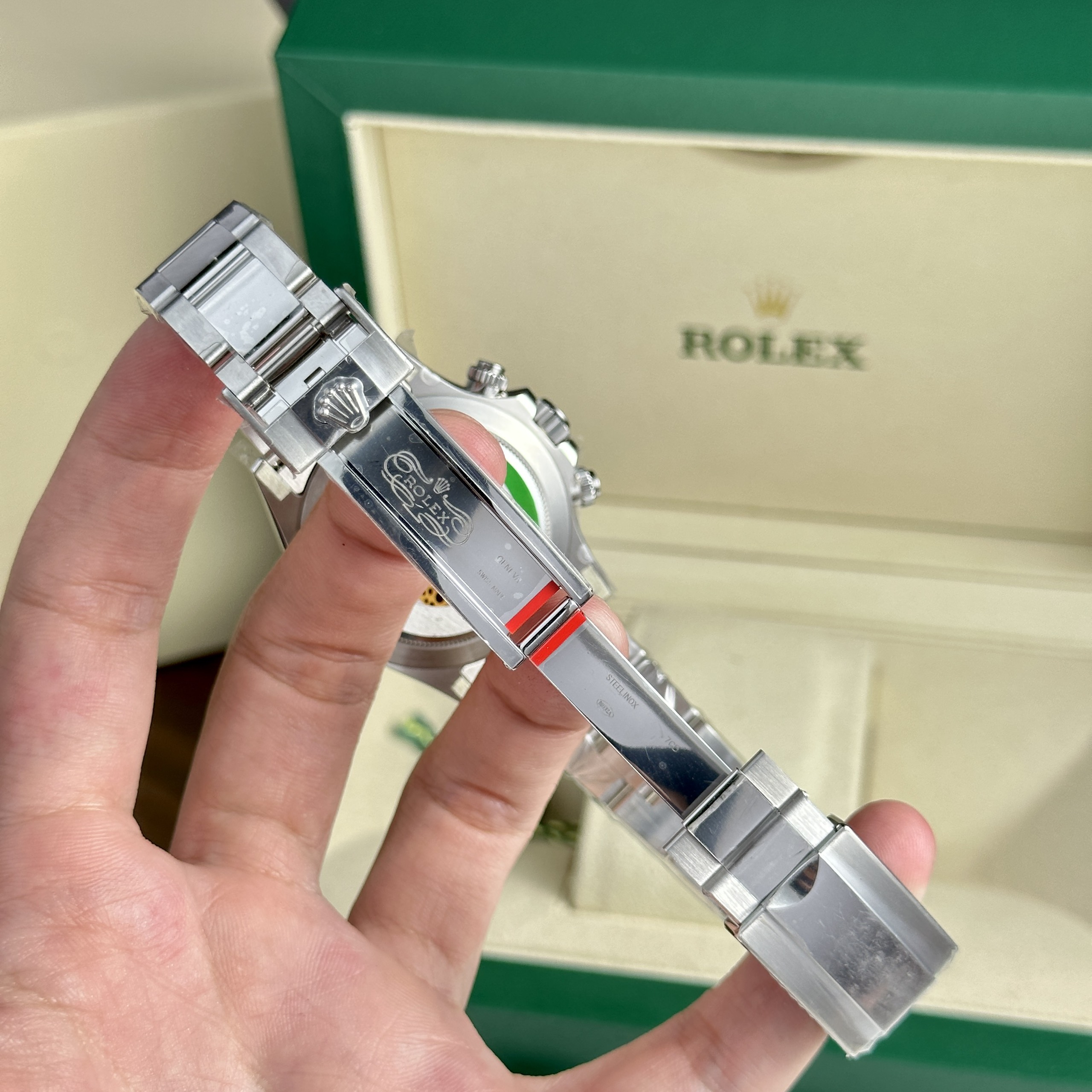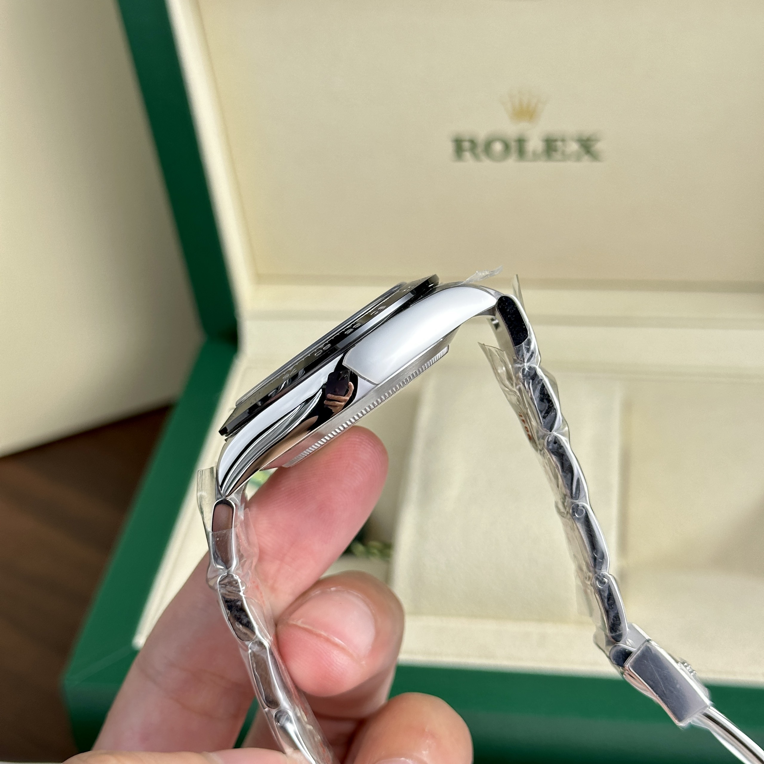 The watch is powered by the automatic 4130 movement, providing precise operation for 72 hours. The 904L steel, more resistant to rust and corrosion, is intricately crafted, enhancing the watch’s elegance and prestige.
