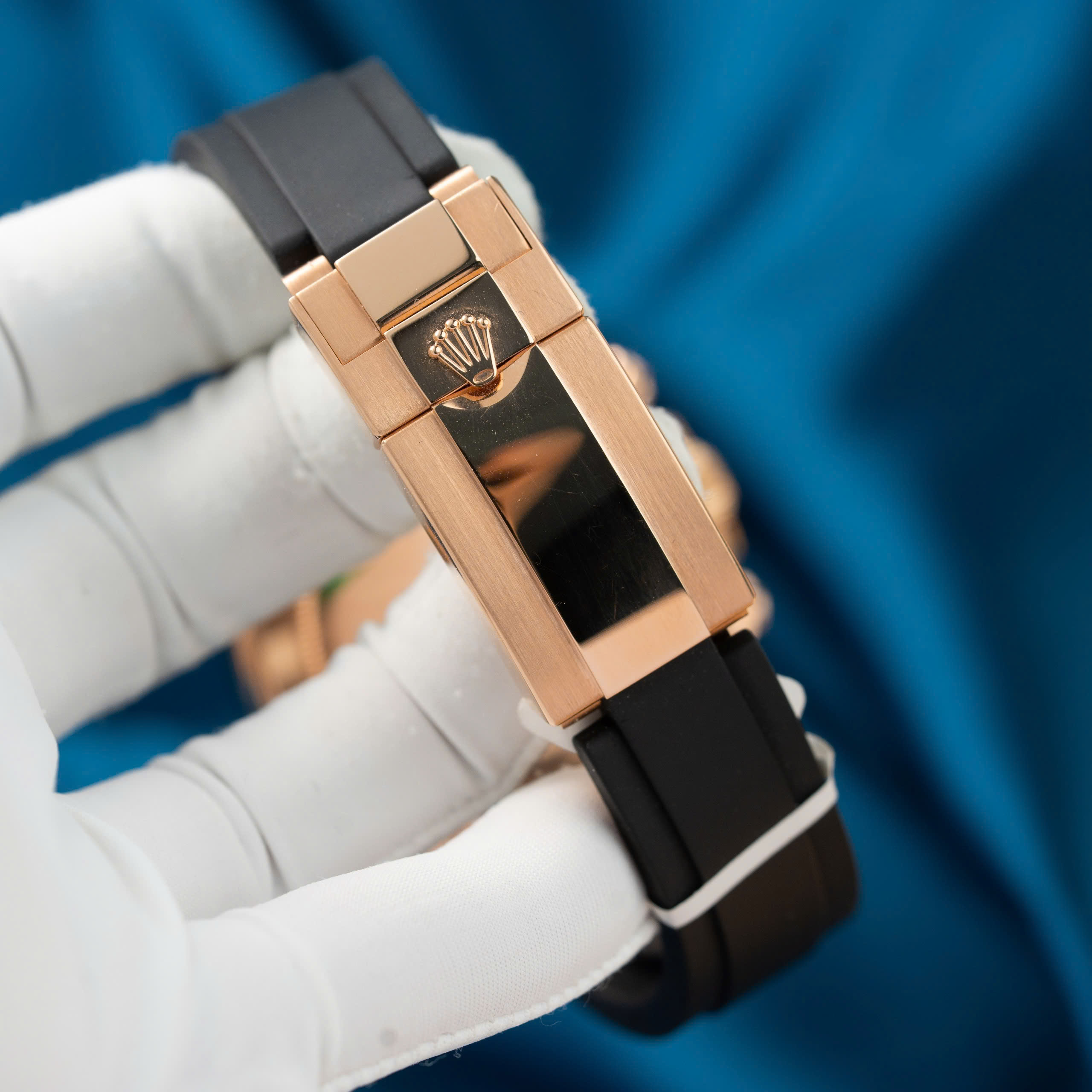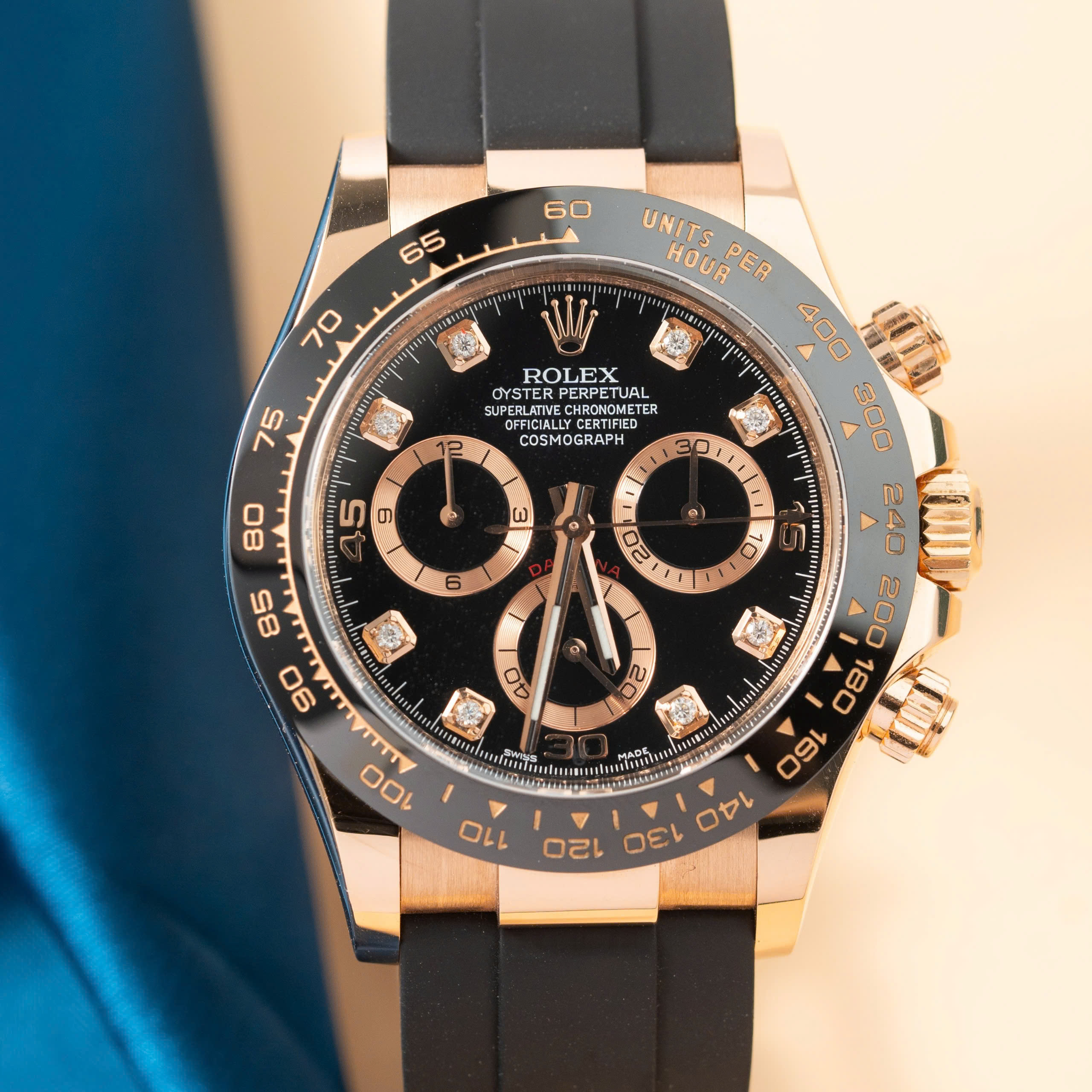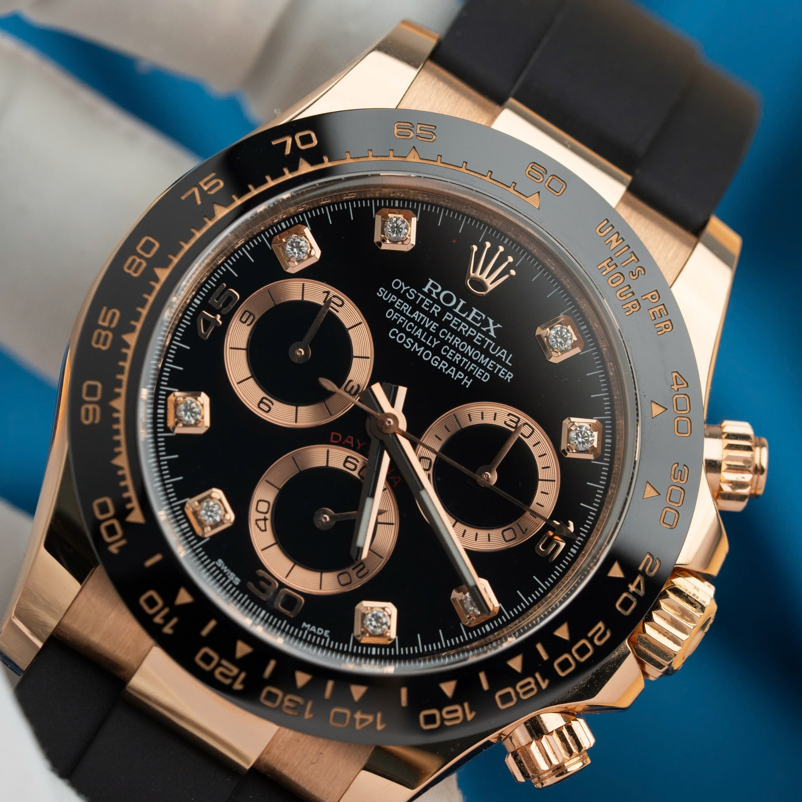 The Rolex Daytona Replica Watch Custom 18K Solid Gold & Natural Diamond, available at DWatch Global, is crafted from 18k rose gold and paired with an Oysterflex strap. Its allure comes from the pink dial and ceramic bezel, featuring baguette diamond hour markers, creating a striking aesthetic. The watch includes three sub-dials for the chronograph function: a 12-hour counter at 9 o’clock, a 30-minute counter at 3 o’clock, and a small seconds counter at 6 o’clock.
