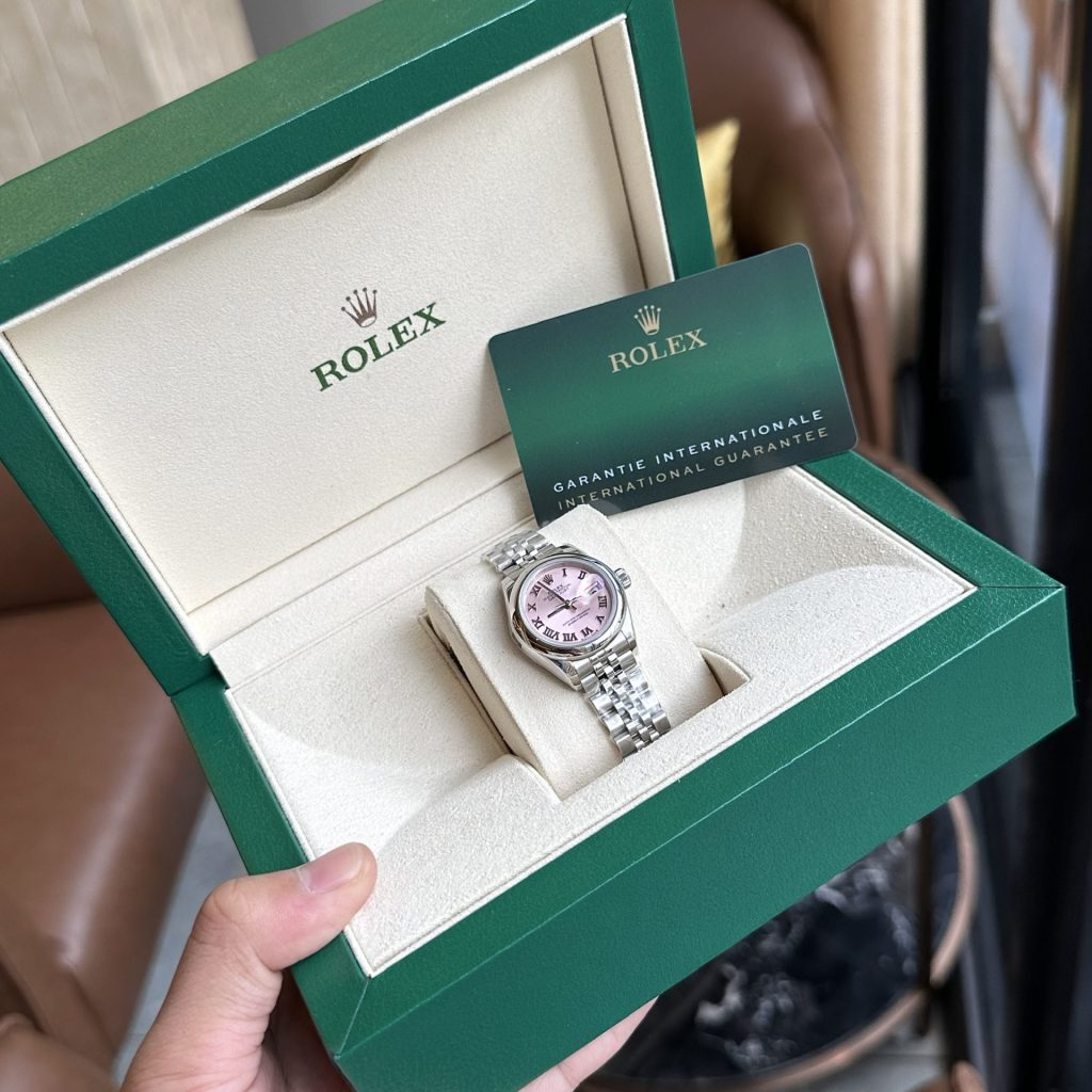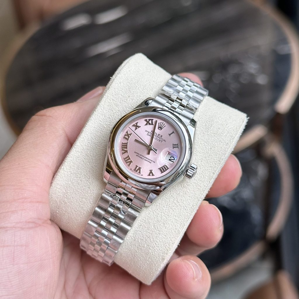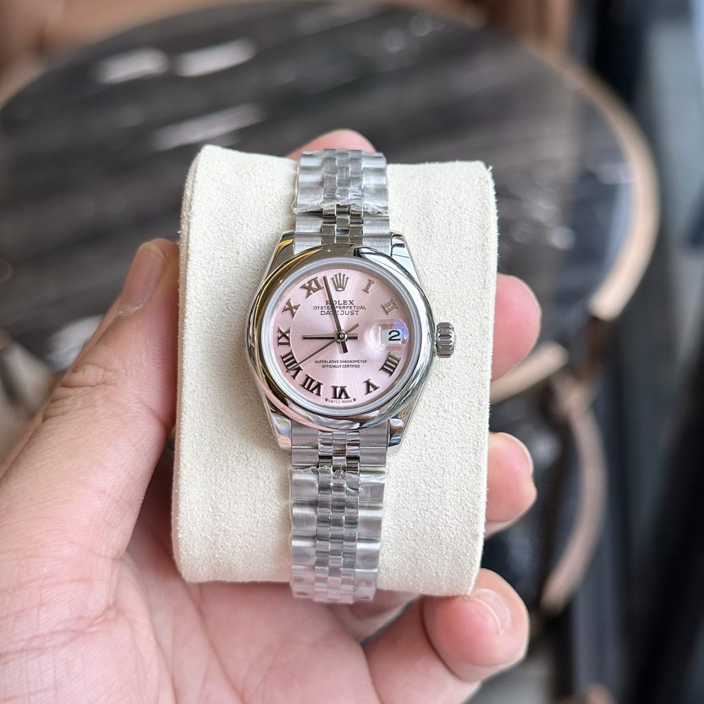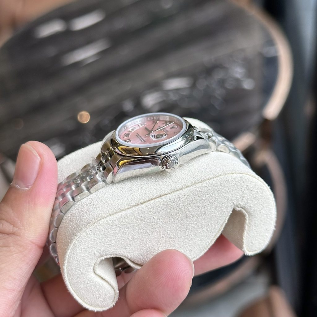 While most fake Rolex watches have similar case structures, the main differences lie in the dial. For the Rolex Lady-Datejust 279160, the dial features a feminine pink color, complemented by beautiful sunray brushing.