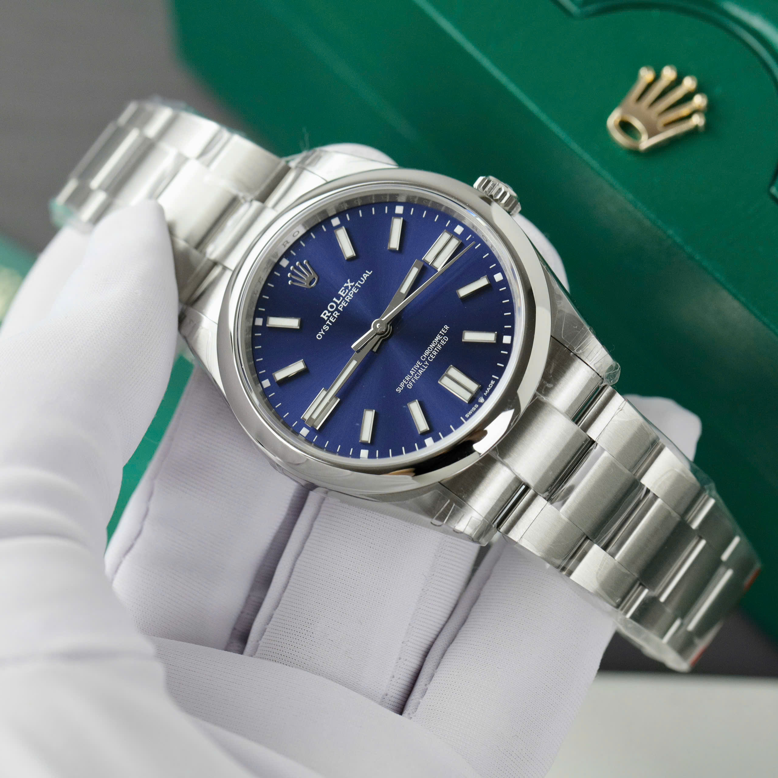 Equipped with hallmark Rolex features, this Oyster Perpetual edition boasts a 100m water-resistant Oyster case, a 41mm diameter, and a self-winding Perpetual movement capable of continuous operation on the wearer’s wrist.