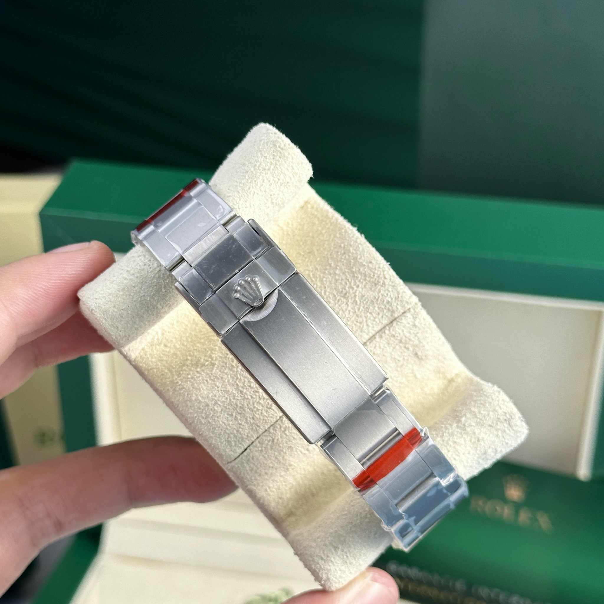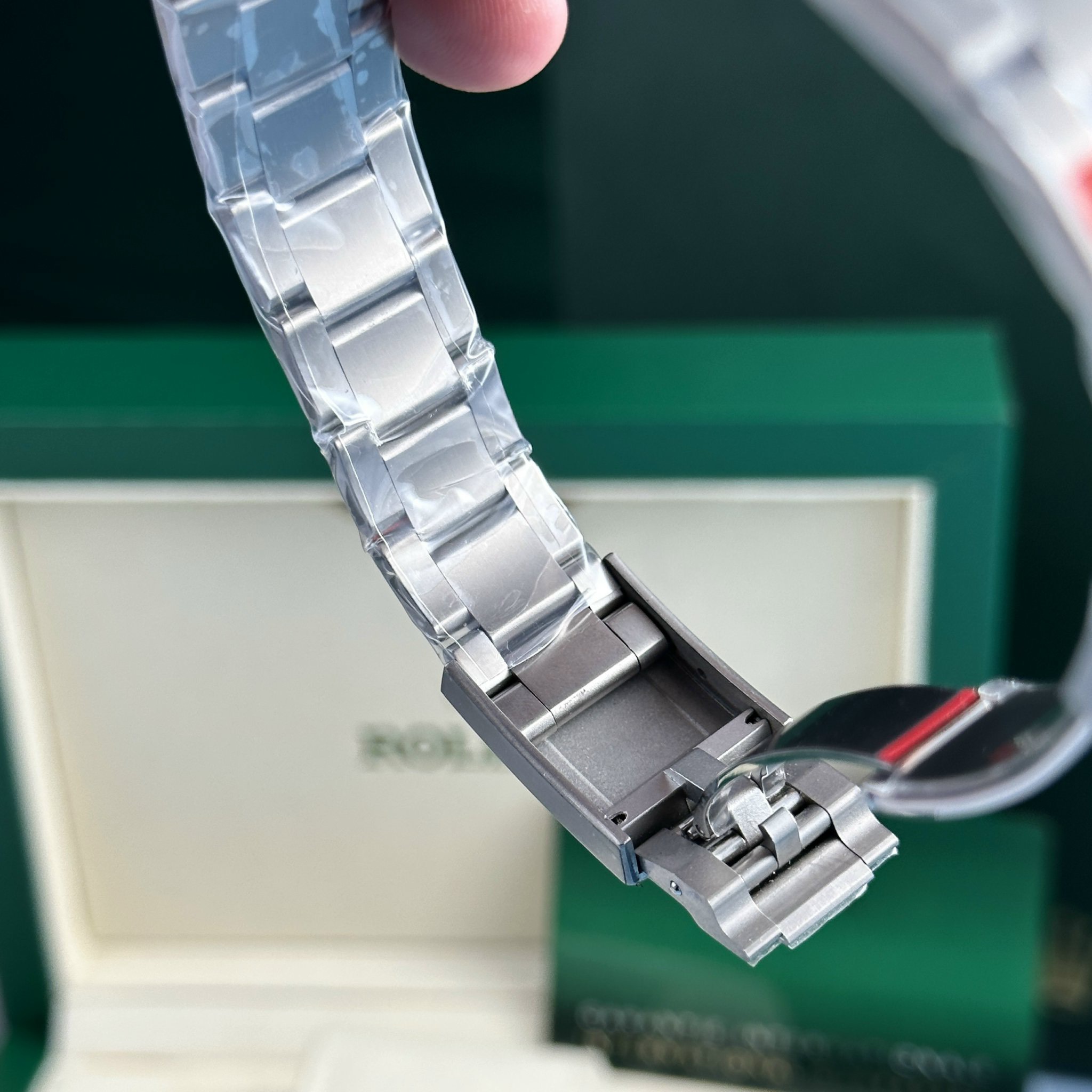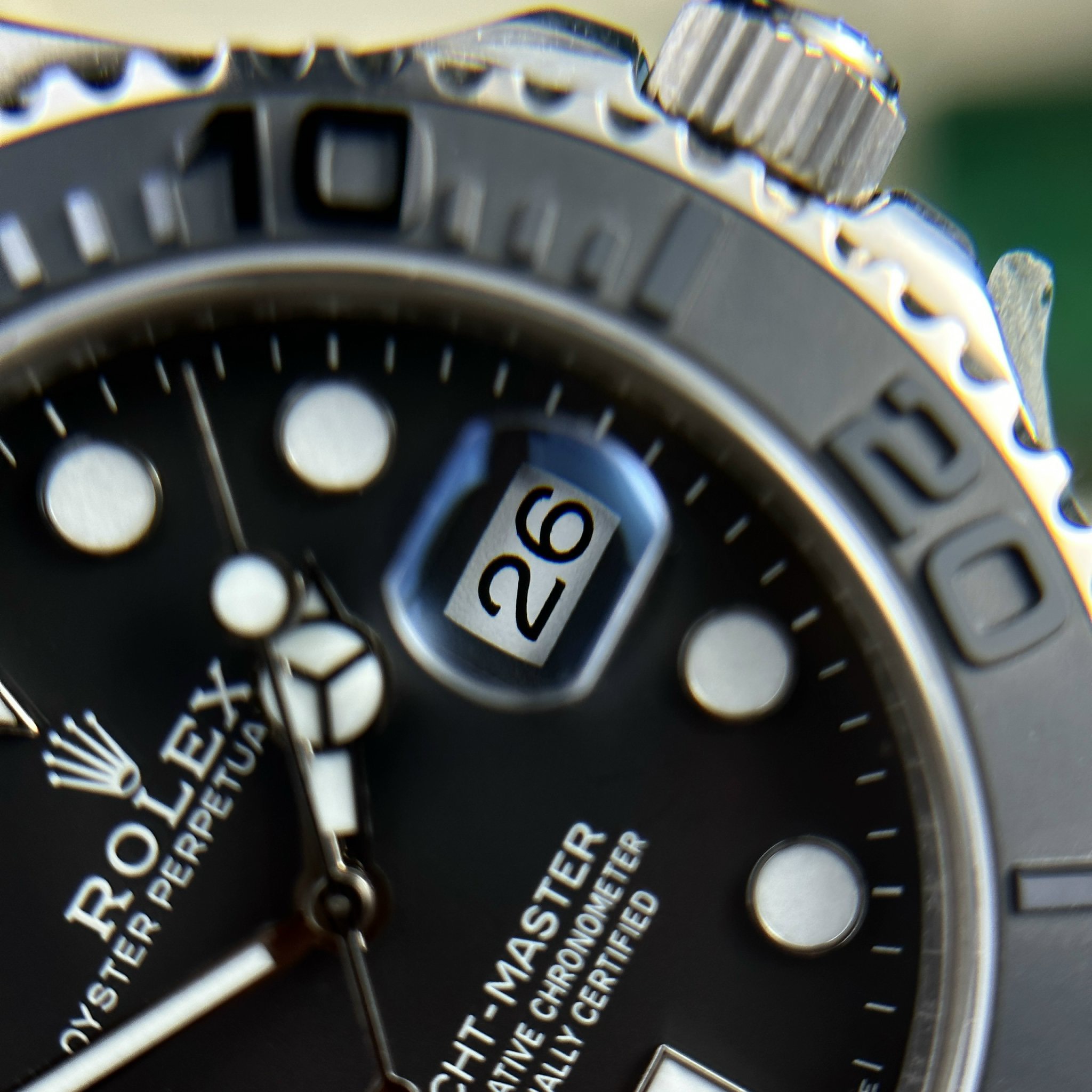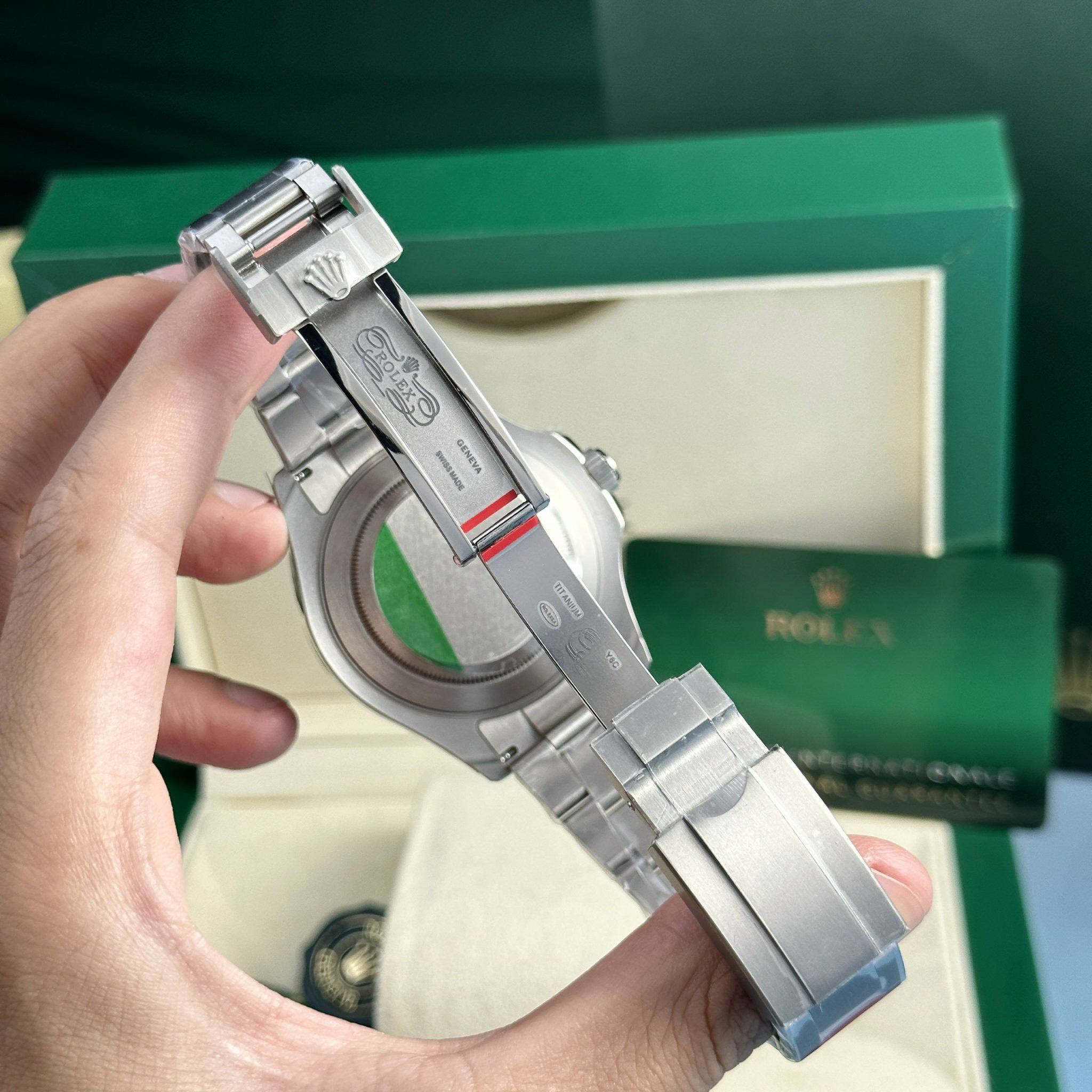 The watch also boasts a signature bidirectional rotating bezel with a matte black Cerachrom insert. The raised numerals and markers enable sailors to easily determine precise times for their maneuvers. The deep black dial of this 1:1 Rolex watch stands out with large hour markers and hands coated in luminescent material, ensuring readability in low light conditions.