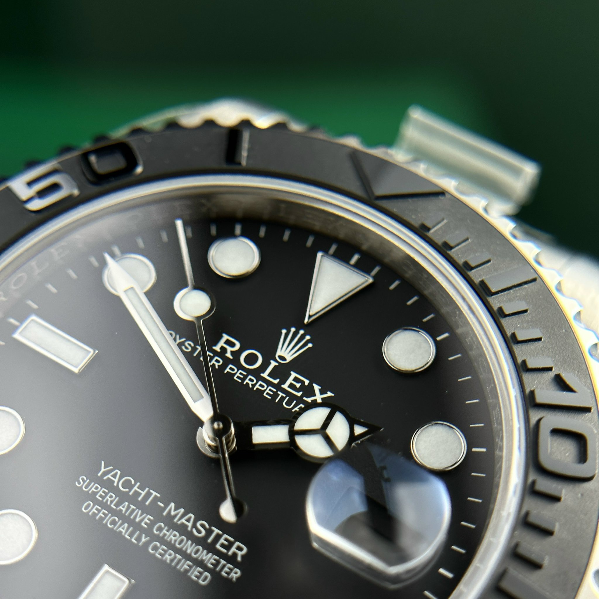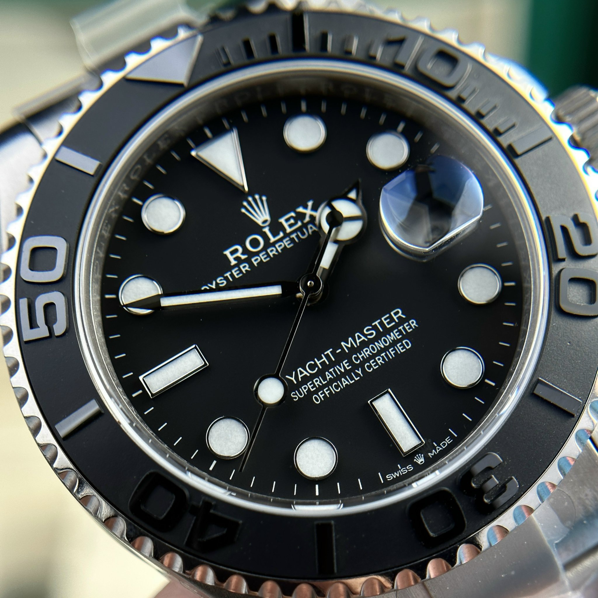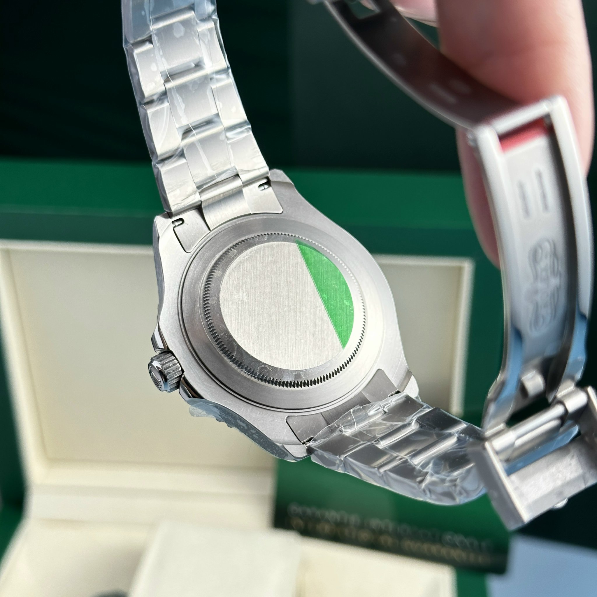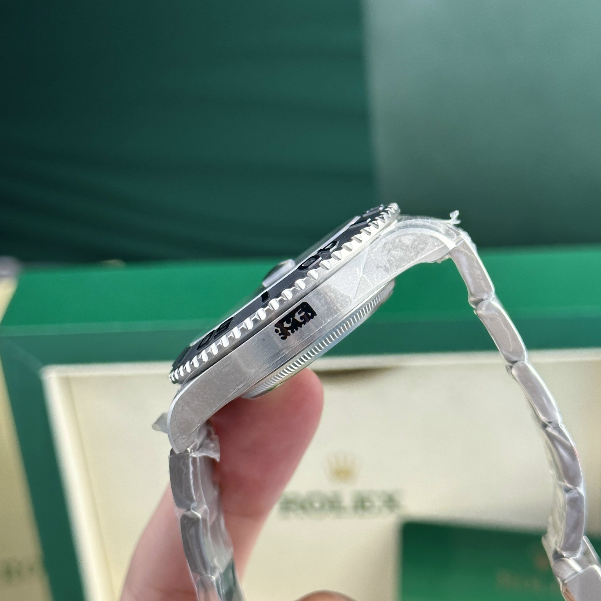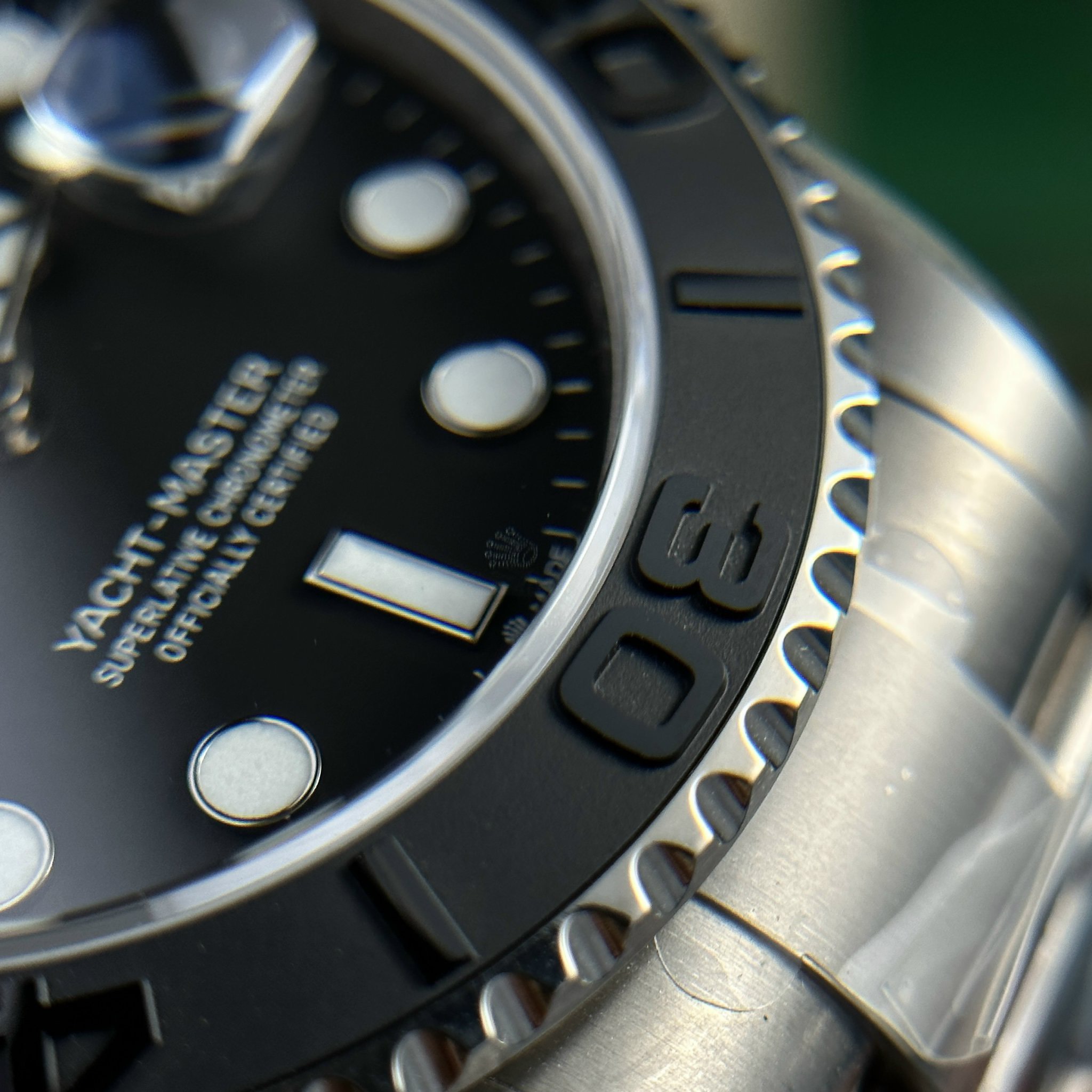 The watch also boasts a signature bidirectional rotating bezel with a matte black Cerachrom insert. The raised numerals and markers enable sailors to easily determine precise times for their maneuvers. The deep black dial of this 1:1 Rolex watch stands out with large hour markers and hands coated in luminescent material, ensuring readability in low light conditions.