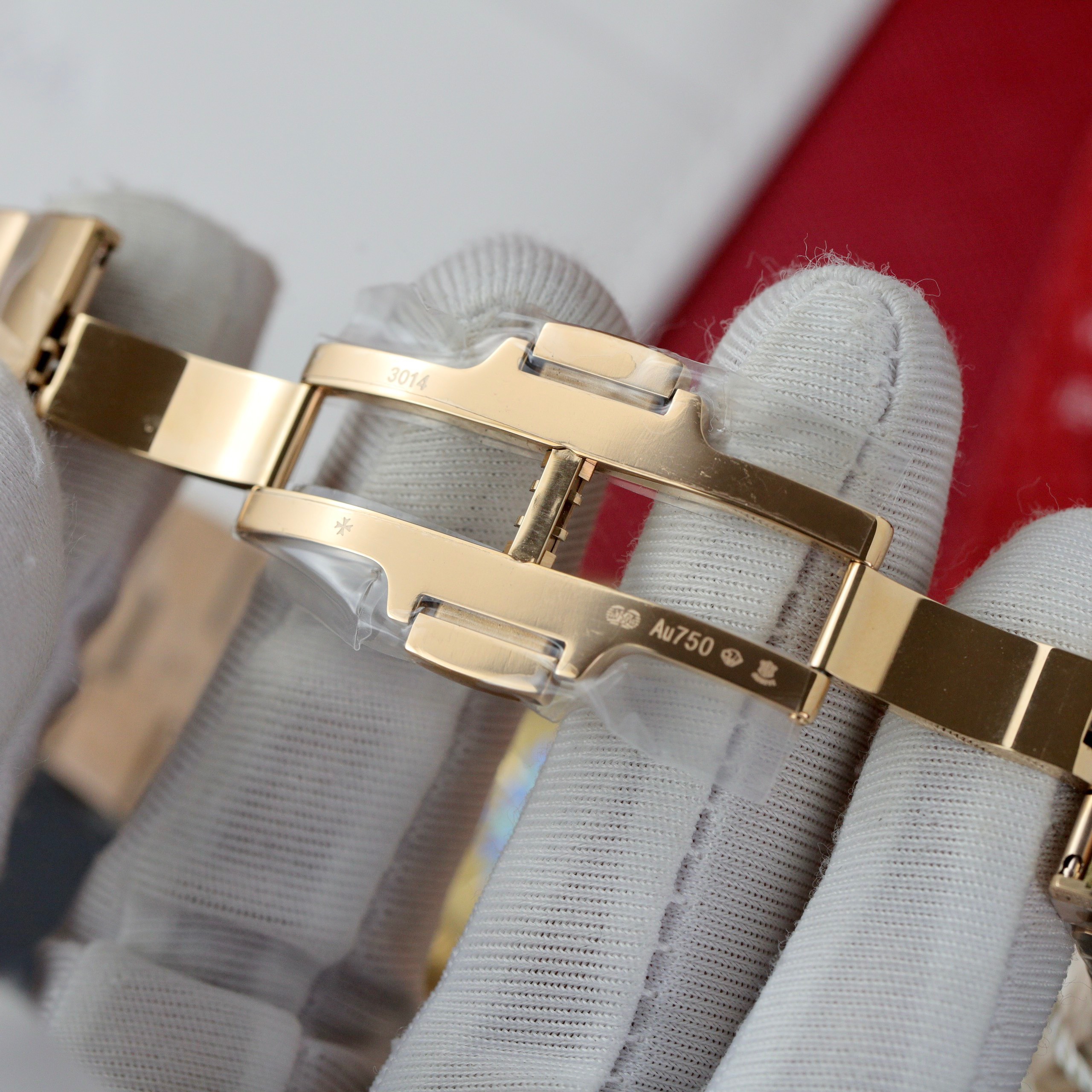 The bezel, crafted from 18K rose gold, serves as a noteworthy highlight, exuding depth and sophistication. The watch face, in its Replication version, adorned with a mesmerizing shade of navy blue, complements the luxurious gold-toned hands and indices perfectly. The strap, crafted from 18K rose gold-plated steel, seamlessly integrates with the case, enhancing the classical beauty and sophistication of the product.